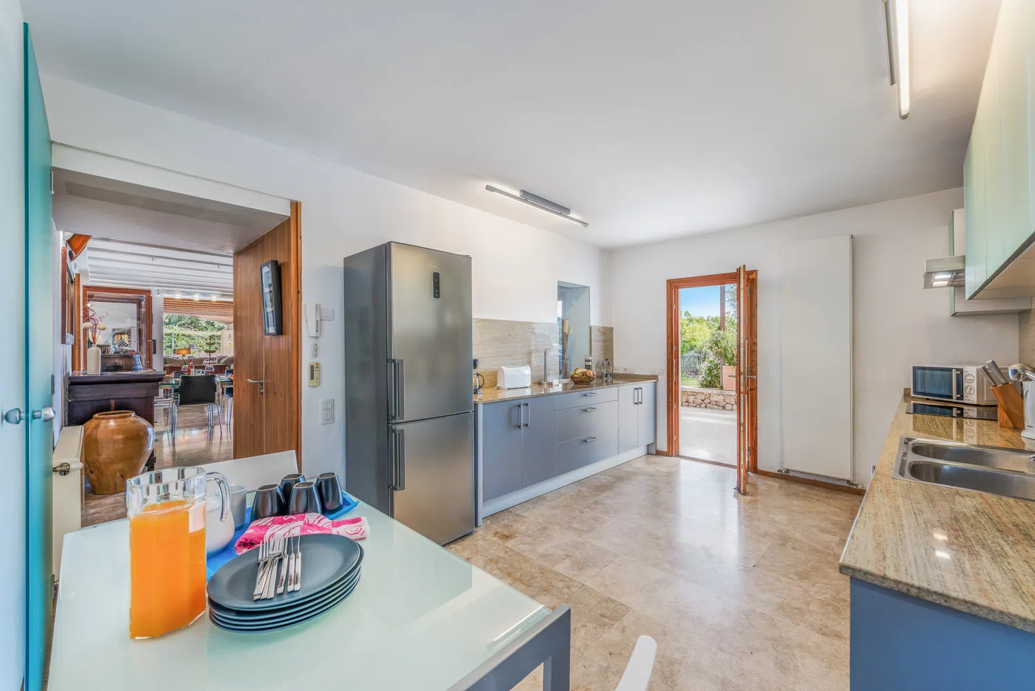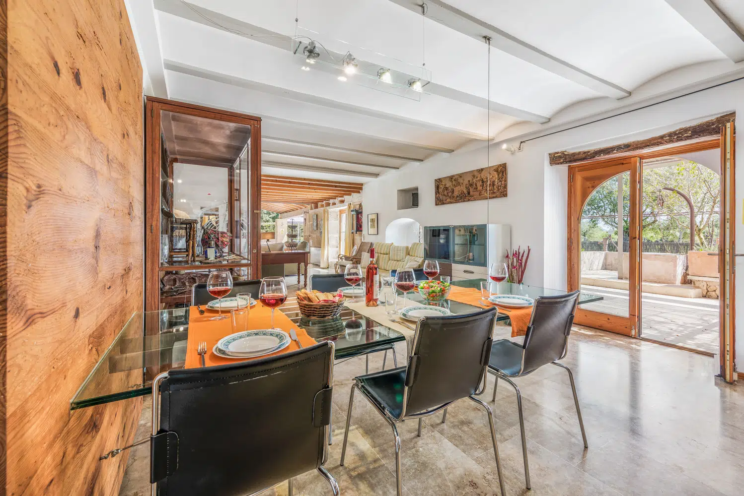 Consta con un amplio salón comedor muy luminoso con decoración mallorquina y detalles modernos que la diferencian. Desde el comedor también se puede acceder a la zona de la terraza piscina donde se podrá disfrutar de una amplia zona de sombra. En la parte de atrás del comedor y la escalera se encuentra la moderna cocina independiente que ésta totalmente equipada, una despensa y una coladuria completan la planta baja de la propiedad.