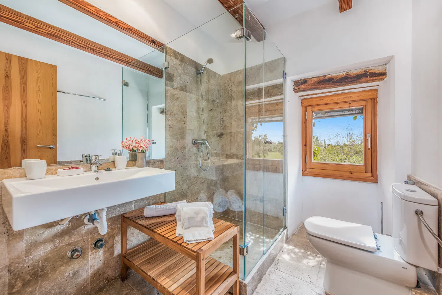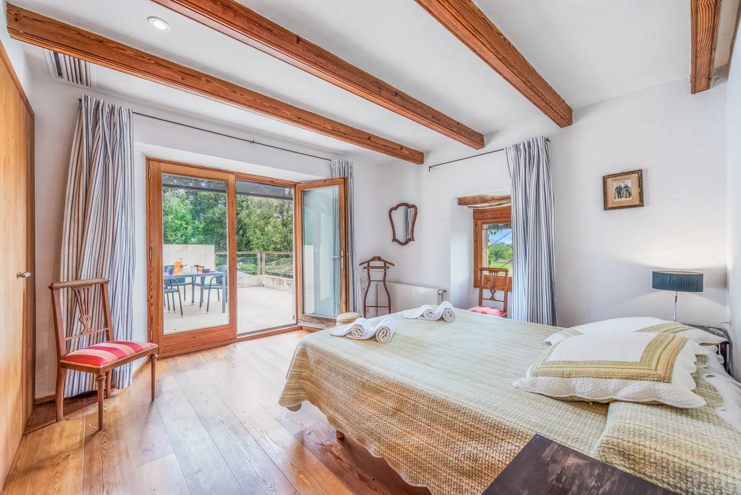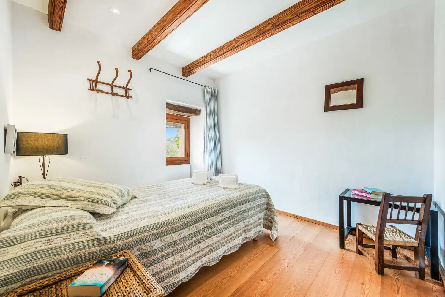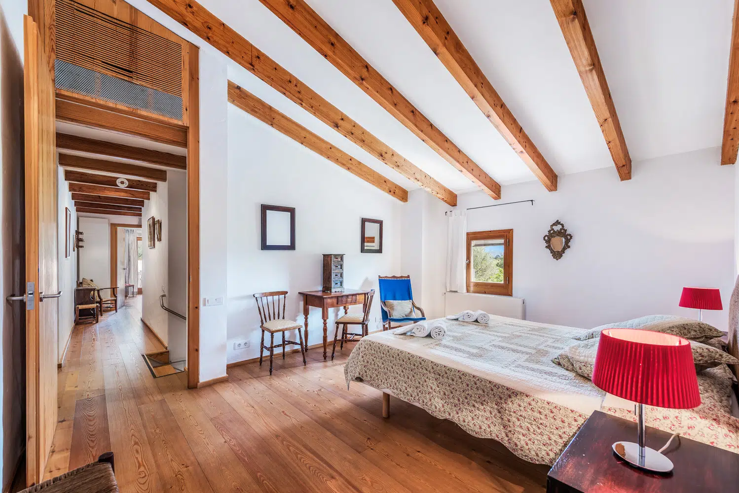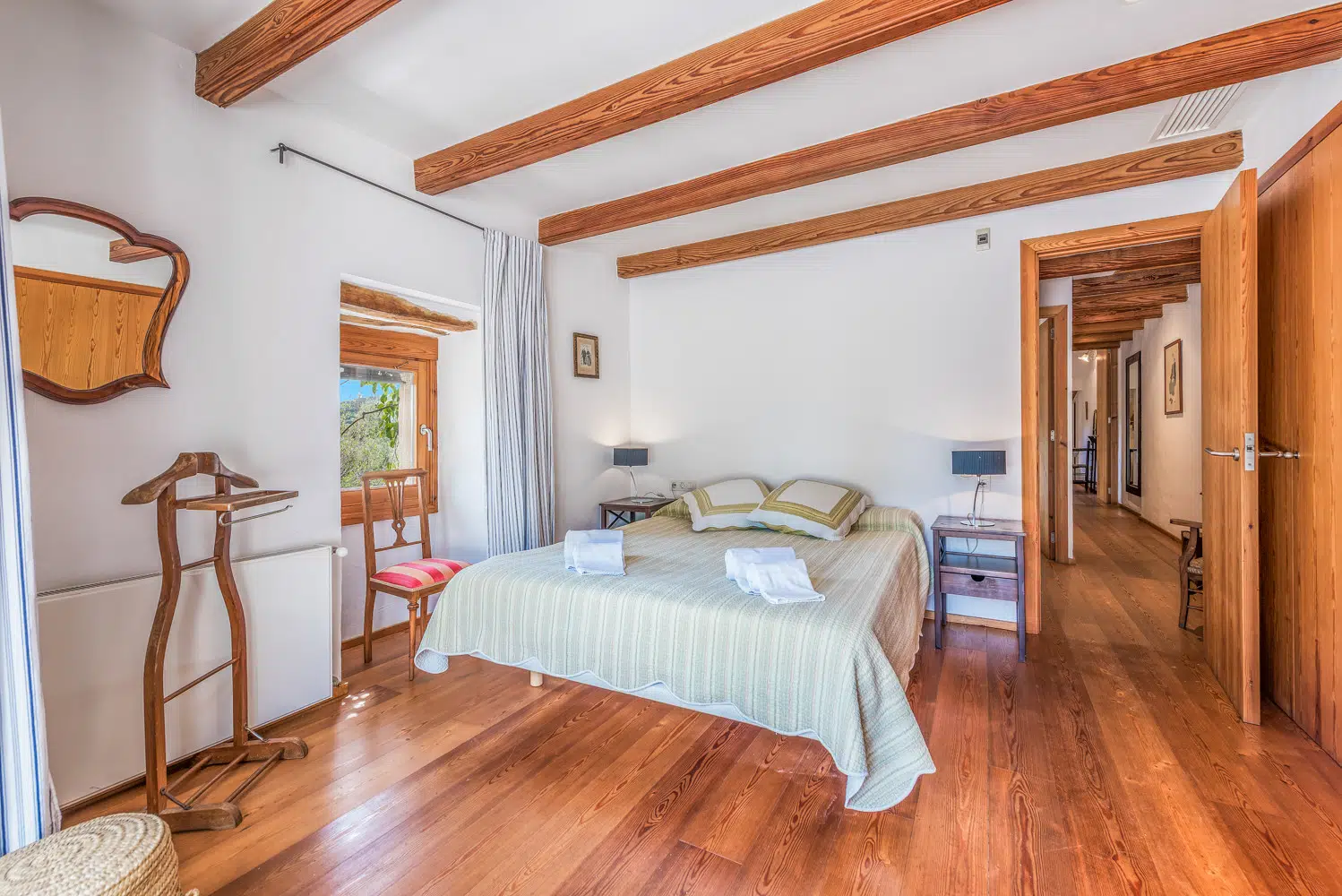 Una escalera de madera nos da acceso a la zona de las habitaciones, todas estan con suelo de madera y constan de un dormitorio de matrimonio con baño en suite y con acceso a una terraza balcón la cual tiene unas preciosas vistas hacia el valle de la Cala Sant Vicenç. Ademas consta de un dormitorio doble y un dormitorio individual. Otro baño con ducha comparte esta zona de la vivienda. Todas las habitaciones están dotadas de aparatos de aire acondicionado con horario restringido.