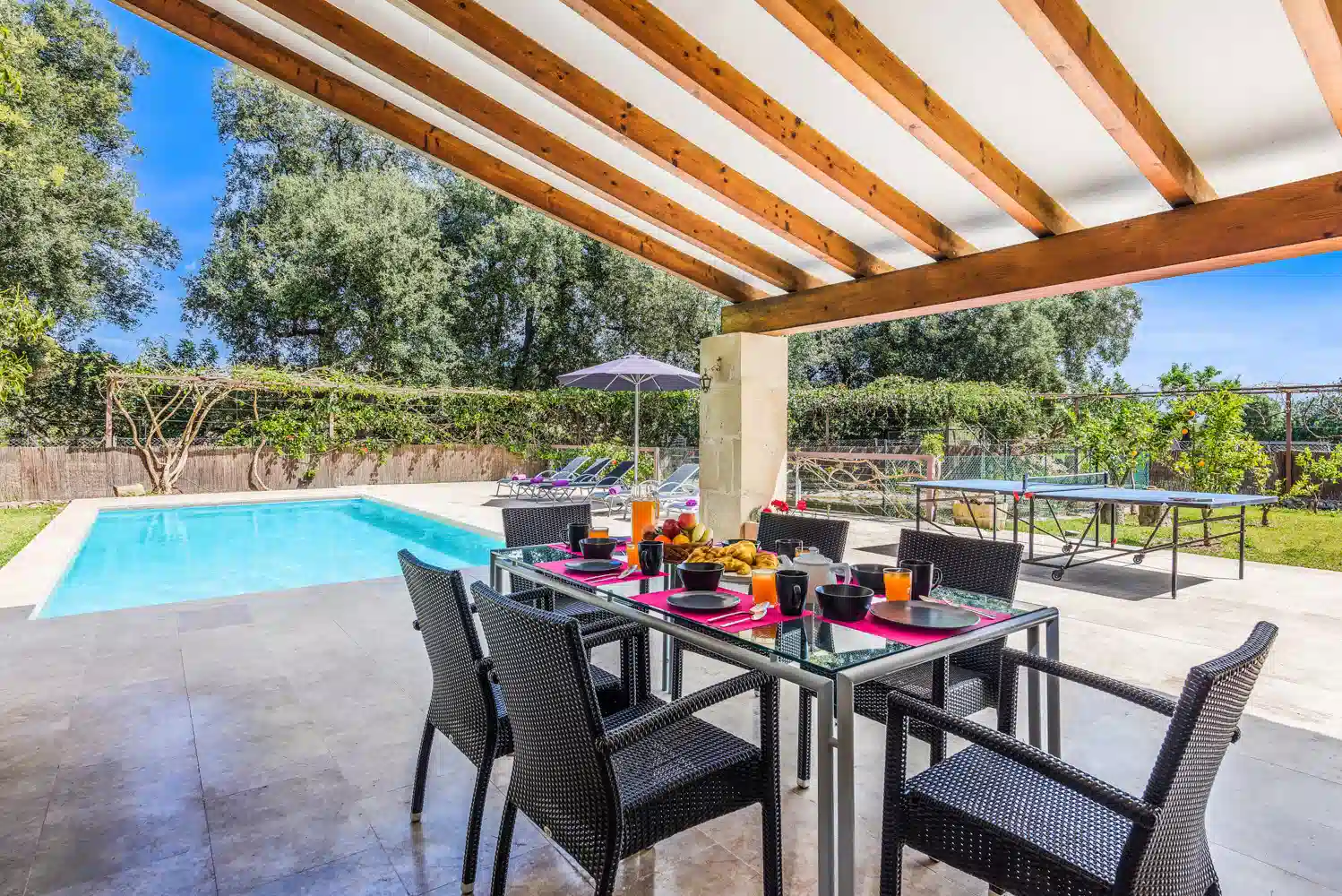 Amplia y moderna piscina exterior de 8x4mts que da un toque único al exterior de la villa. Ademas el jardín consta de una generosa zona con césped. El porche con barbacoa exterior es realmente amplio y perfecto para disfrutar de comidas y cenas con amigos y familiares. La mesa de ping Pong será un buen punto de encuentro.