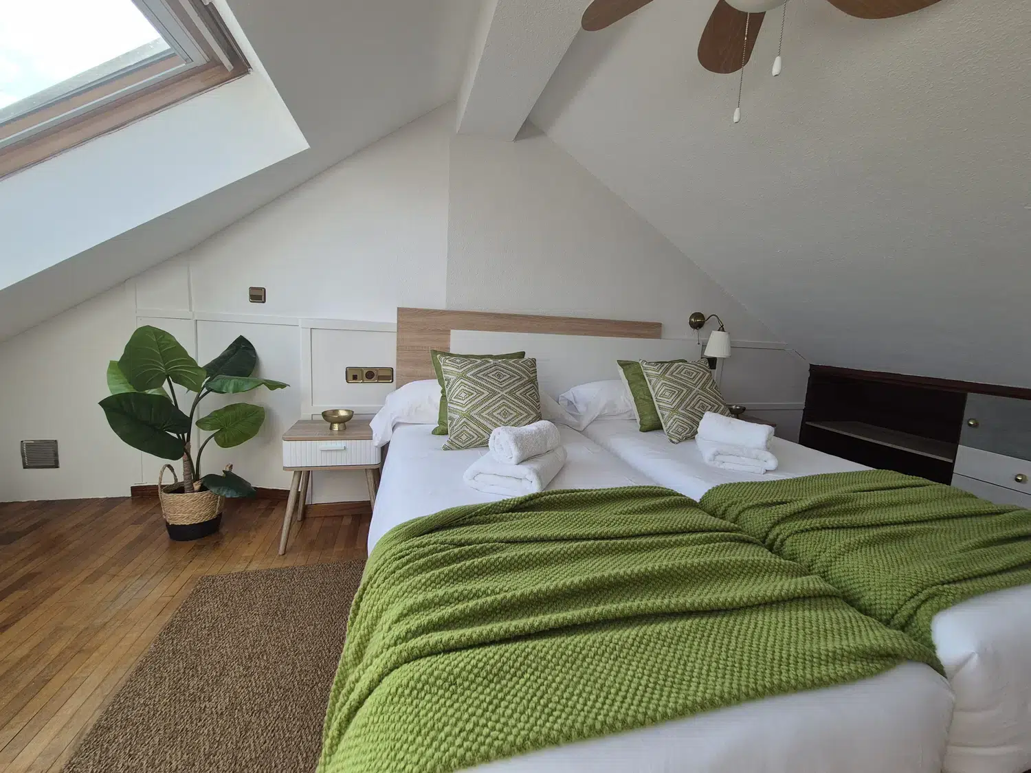 En la planta baja: 2 dormitorios con camas de 135 y 150 cm, y 2 baños completos (uno en suite). En la segunda planta: amplio salón cocina totalmente equipada y baño adicional. La tercera planta, bajo cubierta, dispone de un dormitorio con 2 camas individuales de 80 cm. Espacios cómodos, luminosos y con todo lo necesario para tu estancia.