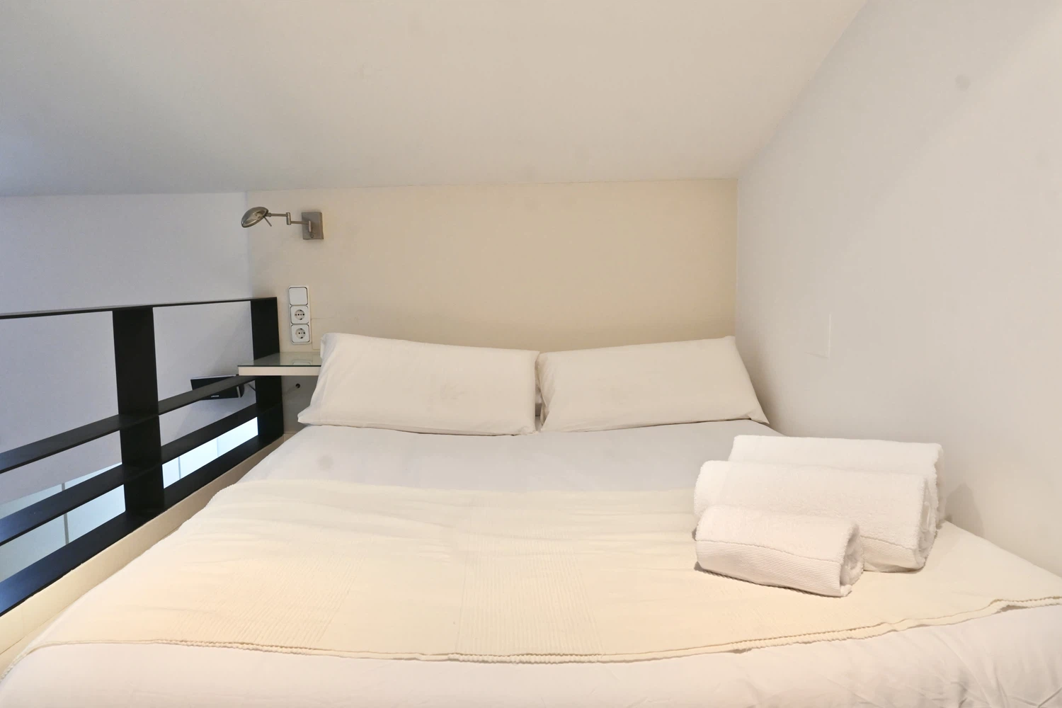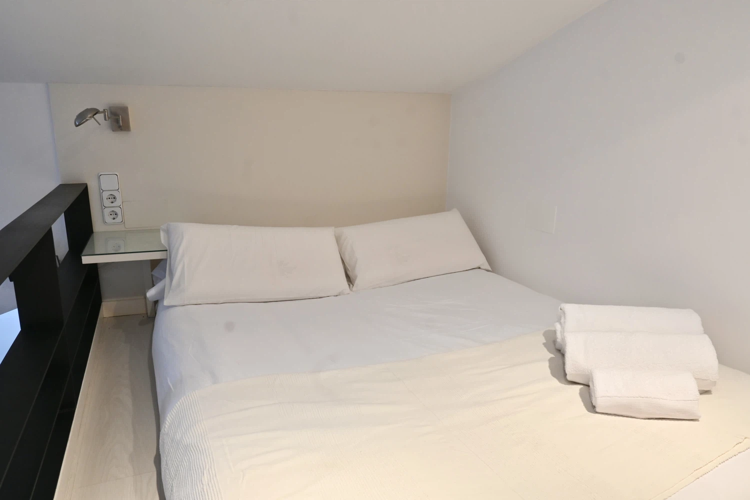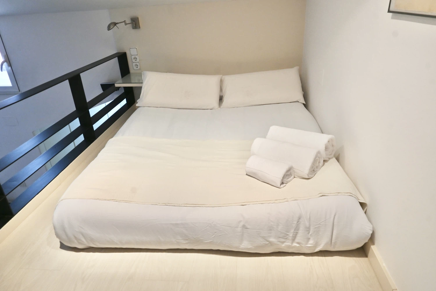 Dormitorio en Mezanine: El dormitorio se encuentra en un acogedor entrepiso (mezanine), lo que proporciona un toque único y contemporáneo al espacio. La cama matrimonial está colocada sobre un tatami, creando un ambiente acogedor y elegante. La disposición en el mezanine no solo maximiza el espacio, sino que también le da al área de descanso una sensación de privacidad.