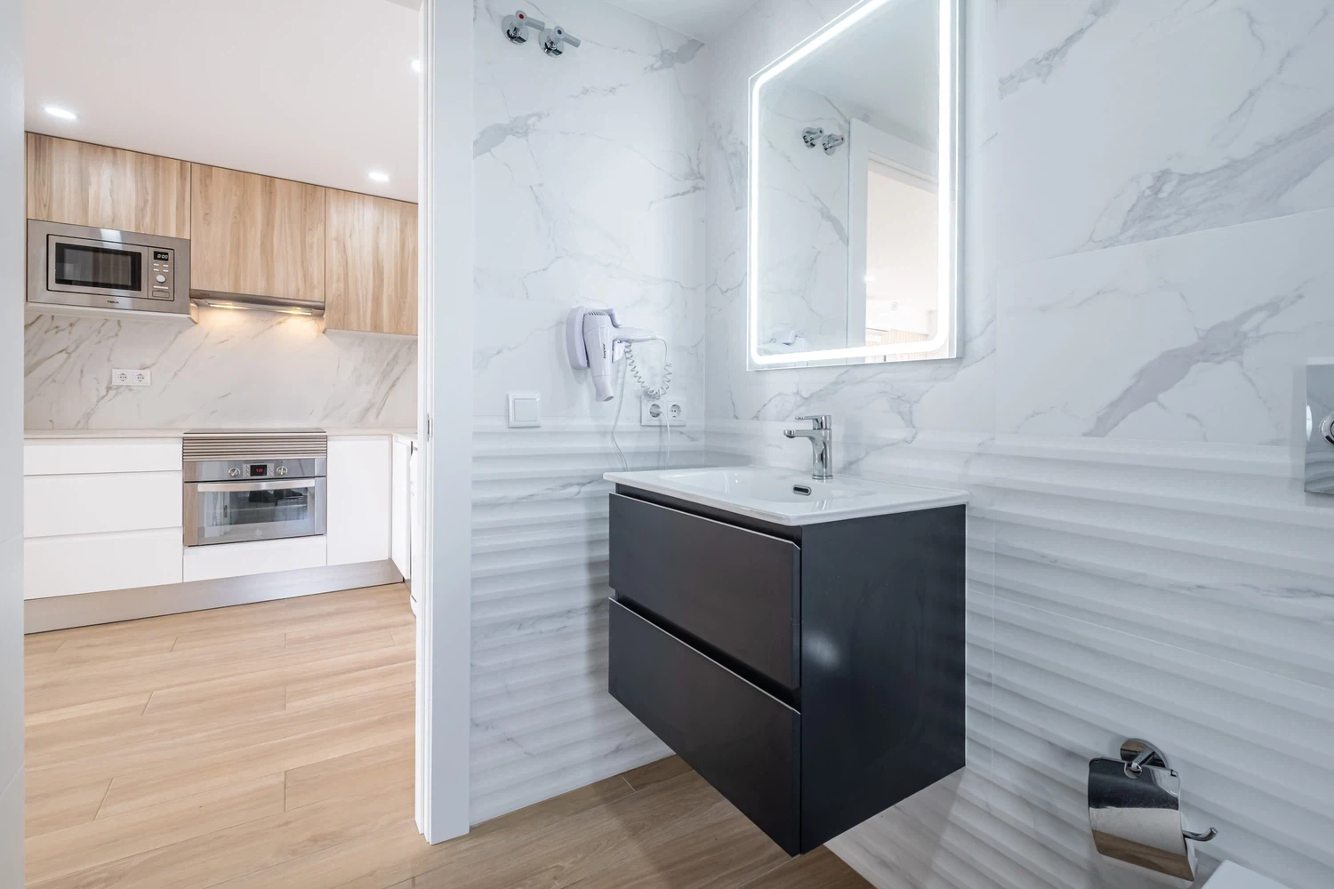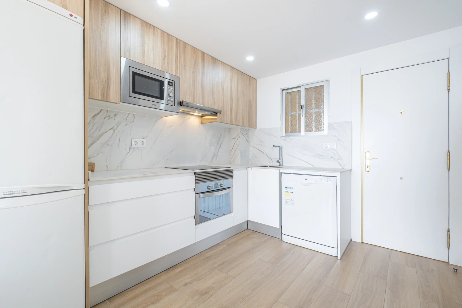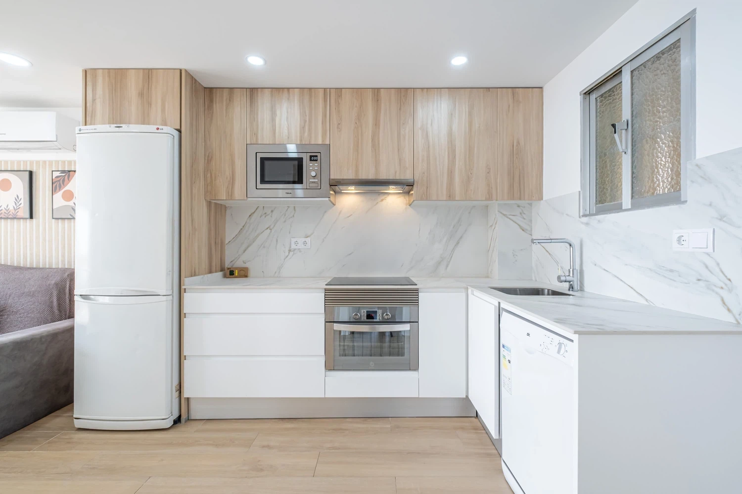 La cocina americana de inducción está equipada con nevera, lavadora, microondas, horno, congelador, lavavajillas, vajilla/cubertería, utensilios/cocina, cafetera, tostadora, hervidor de agua y exprimidor.