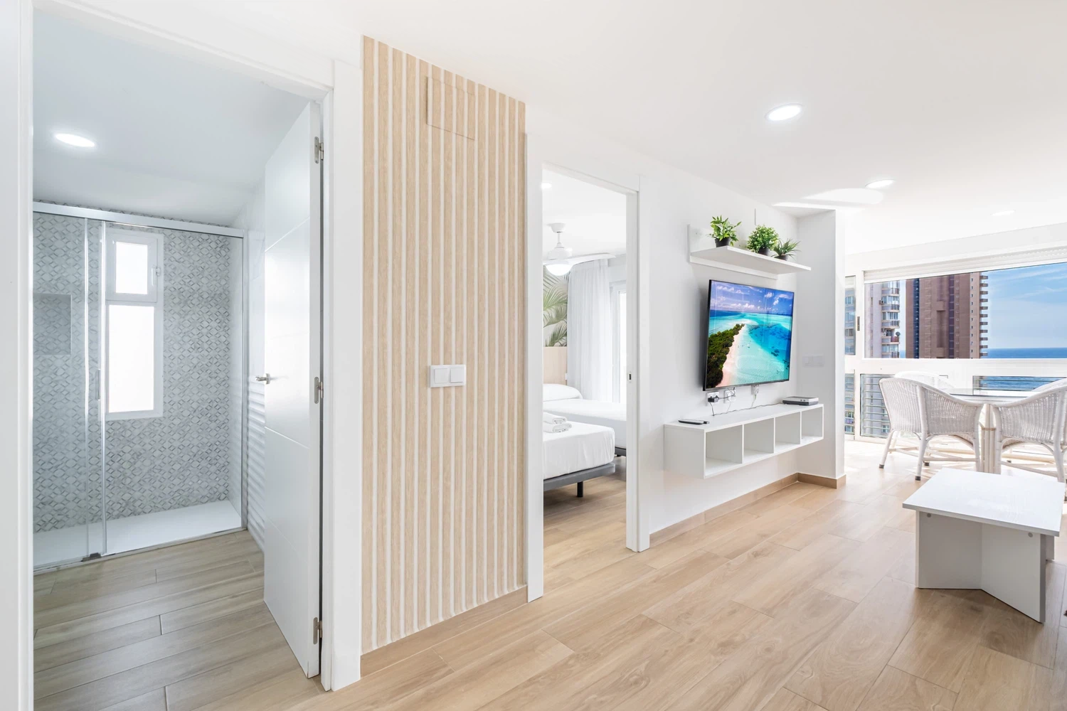 Apartamento reformado a escaso metros de la playa de Levante, Benidorm. Posee 1 dormitorio, 1 cuarto de baño con ducha y secador de pelo y capacidad para 4 personas.