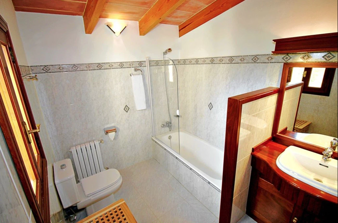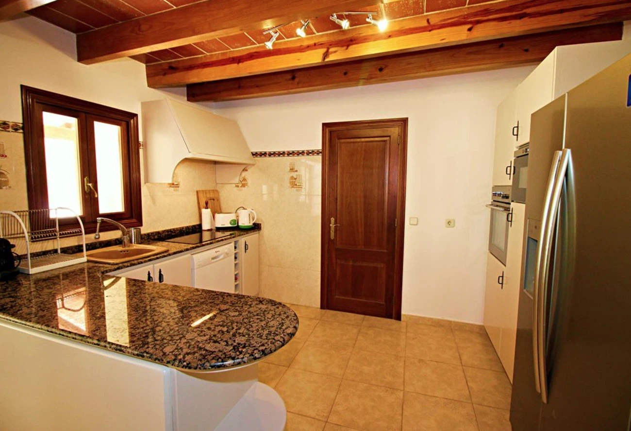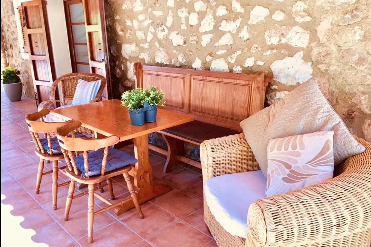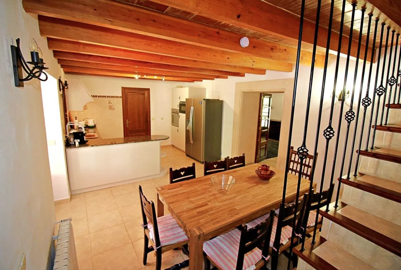 En el interior, la casa combina el encanto rústico con las comodidades modernas. La cocina de estilo campestre está totalmente equipada y se abre a un acogedor comedor tradicional. El salón dispone de cómodos sofás, televisión de pantalla plana, WiFi de alta velocidad por fibra y chimenea para las noches más frescas. La propiedad cuenta con cuatro dormitorios (dos dobles y dos con camas individuales), tres baños (uno en suite) y acceso directo a la terraza superior desde dos de los dormitorios.