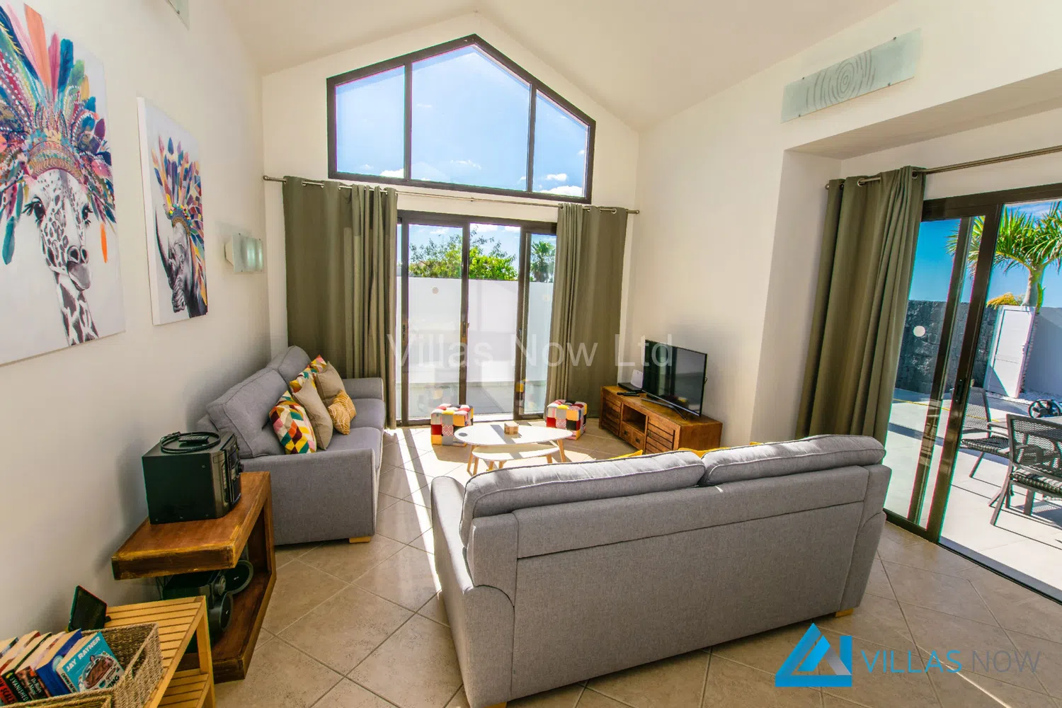 Al entrar en Villa Montana, se accede a un espacioso vestíbulo en el que se encuentra un gran salón abierto, la cocina y los dormitorios. La villa ha sido decorada con un diseño moderno y colores suaves con un buen uso de la luz natural para crear una acogedora sensación de espacio. Las grandes puertas en dos lados del salón y las ventanas en los techos de la casa ofrecen mucha luz a la propiedad. Las puertas de cristal hacia el Este ofrecen una vista impresionante de las montañas volcánicas, y hacia el Sur, en dirección a la ciudad, se tiene vista al mar, justo hacia Fuerteventura.