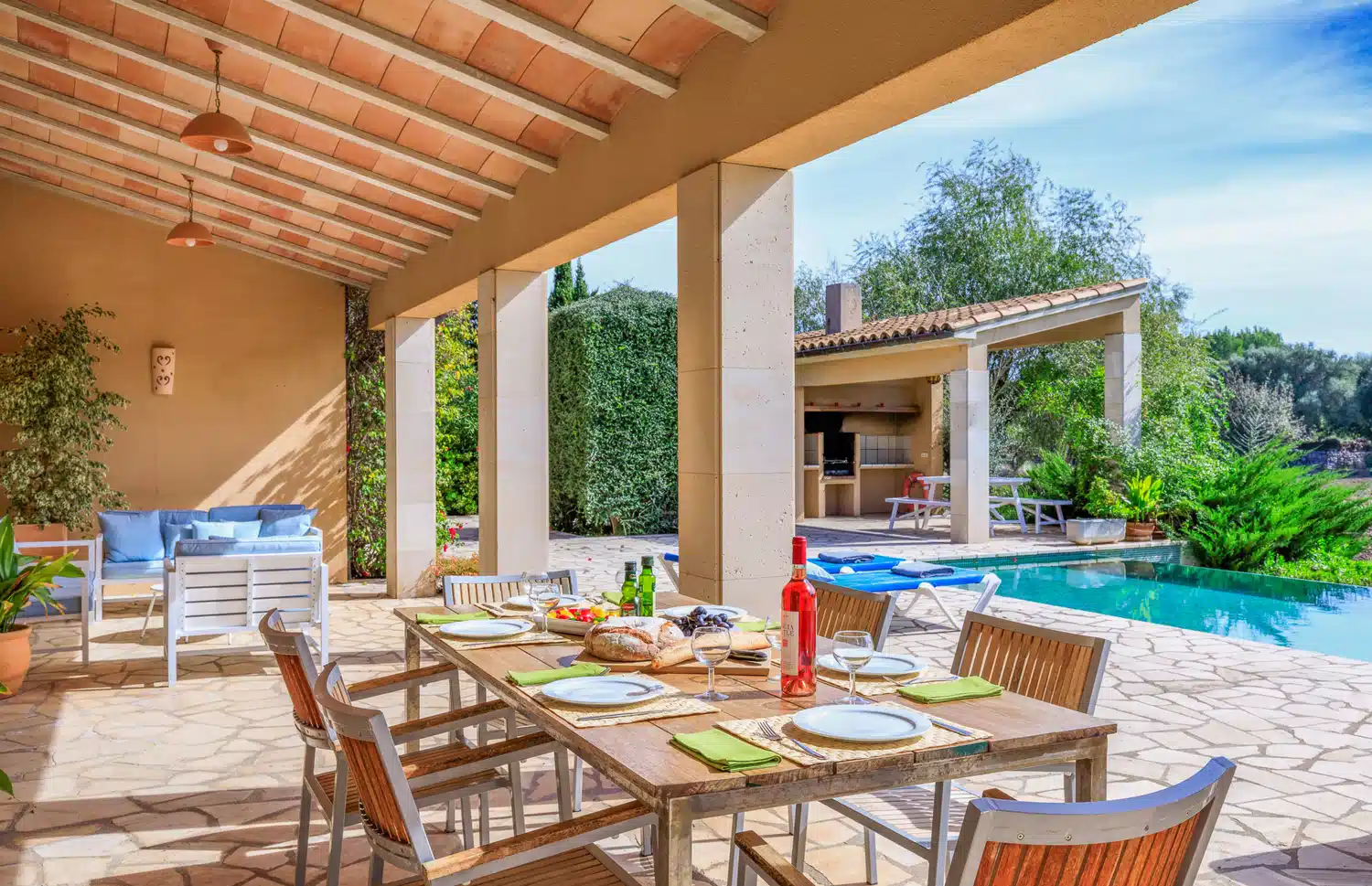 Amplia terraza cubierta con mobiliario exterior para disfrutar de comidas y cenas con amigos y familia además de una barbacoa y vistas estupendas al campo. La piscina es de buen tamaño (8x4mts) y conjuntamente con las terrazas y jardín hacen que esta casa tenga todo lo necesario para disfrutar de una perfectas vacaciones.