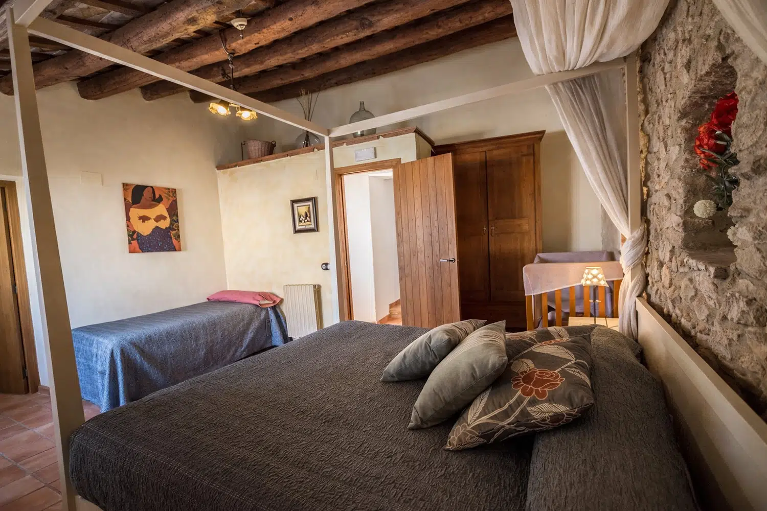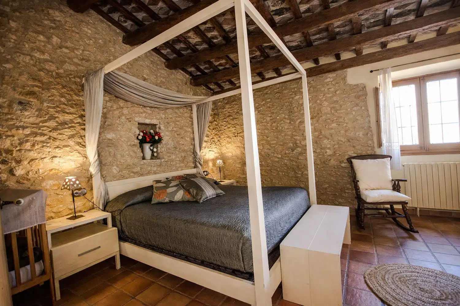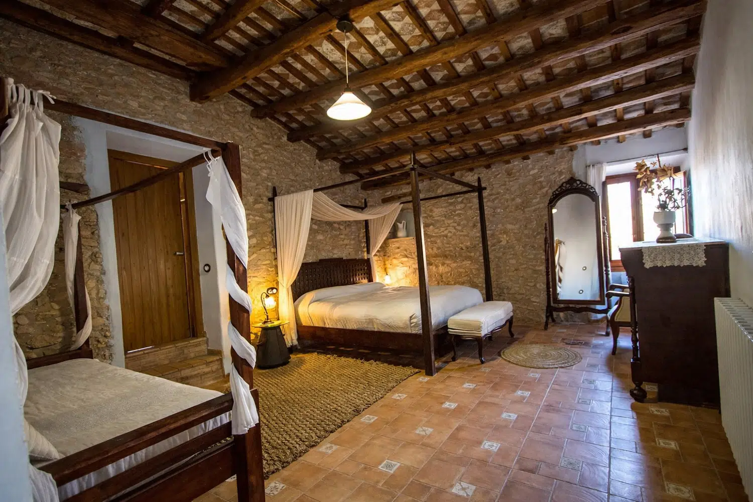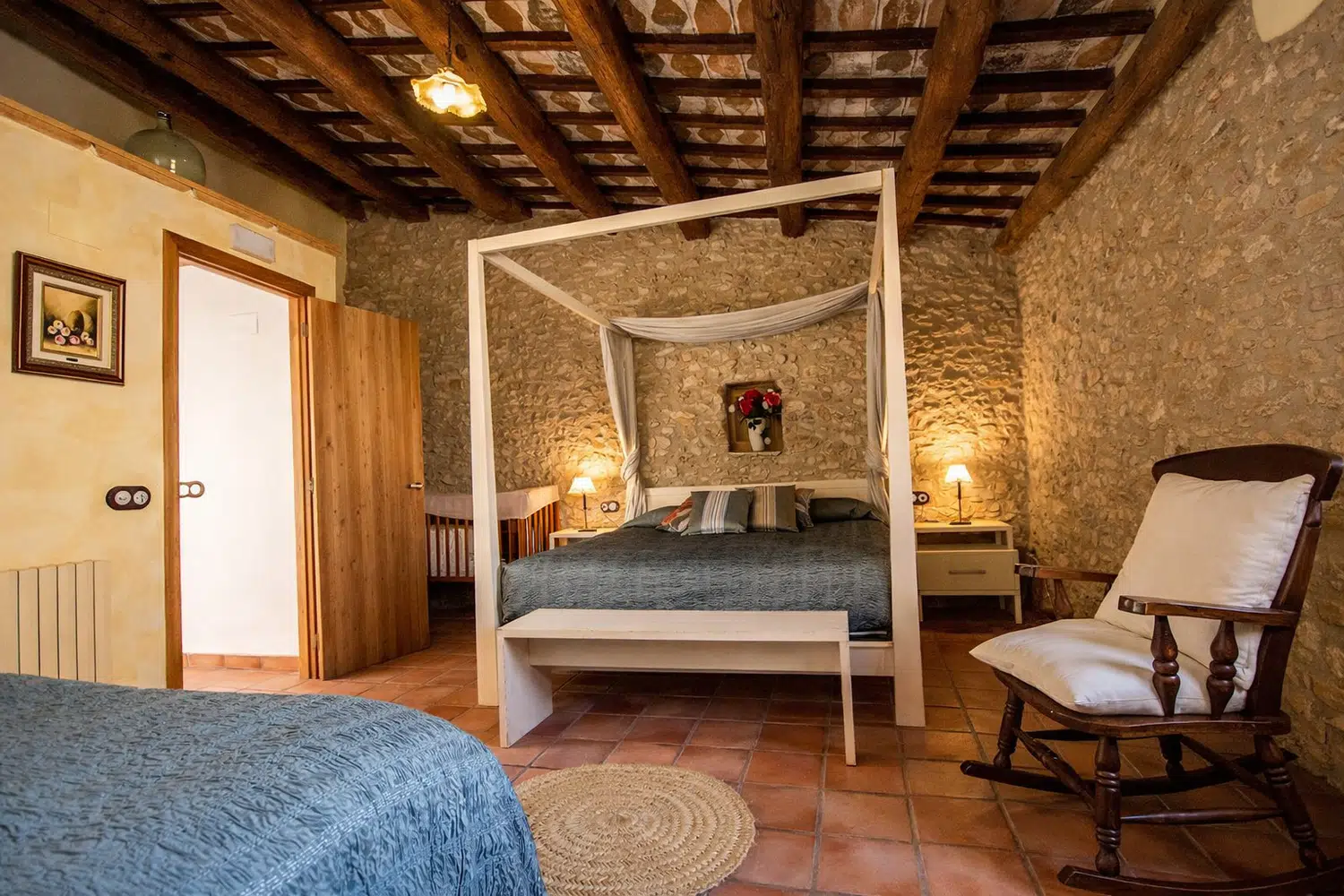 Dieciocho huéspedes pueden dormir en las seis habitaciones, la capacidad estándar es 13 personas, pero 5 camas adicionales se pueden añadir para acomodar al resto de la familia, por un suplemento diario por persona adicional. La planta baja cuenta con dos dormitorios: (1) una cama doble, una cama individual, baño privado, y (2) dos camas individuales y dos camas nido. En el segundo piso, las habitaciones son las siguientes: (1) una cama doble, una cama individual, baño privado, (2) una cama doble, un sofá cama, baño privado, (3) una cama doble, una cama individual, baño privado, y (4) una cama doble, cuarto de baño.