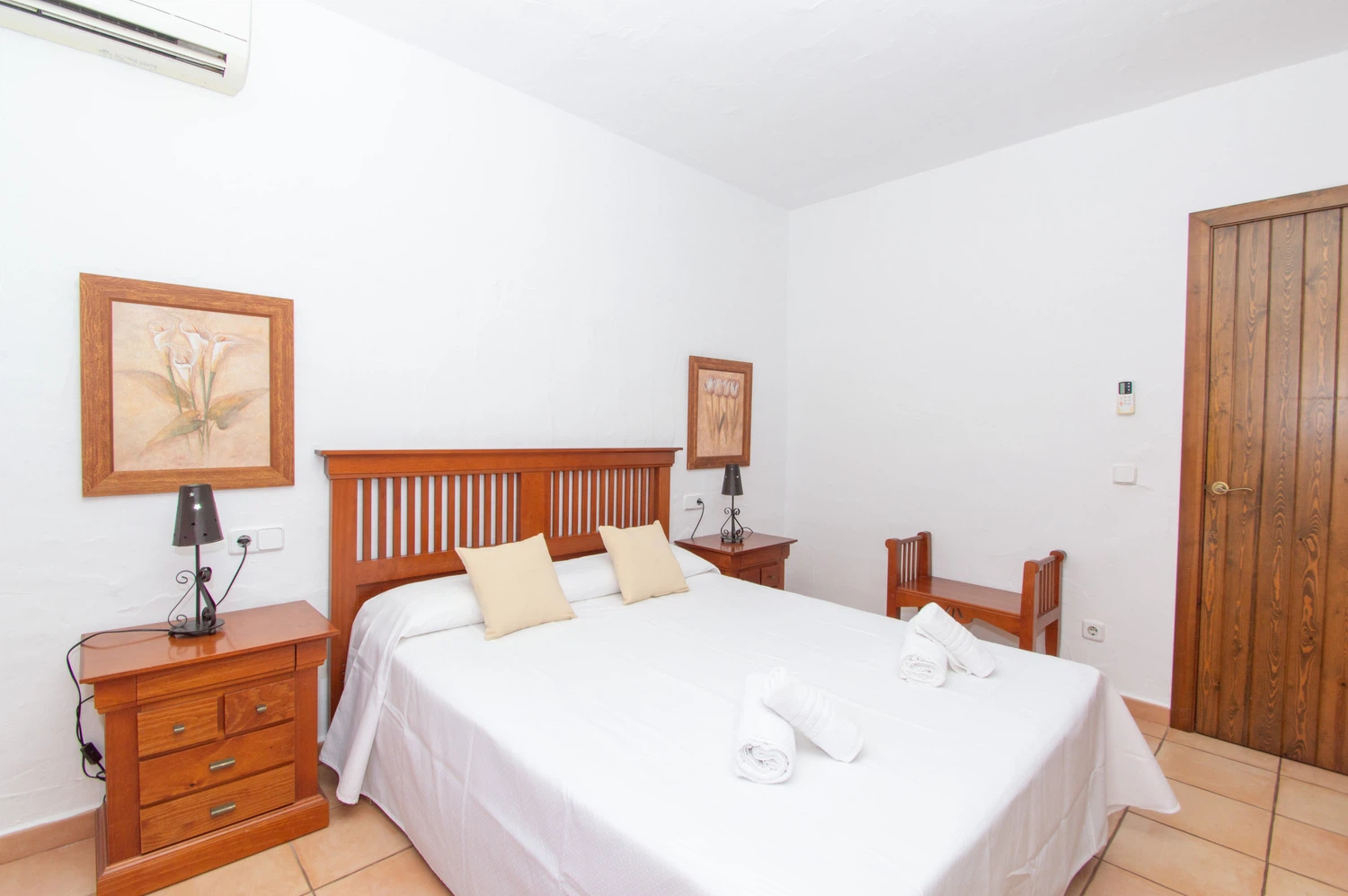 En el nivel superior, se encuentran los otros tres dormitorios dobles. La habitación principal está equipada con una cama de matrimonio, un amplio armario y un baño completo en suite equipado con bañera y secador. Además, este dormitorio tiene acceso a un gran balcón privado que goza de unas preciosas vistas de la piscina y del campo de la isla. A continuación, por el pasillo encontramos la segunda habitación doble, equipada con dos camas individuales y un armario. Seguidamente, se encuentra el otro cuarto de baño totalmente equipado con plato de ducha. Justo al lado, se encuentra la otra habitación doble equipada con dos camas individuales y un amplio armario. Todas las habitaciones están equipadas con aire acondicionado. En la otra parte de la villa se encuentra el salón y la pequeña cocina de la planta superior.