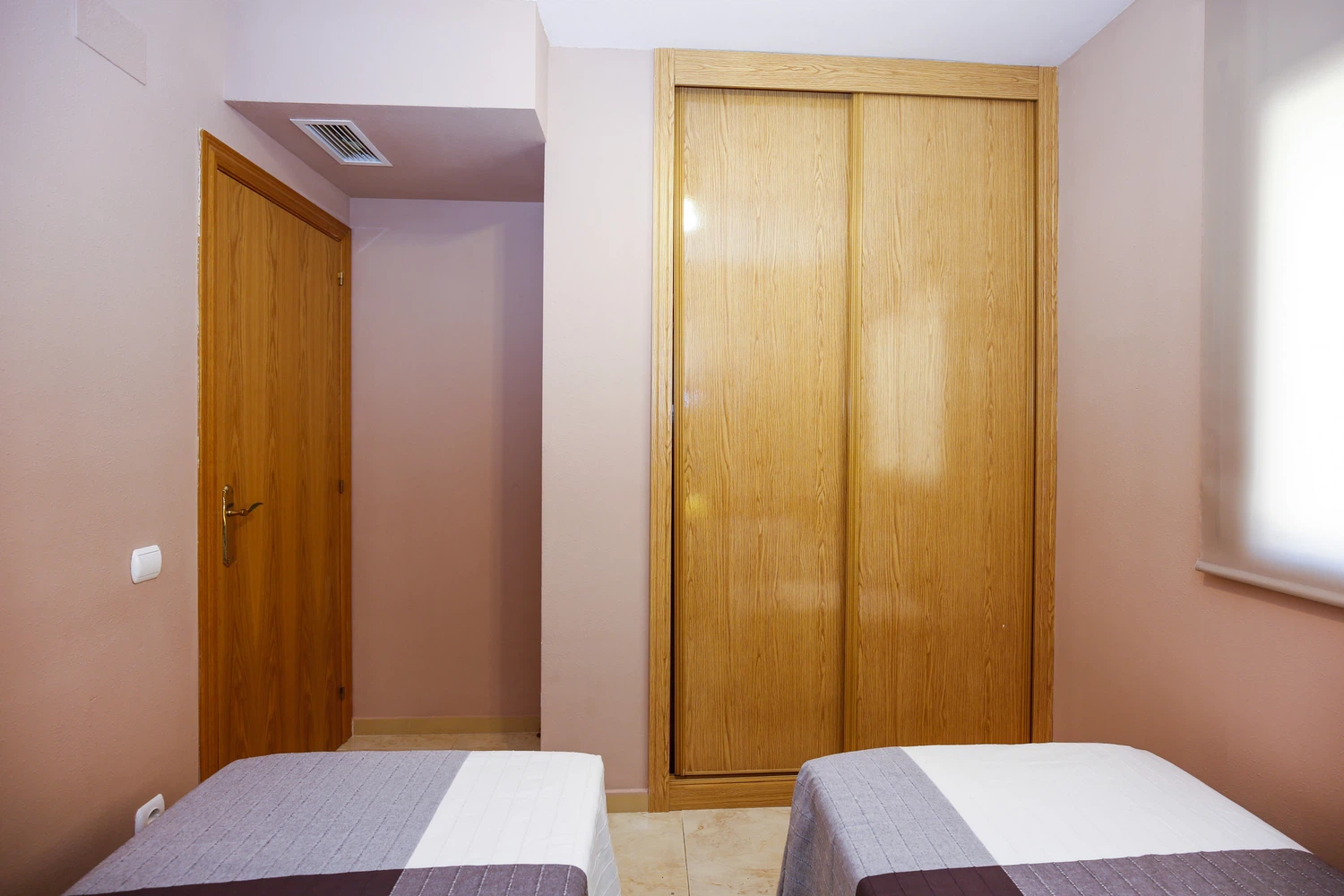 El apartamento dispone de un salón comedor con salida a una agradable terraza, cocina americana completamente equipada y aire acondicionado en todo el alojamiento. Además, cuenta con piscina comunitaria y plaza de parking en el mismo edificio para mayor comodidad.