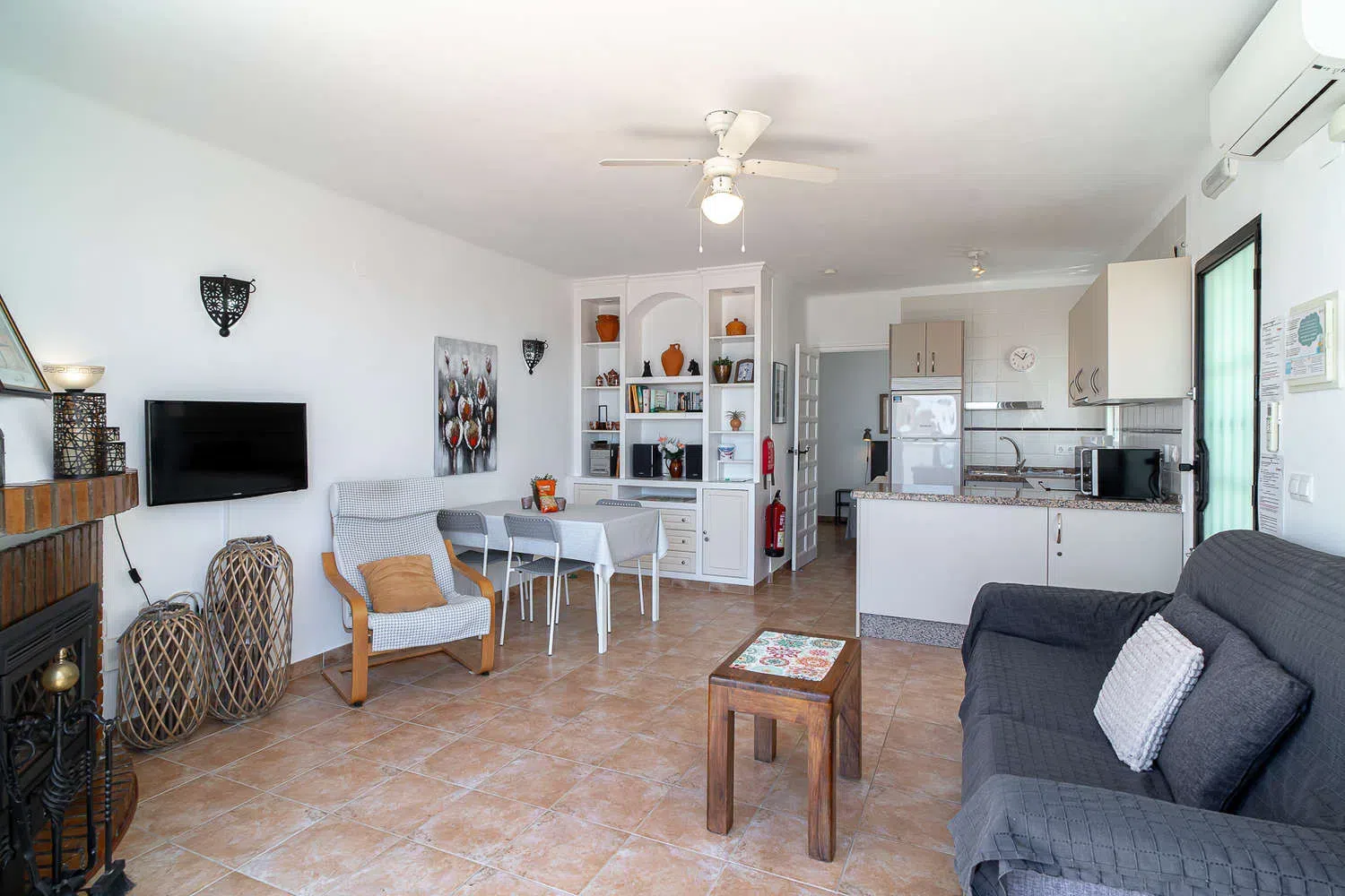 Cocina y equipamiento: Cocina abierta equipada para el día a día con vitrocerámica, frigorífico, congelador, horno, microondas, cafetera, hervidor eléctrico, tostadora, menaje y vajilla.