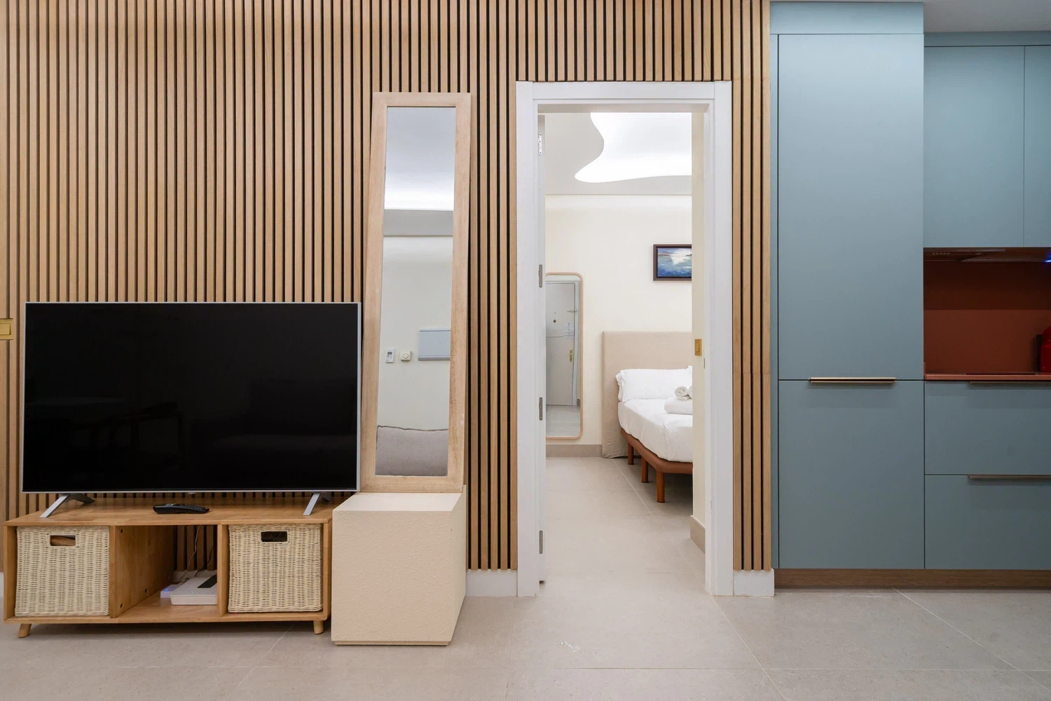 Sala de estar acogedora: La sala de estar incluye un sofá cama doble que puede acomodar a dos personas adicionales, televisión y una pequeña área de comedor, creando un espacio perfecto para relajarse y socializar.