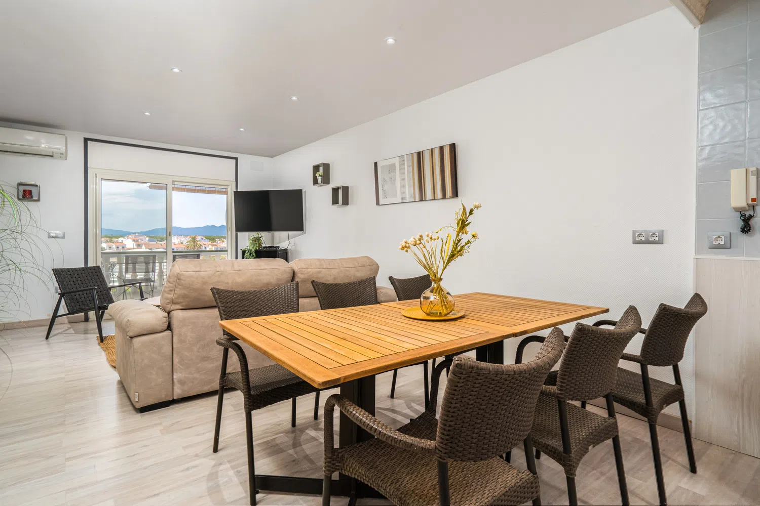 Disfrute de un amplio y luminoso salón que cuenta con un acogedor sofá. El salón también está equipado con Smart TV y aire acondicionado, y desde allí se accede a una gran terraza con impresionantes vistas de los canales de Empuriabrava, perfecta para relajarse con una taza de café.