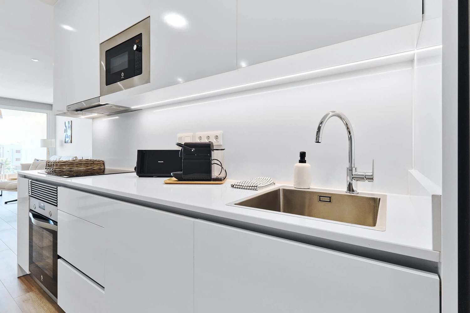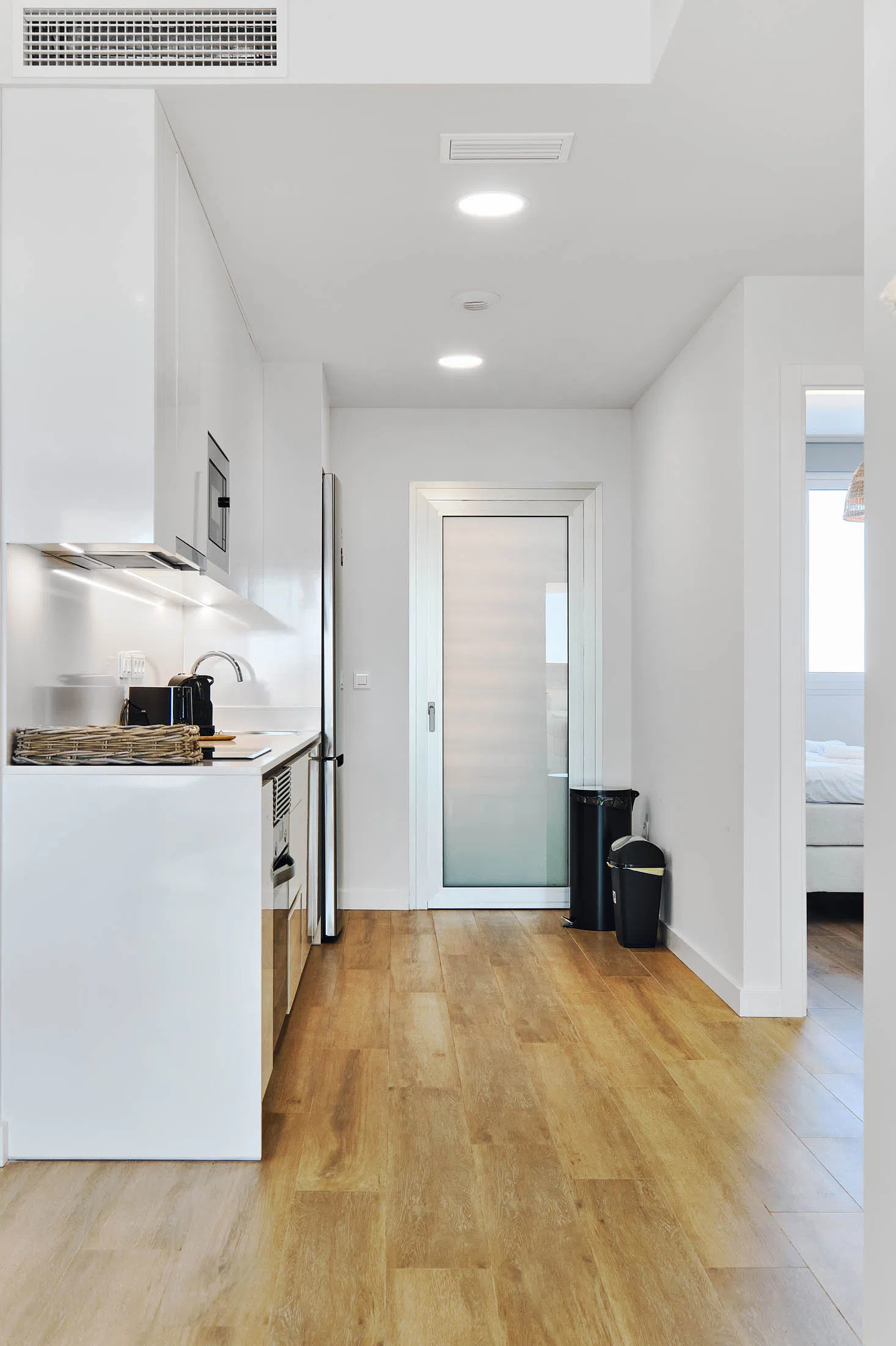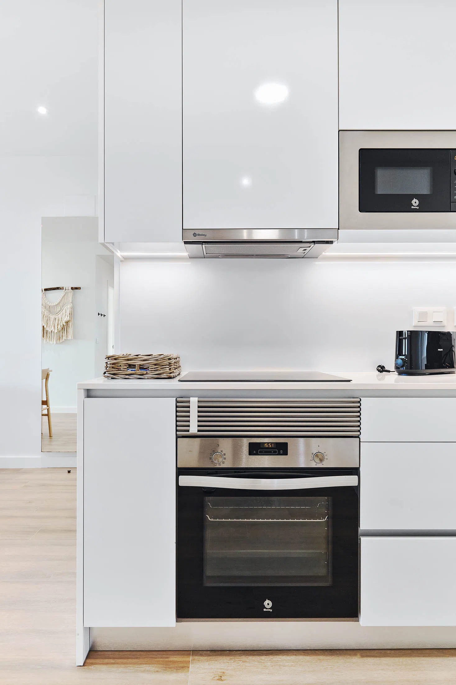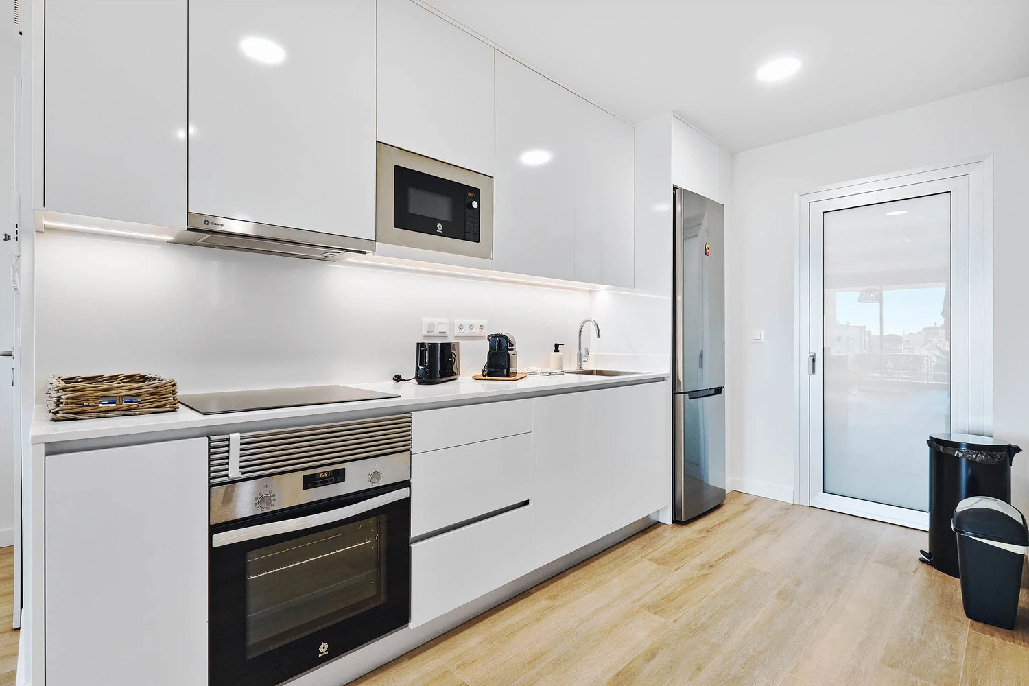 La cocina americana está totalmente equipada con electrodomésticos de última generación, incluyendo nevera, congelador, lavadora, lavavajillas, horno, microondas, cafetera y todo lo necesario para que puedas preparar tus comidas con comodidad.