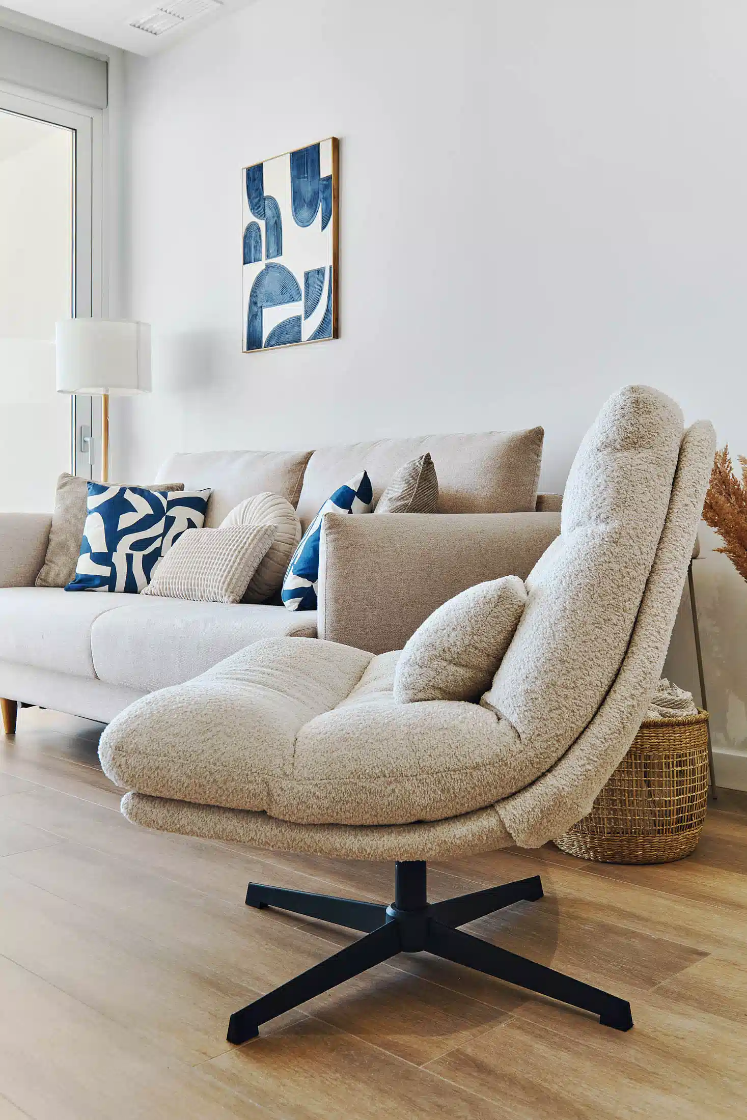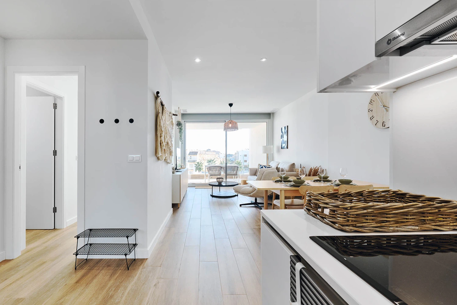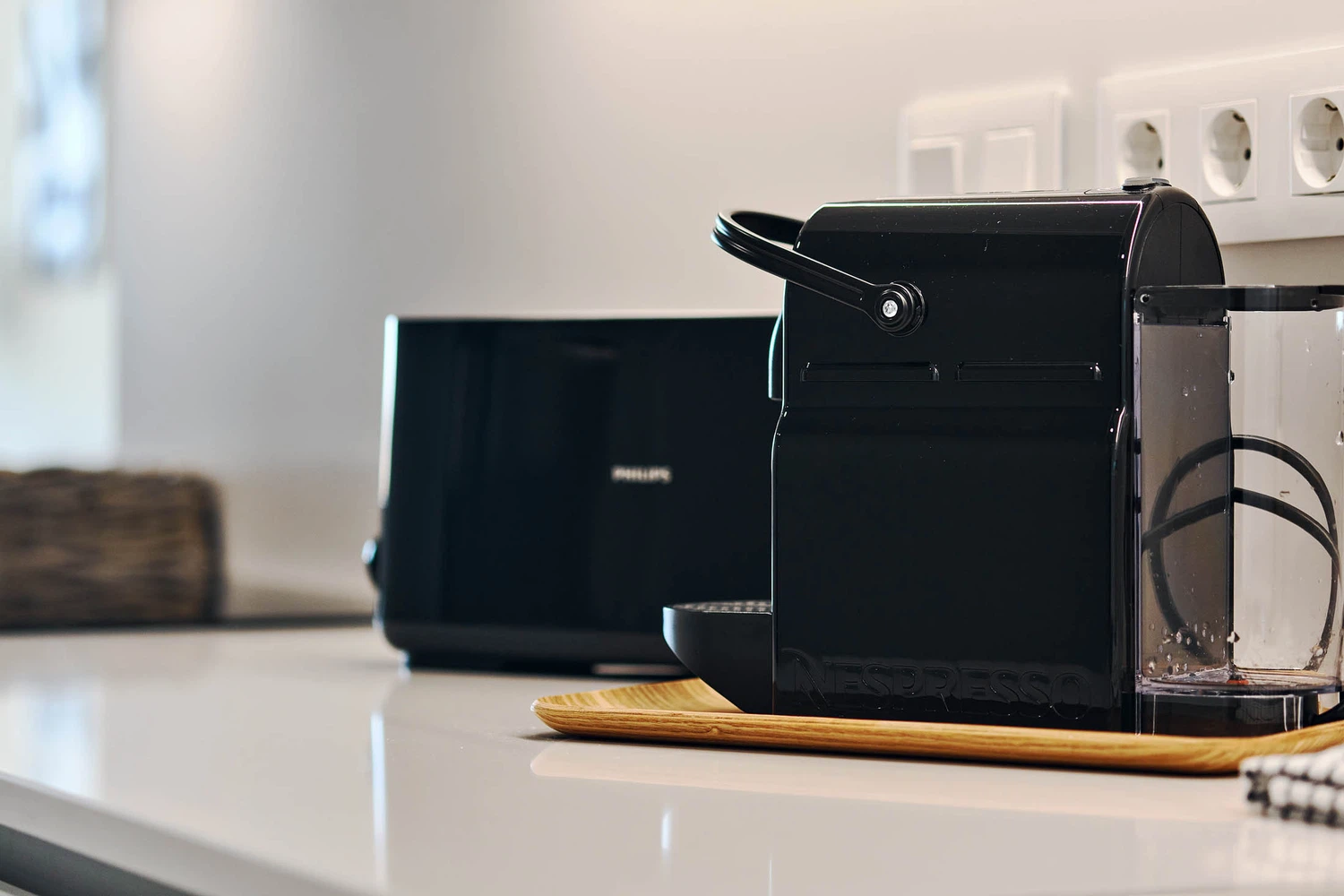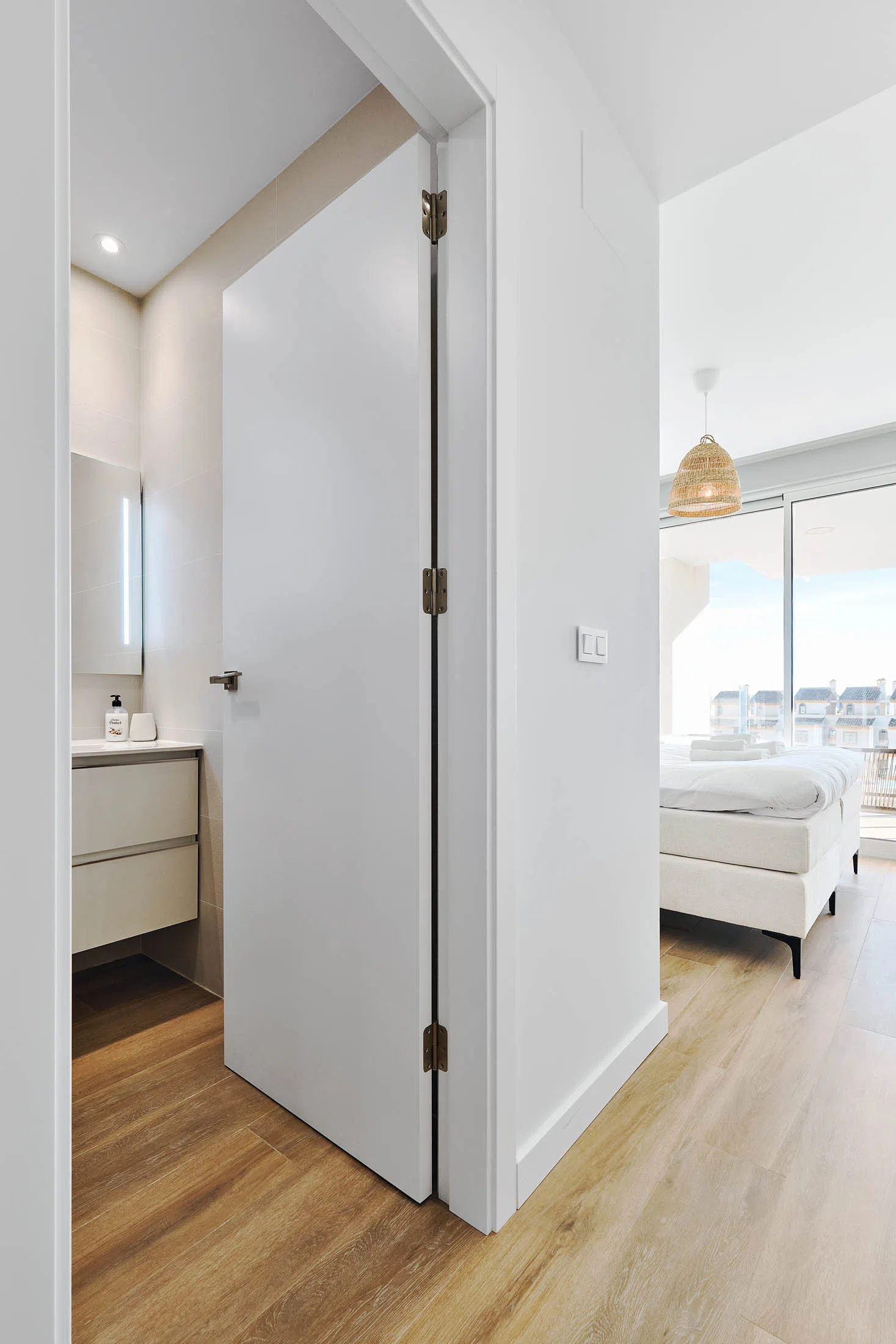 La cocina americana está totalmente equipada con electrodomésticos de última generación, incluyendo nevera, congelador, lavadora, lavavajillas, horno, microondas, cafetera y todo lo necesario para que puedas preparar tus comidas con comodidad.