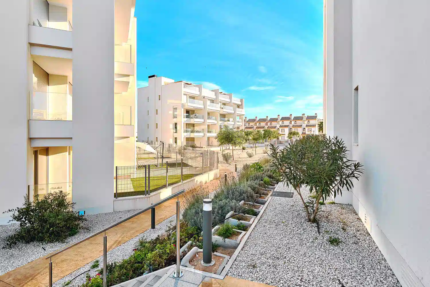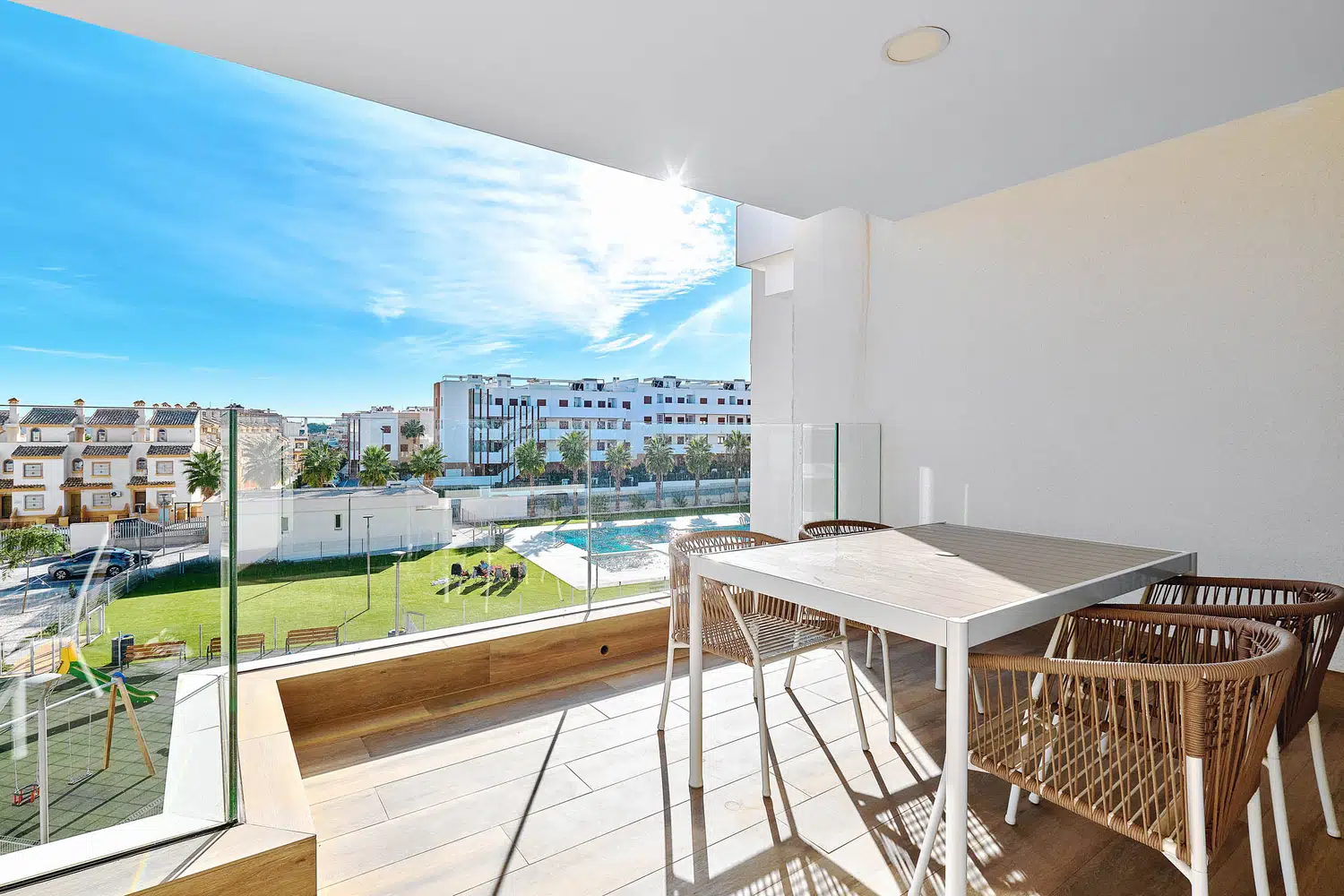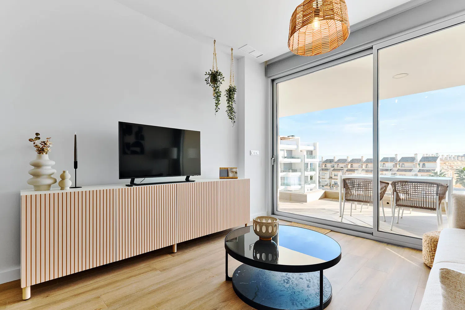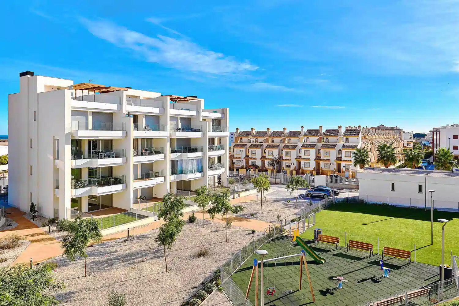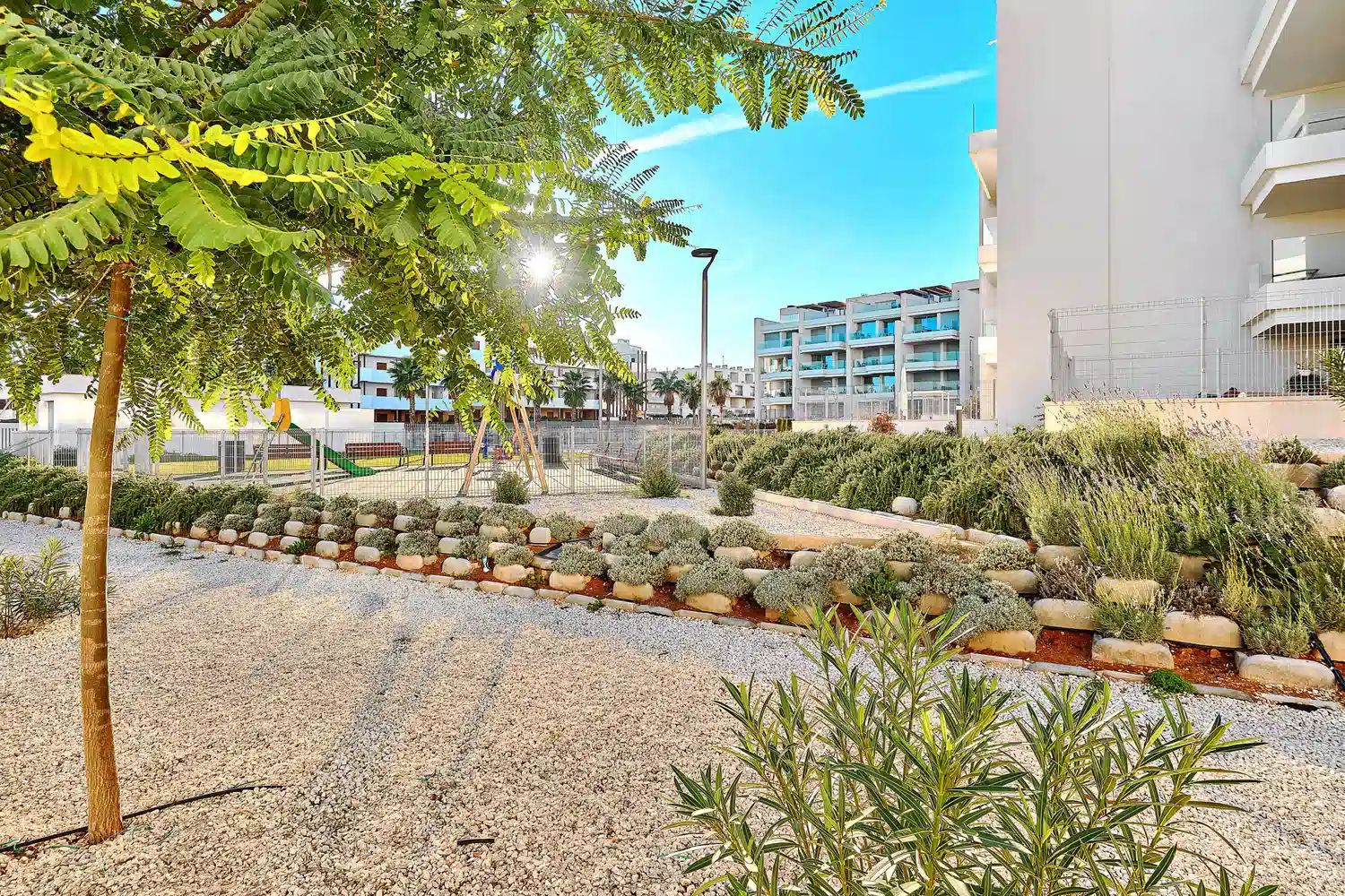 El apartamento tiene una plaza de aparcamiento privada en el mismo edificio, lo que facilita la llegada y salida. La ubicación es inmejorable, a solo 2 km de la playa de La Zenia y a 1 km del campo de golf de Villamartin. También tienes a tu disposición supermercados, restaurantes y cafeterías a pocos minutos a pie.