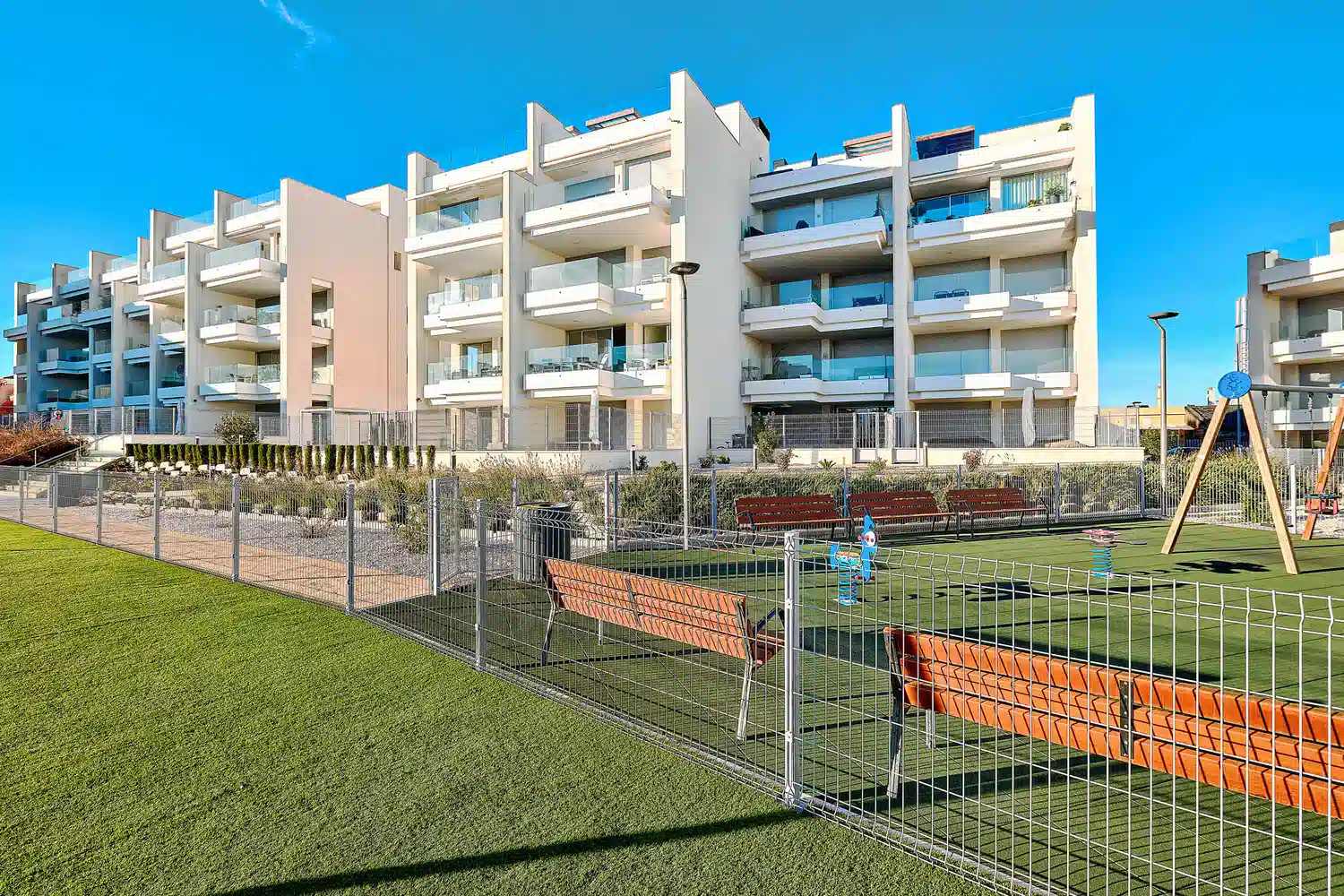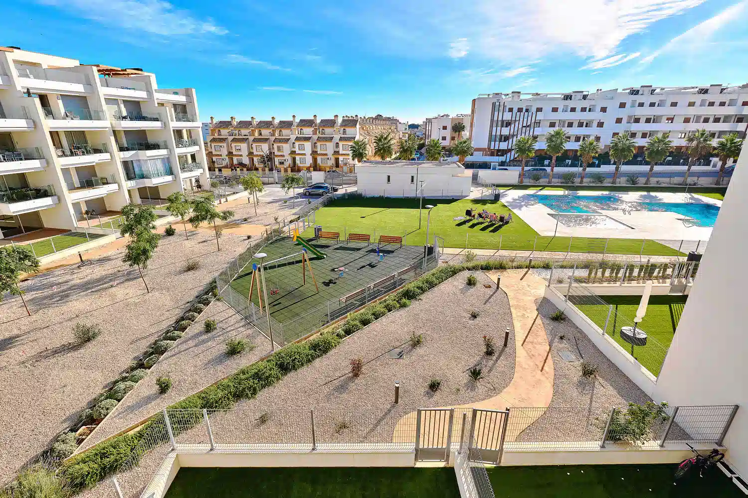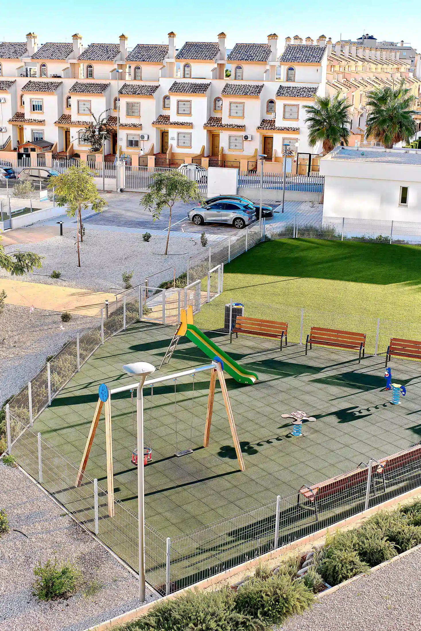 El complejo cuenta con una piscina comunitaria de tamaño estándar, perfecta para refrescarse en los días calurosos. Además, dispone de un área de juegos para los más pequeños.