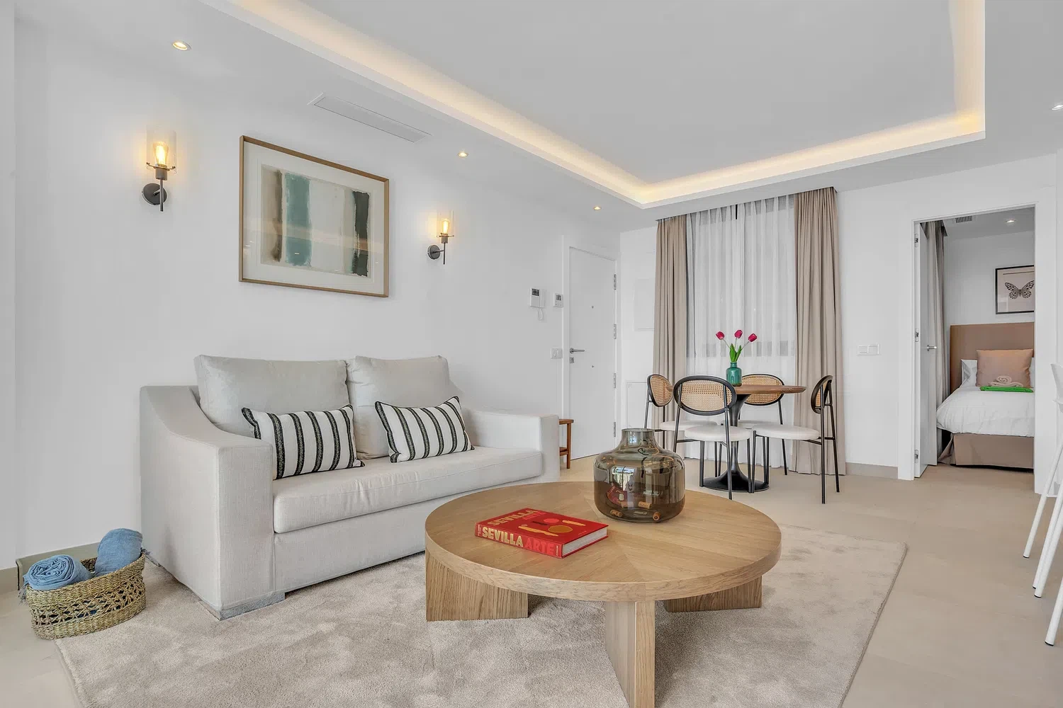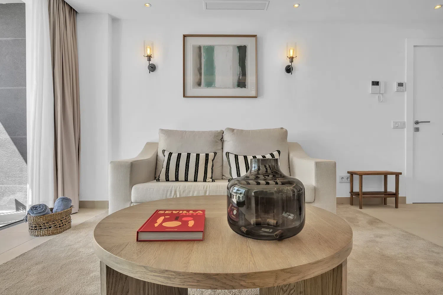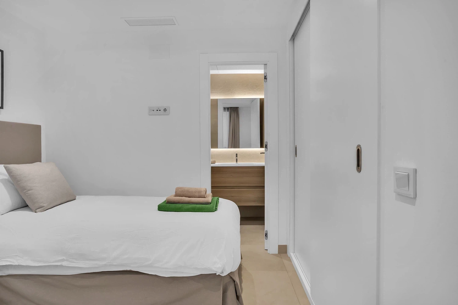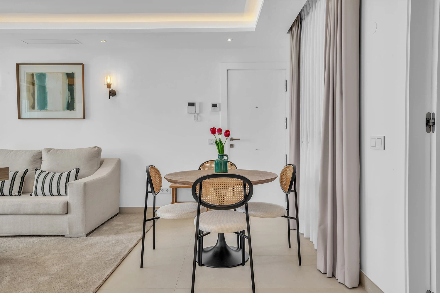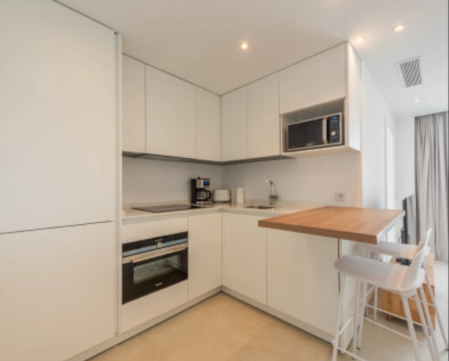 Acabados de alta calidad y comodidades modernas son evidentes en todo, desde el aire acondicionado frío y caliente impulsado por un sistema aerotérmico eficiente energéticamente hasta el elegante pavimento de cerámica porcelánica e iluminación LED. Las ventanas de aluminio de piso a techo con doble acristalamiento de perfil delgado maximizan la luz natural mientras mantienen el aislamiento. La cocina está completamente equipada con electrodomésticos de ahorro energético, y el apartamento se ofrece completamente amueblado y listo para mudarse.