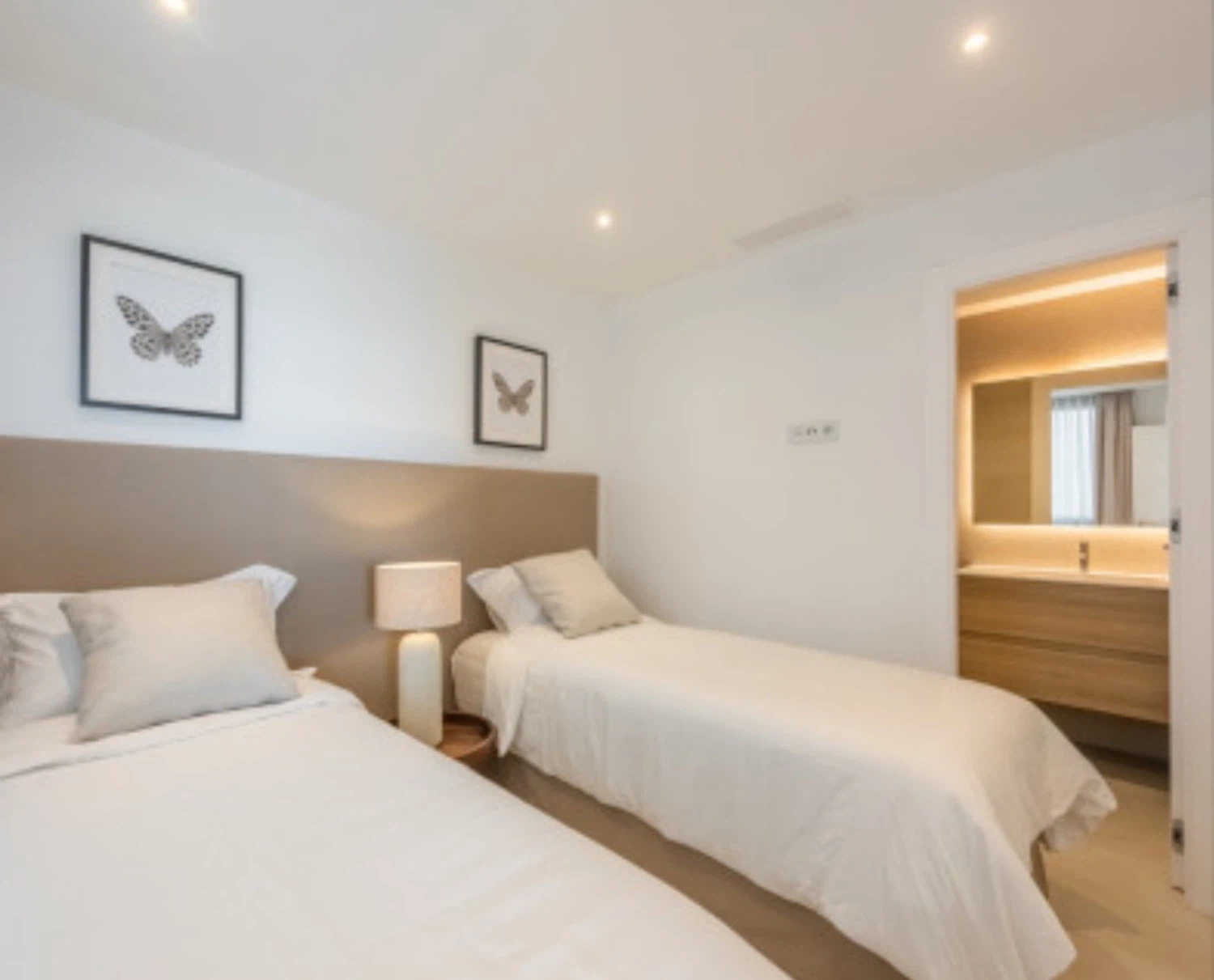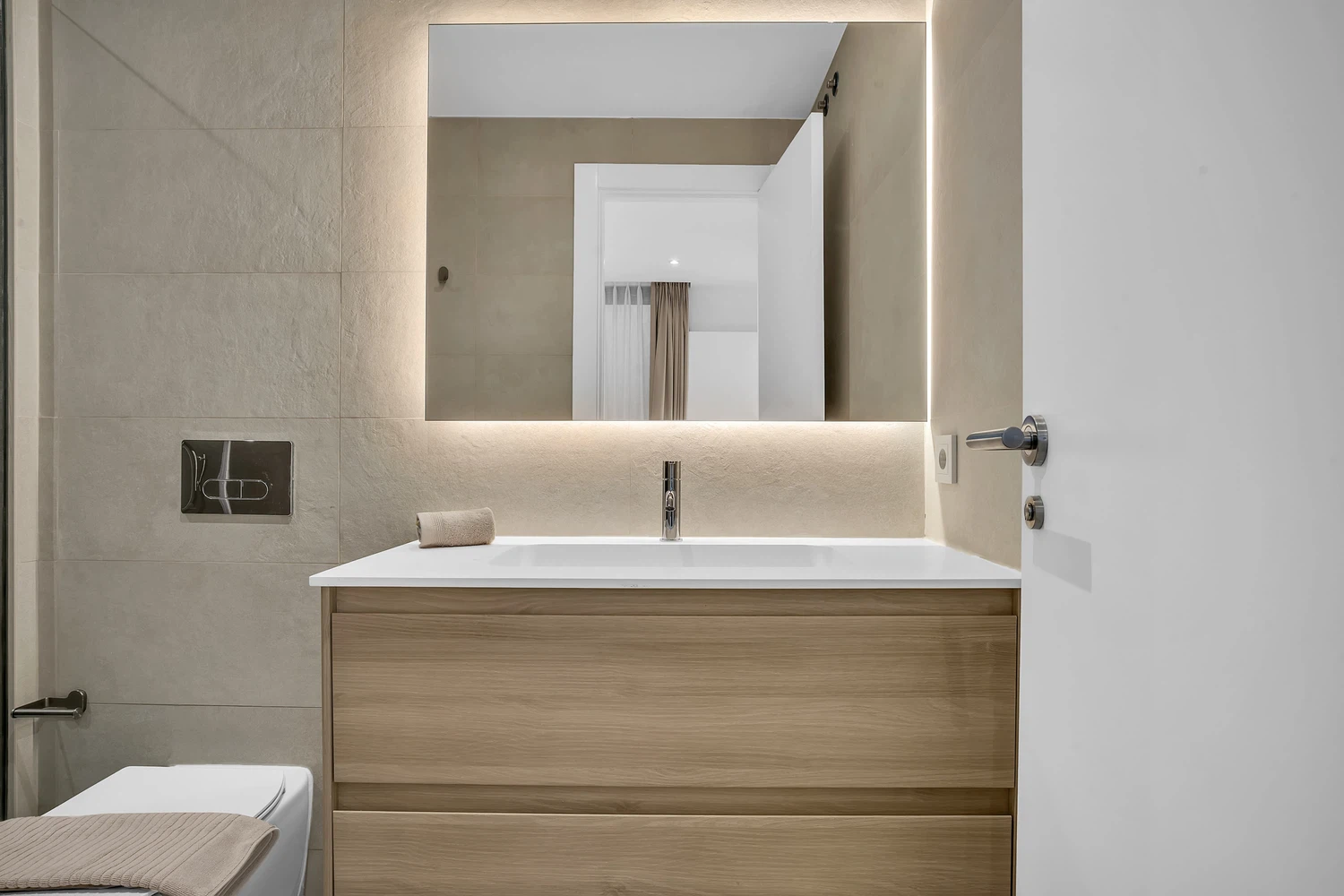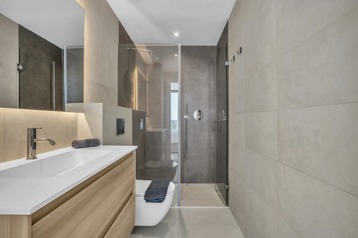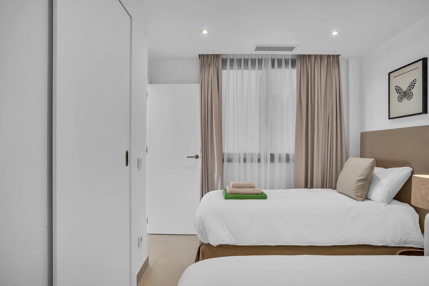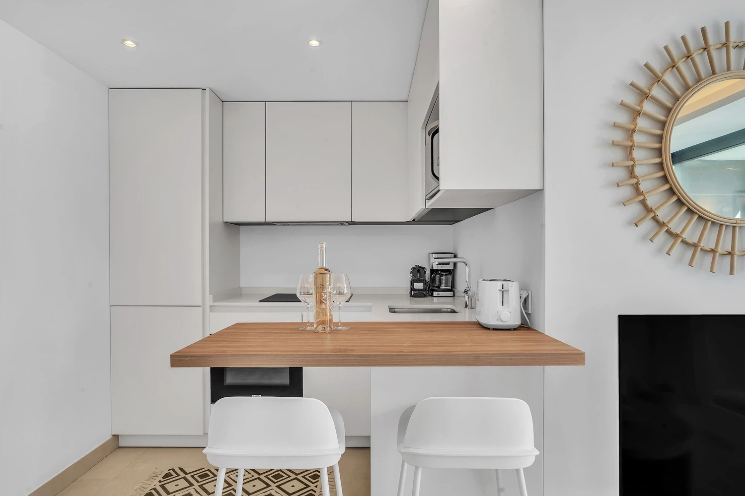 Acabados de alta calidad y comodidades modernas son evidentes en todo, desde el aire acondicionado frío y caliente impulsado por un sistema aerotérmico eficiente energéticamente hasta el elegante pavimento de cerámica porcelánica e iluminación LED. Las ventanas de aluminio de piso a techo con doble acristalamiento de perfil delgado maximizan la luz natural mientras mantienen el aislamiento. La cocina está completamente equipada con electrodomésticos de ahorro energético, y el apartamento se ofrece completamente amueblado y listo para mudarse.