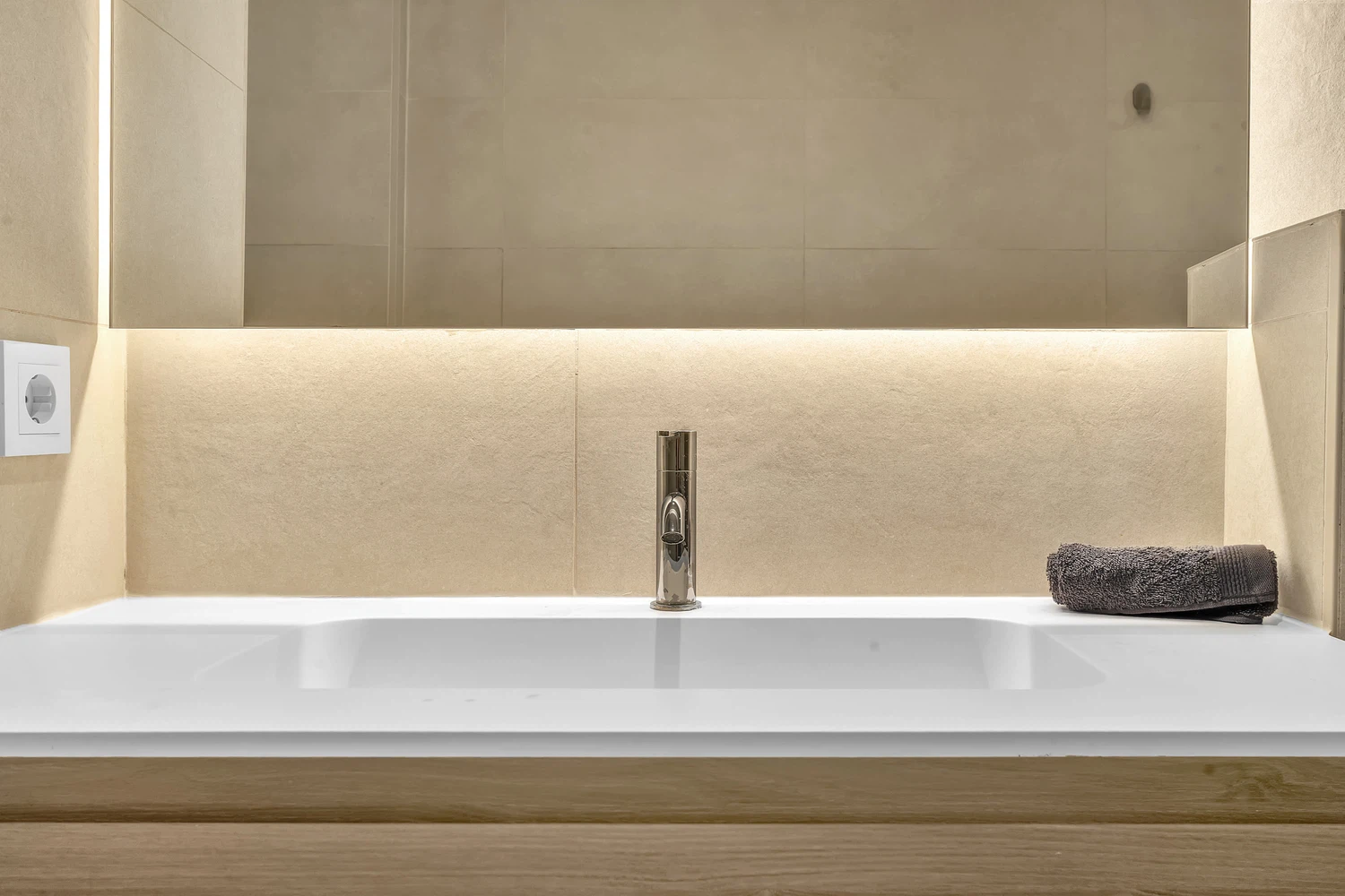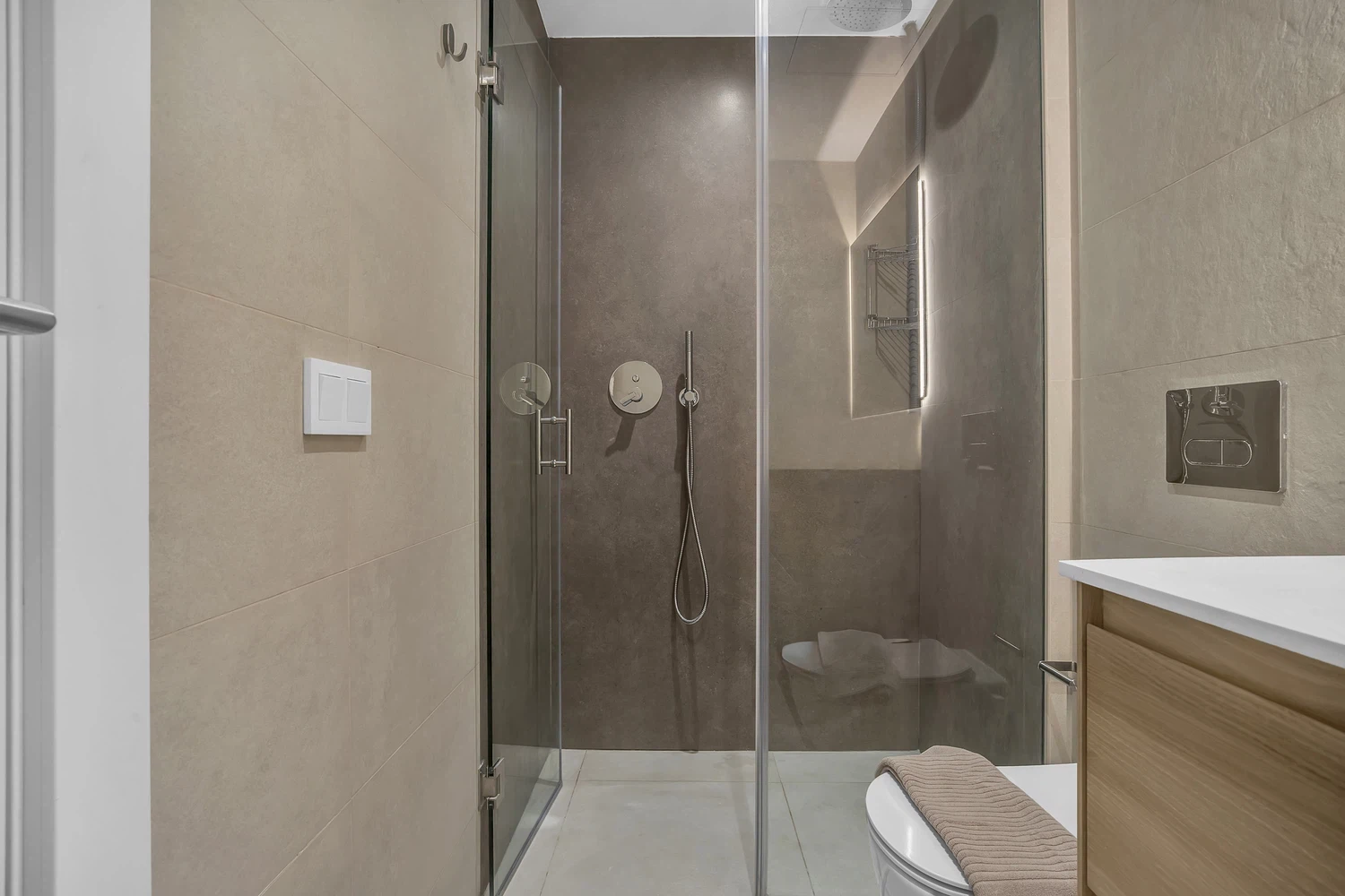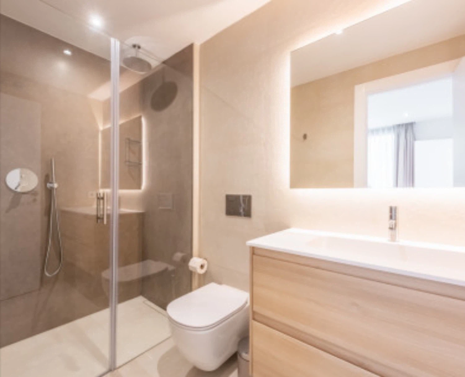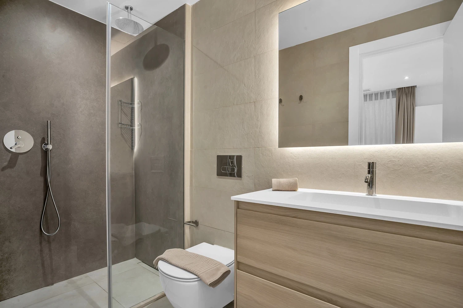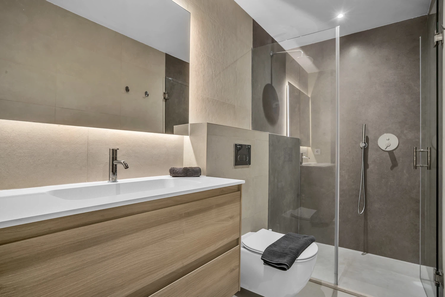 Acabados de alta calidad y comodidades modernas son evidentes en todo, desde el aire acondicionado frío y caliente impulsado por un sistema aerotérmico eficiente energéticamente hasta el elegante pavimento de cerámica porcelánica e iluminación LED. Las ventanas de aluminio de piso a techo con doble acristalamiento de perfil delgado maximizan la luz natural mientras mantienen el aislamiento. La cocina está completamente equipada con electrodomésticos de ahorro energético, y el apartamento se ofrece completamente amueblado y listo para mudarse.