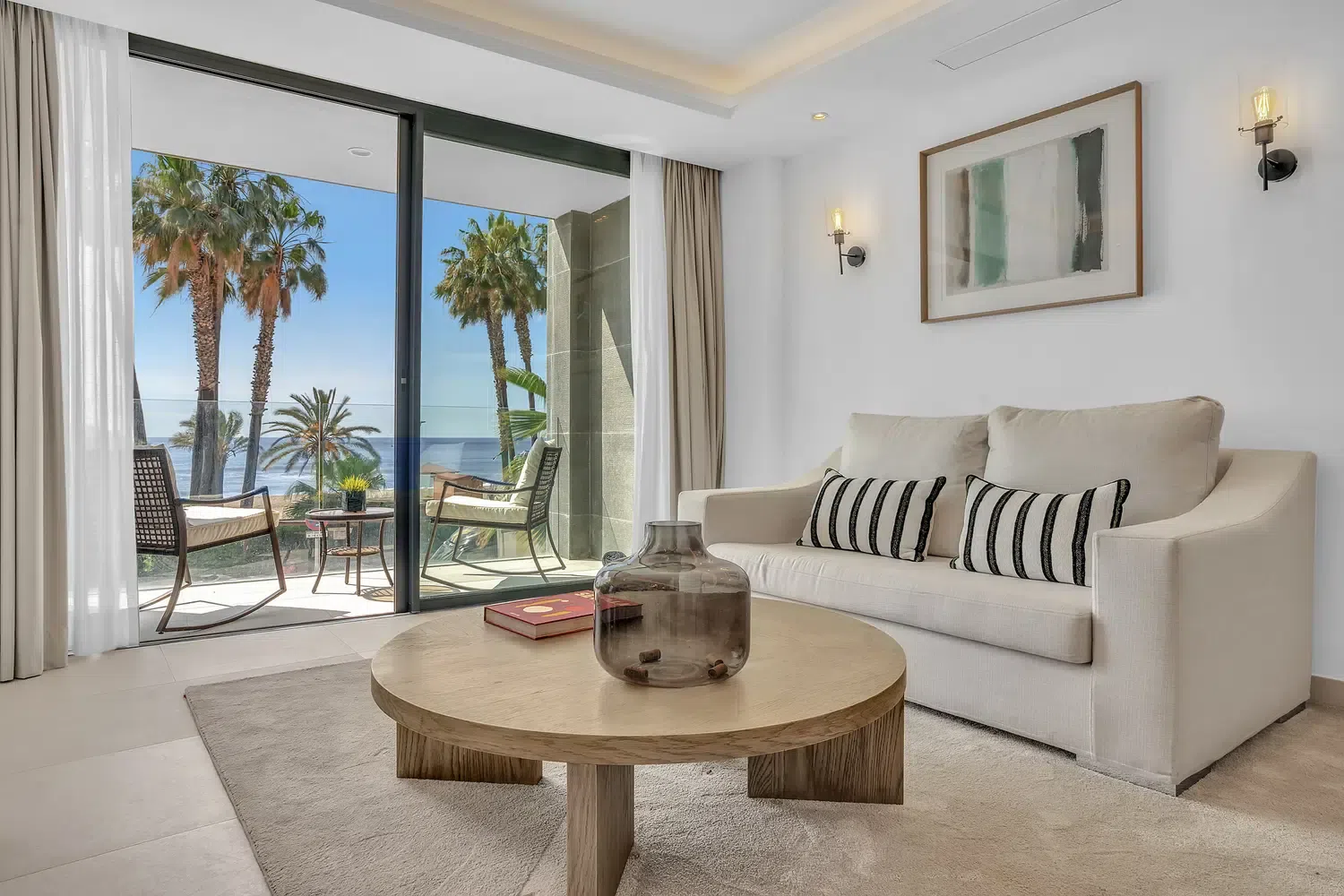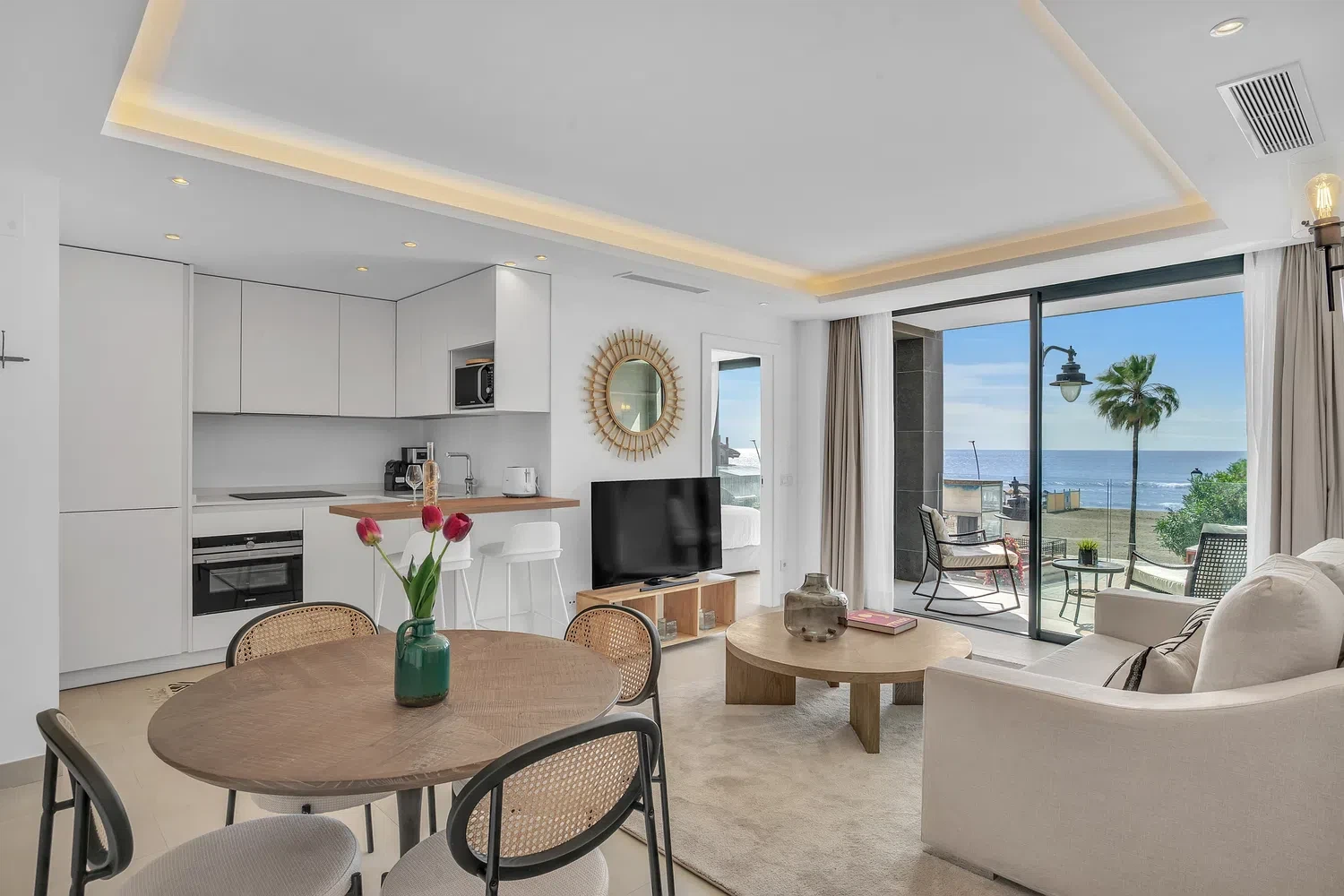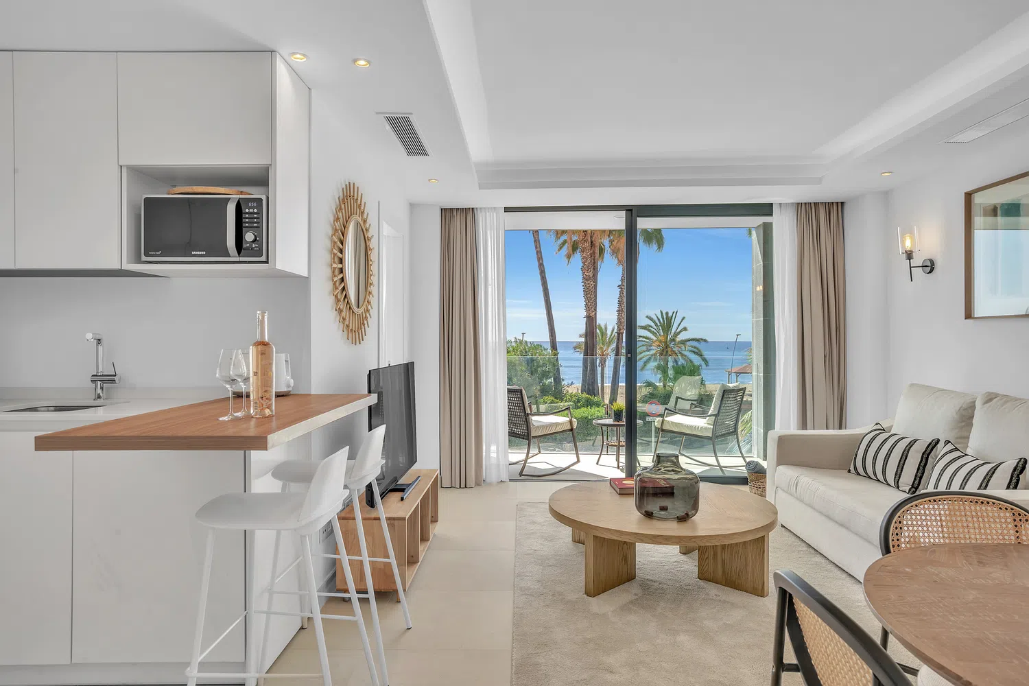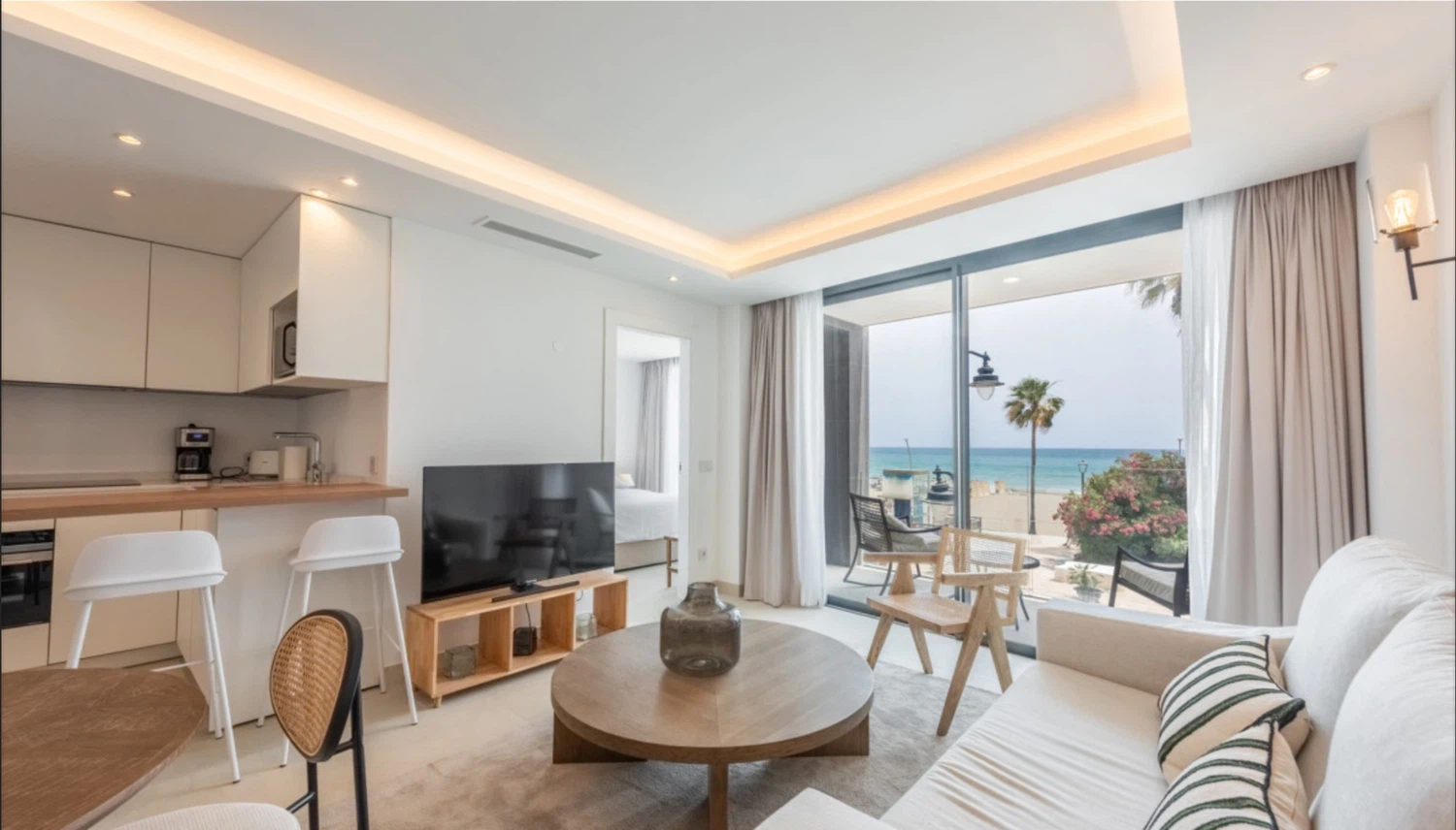 El apartamento cuenta con un diseño contemporáneo de planta abierta que combina perfectamente la cocina totalmente equipada con una elegante barra de desayuno, un área de comedor con estilo y una amplia sala de estar. Ambos dormitorios incluyen baños en suite, garantizando comodidad y privacidad. El dormitorio principal y la sala de estar dan a una terraza privada, donde las vistas abiertas al mar crean el telón de fondo perfecto para relajarse o entretener.