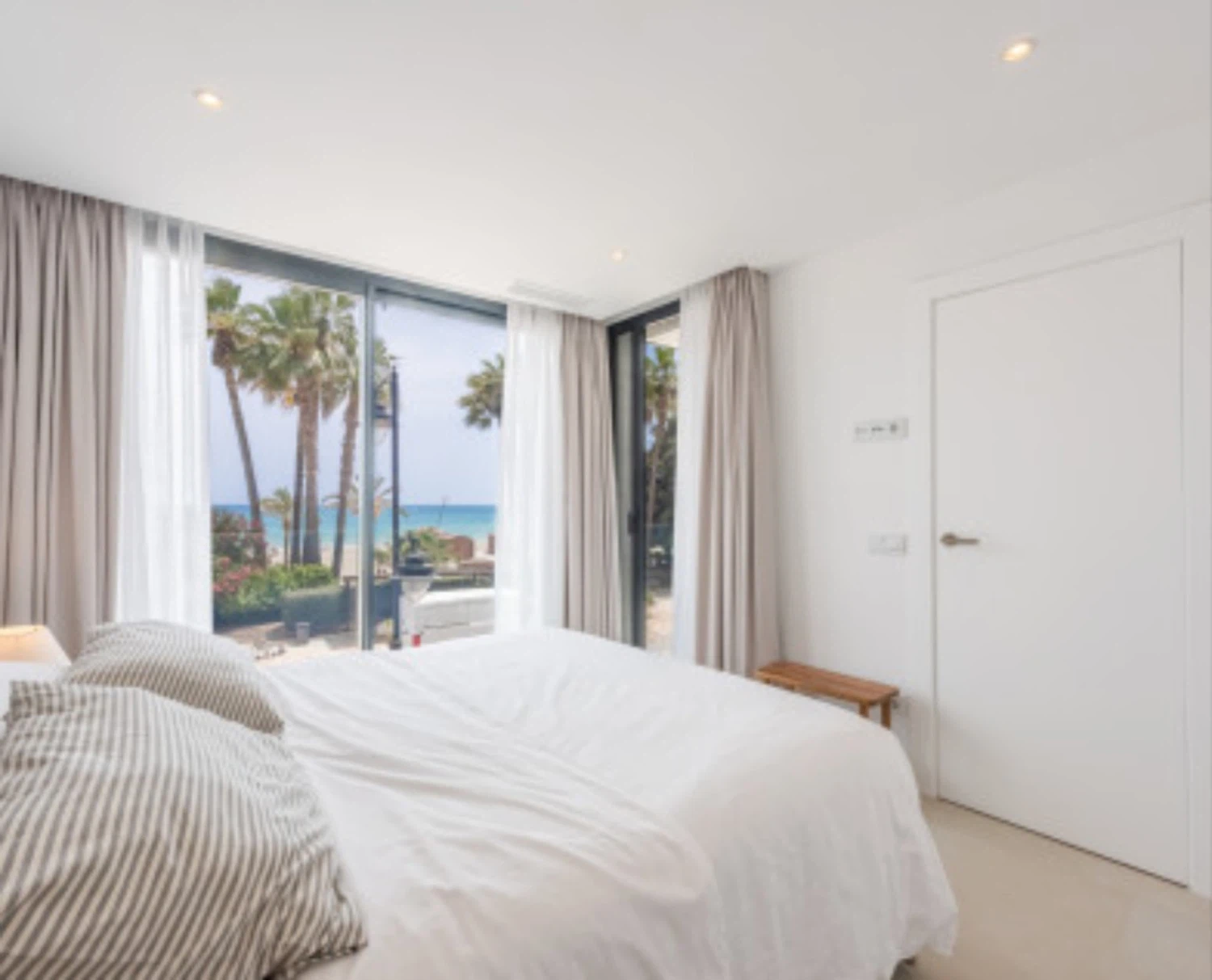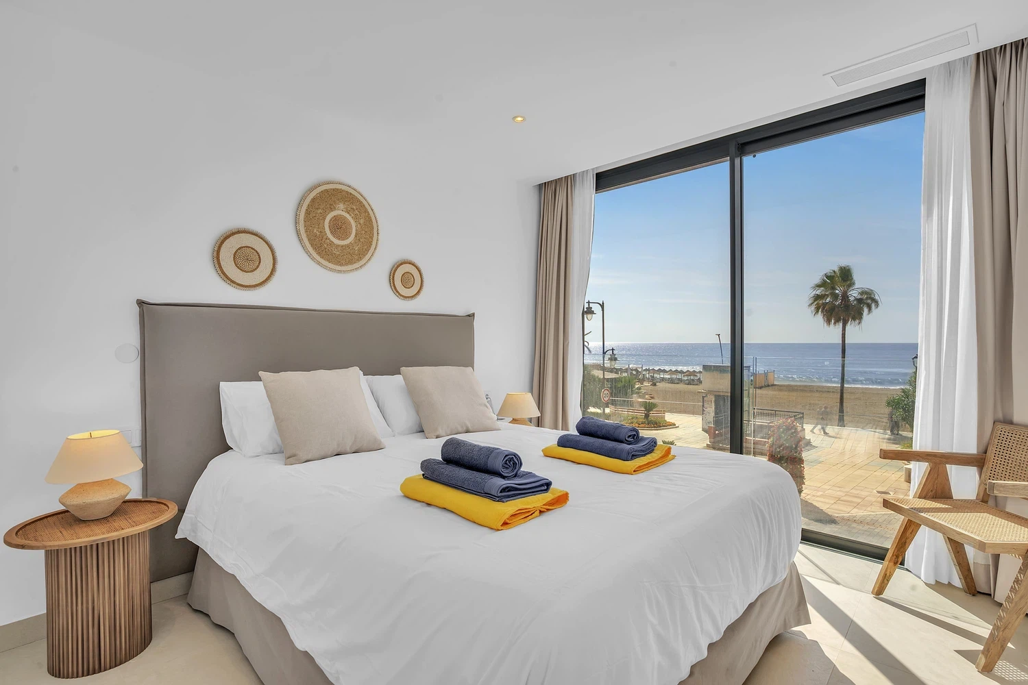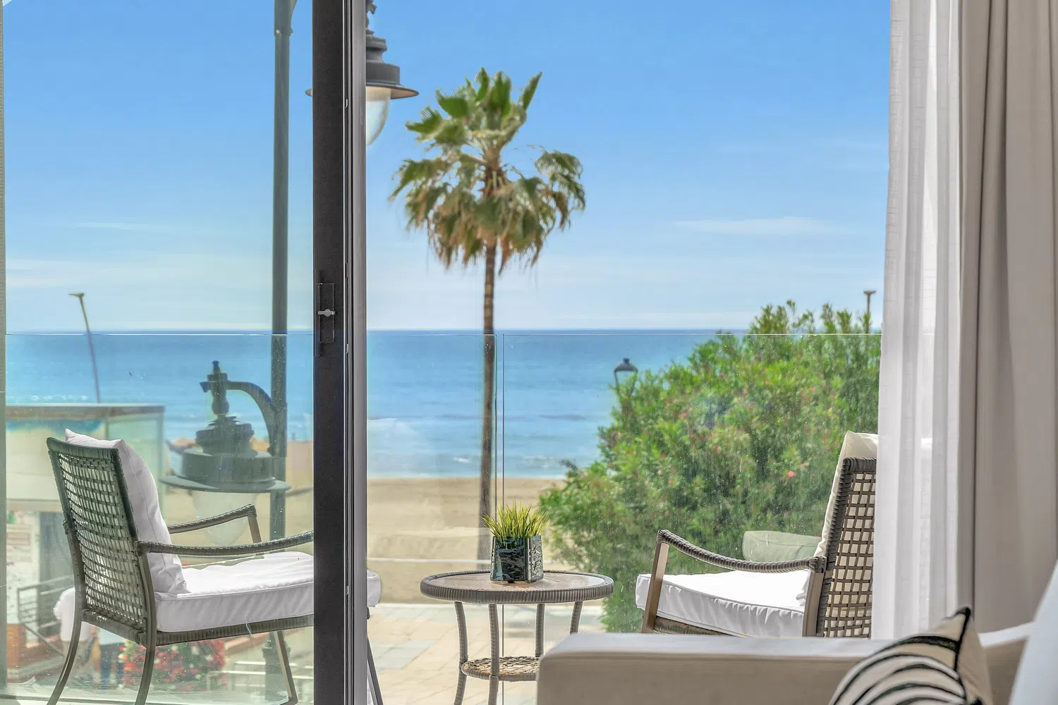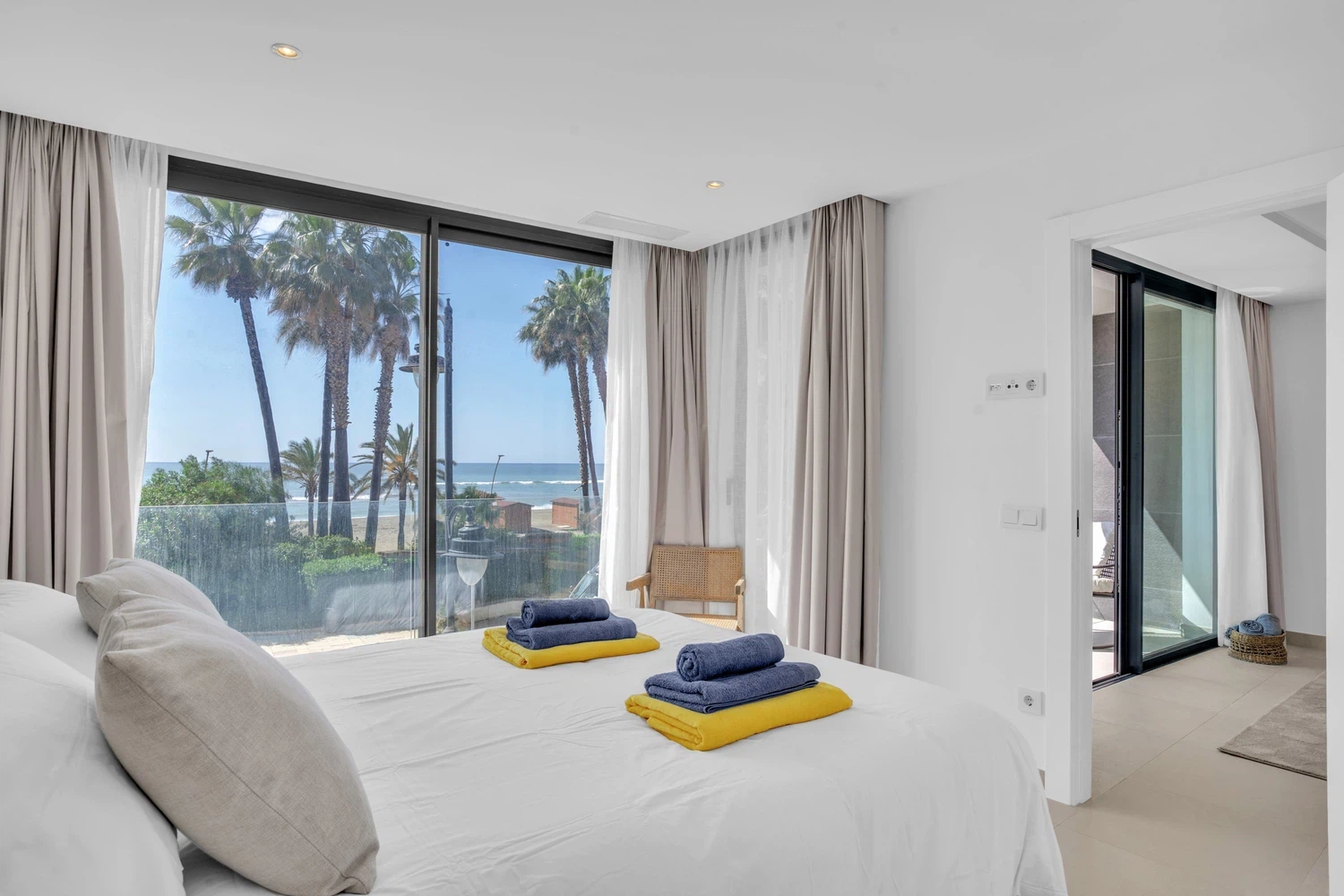 El apartamento cuenta con un diseño contemporáneo de planta abierta que combina perfectamente la cocina totalmente equipada con una elegante barra de desayuno, un área de comedor con estilo y una amplia sala de estar. Ambos dormitorios incluyen baños en suite, garantizando comodidad y privacidad. El dormitorio principal y la sala de estar dan a una terraza privada, donde las vistas abiertas al mar crean el telón de fondo perfecto para relajarse o entretener.