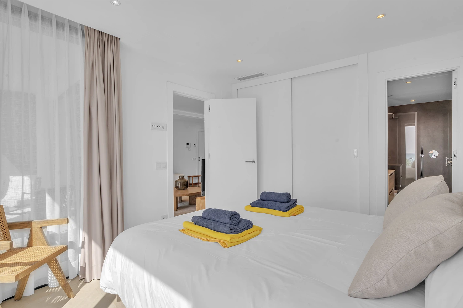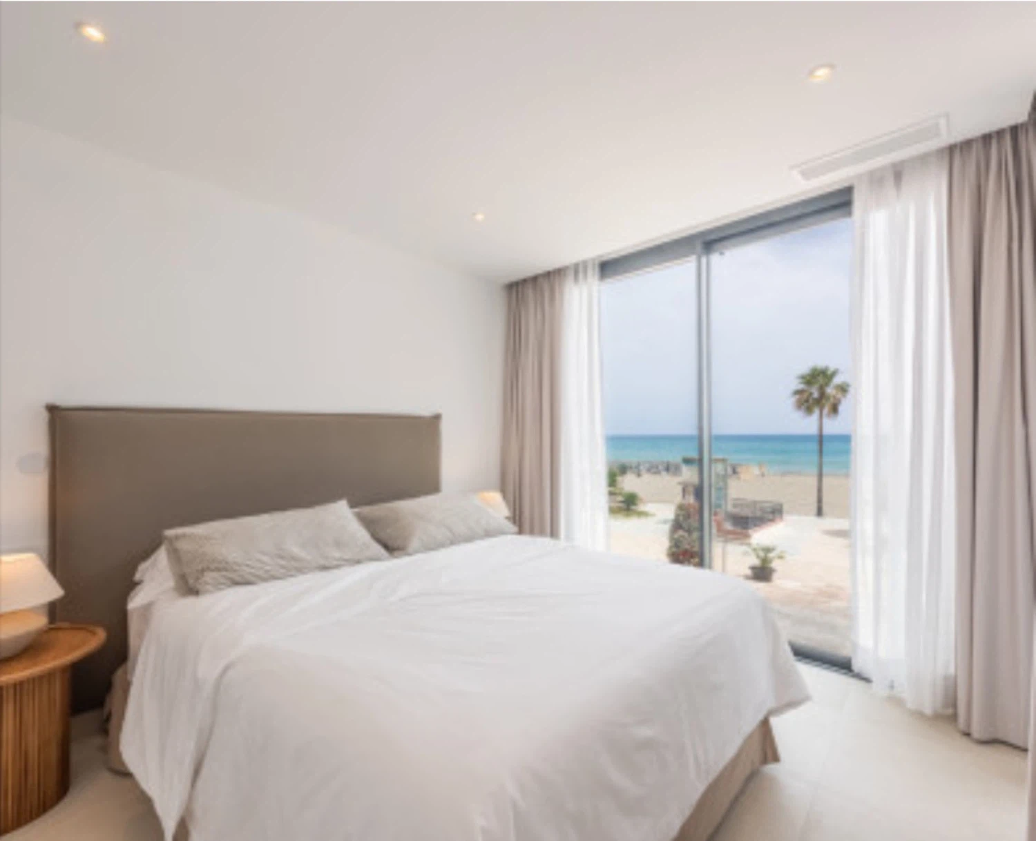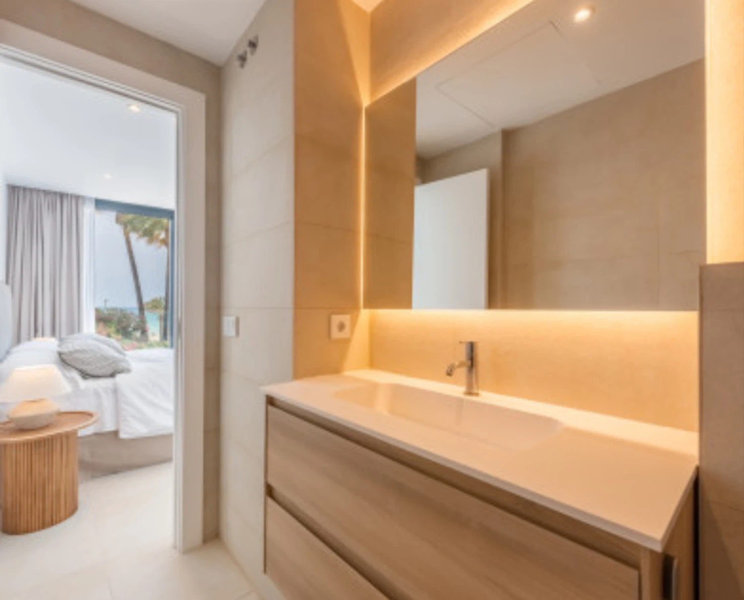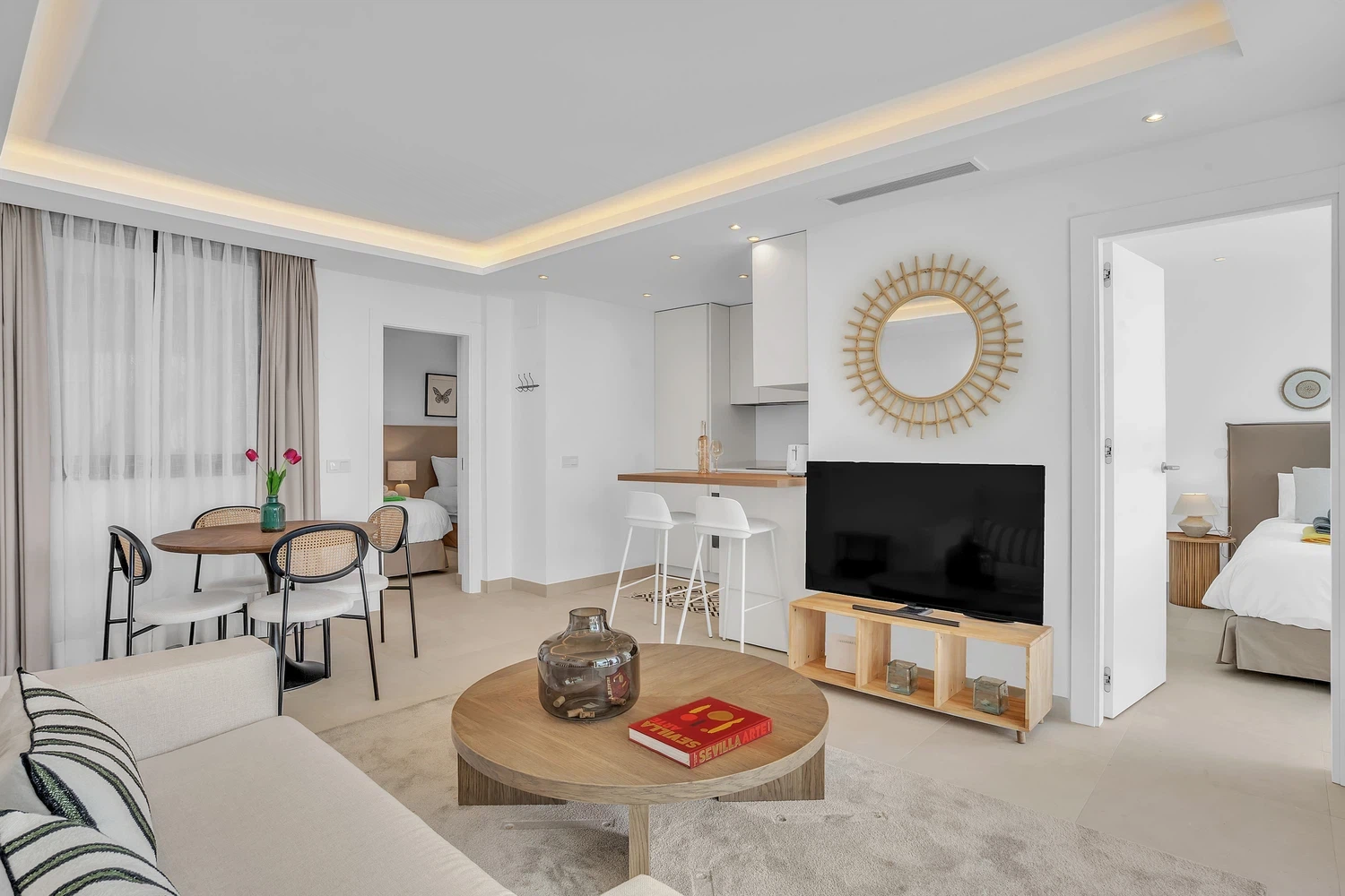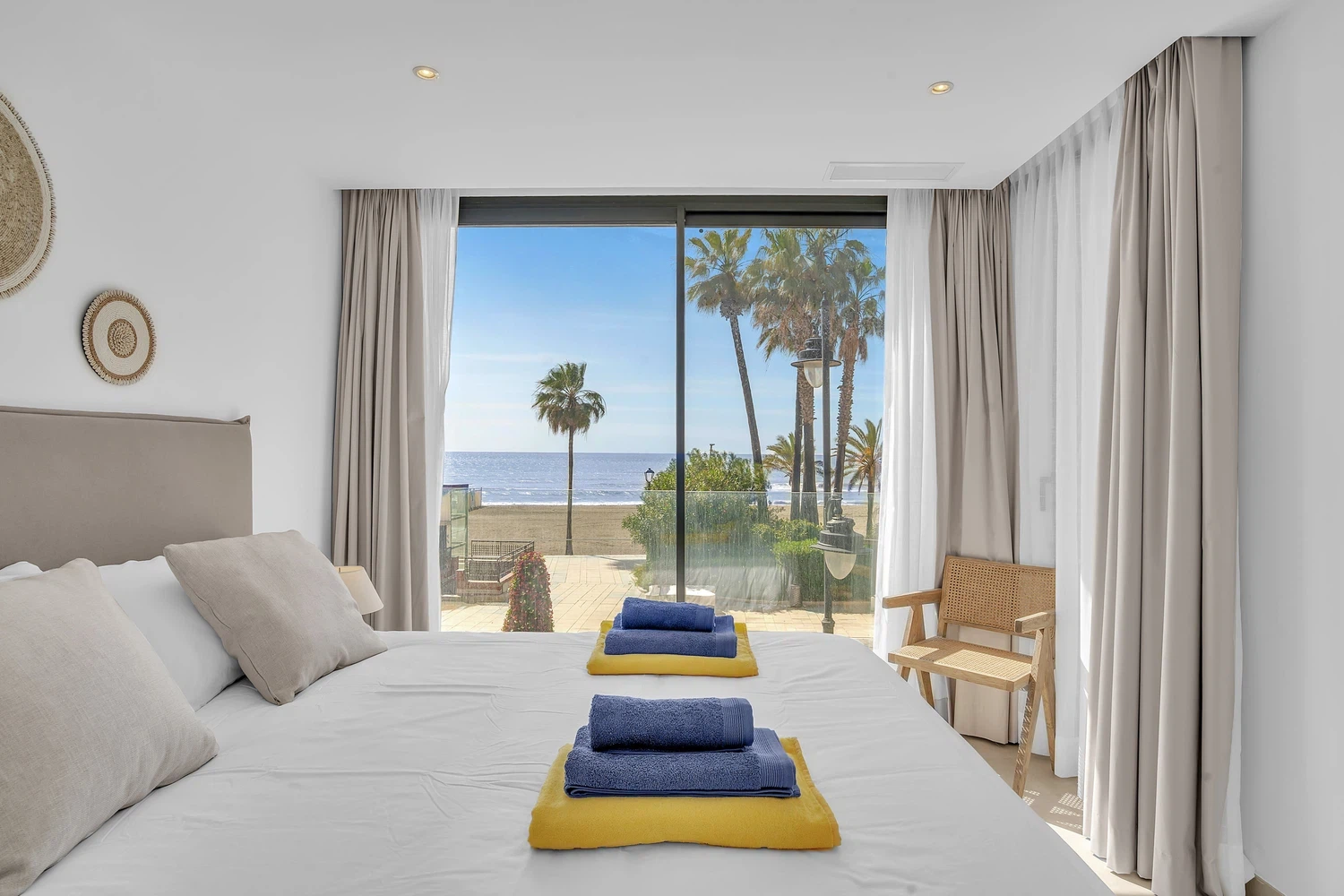 El apartamento cuenta con un diseño contemporáneo de planta abierta que combina perfectamente la cocina totalmente equipada con una elegante barra de desayuno, un área de comedor con estilo y una amplia sala de estar. Ambos dormitorios incluyen baños en suite, garantizando comodidad y privacidad. El dormitorio principal y la sala de estar dan a una terraza privada, donde las vistas abiertas al mar crean el telón de fondo perfecto para relajarse o entretener.