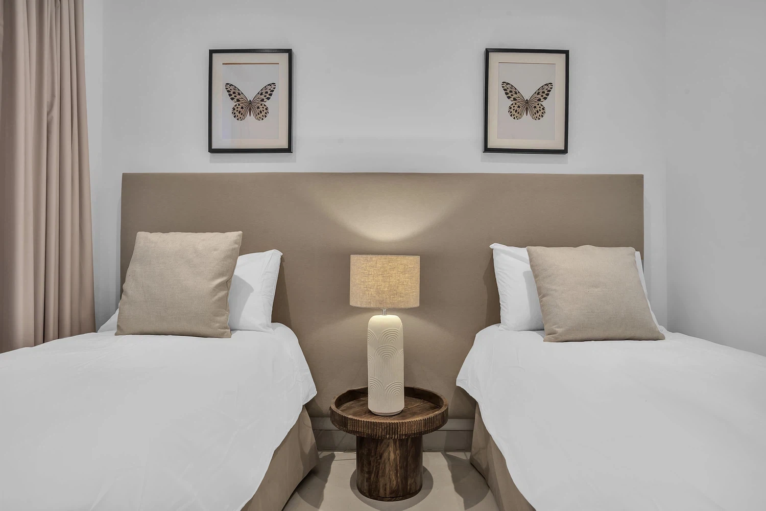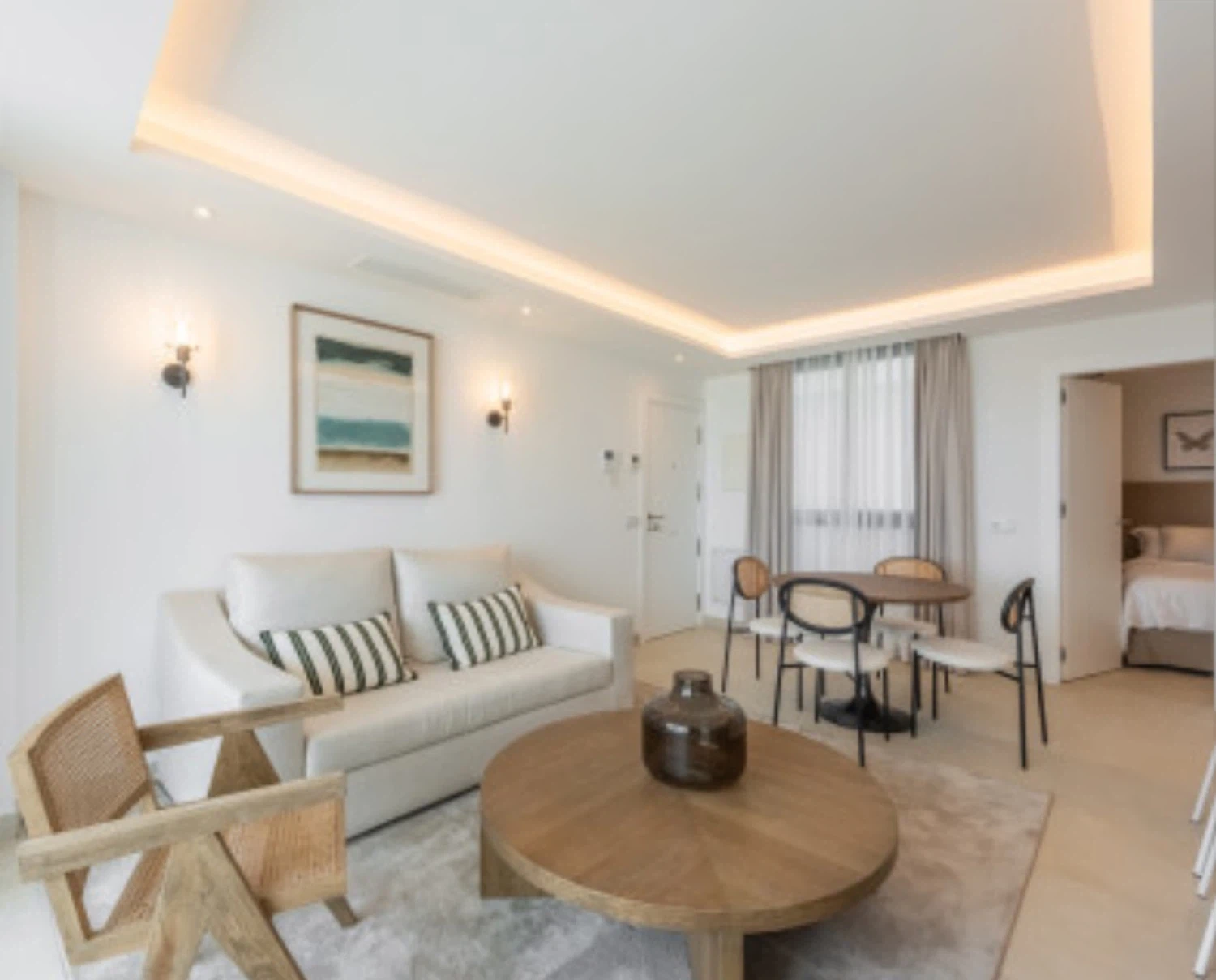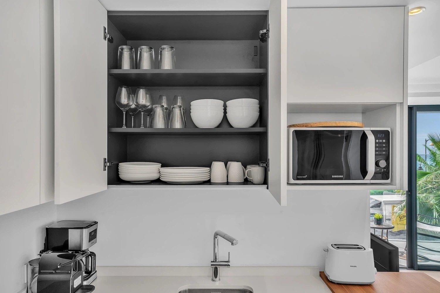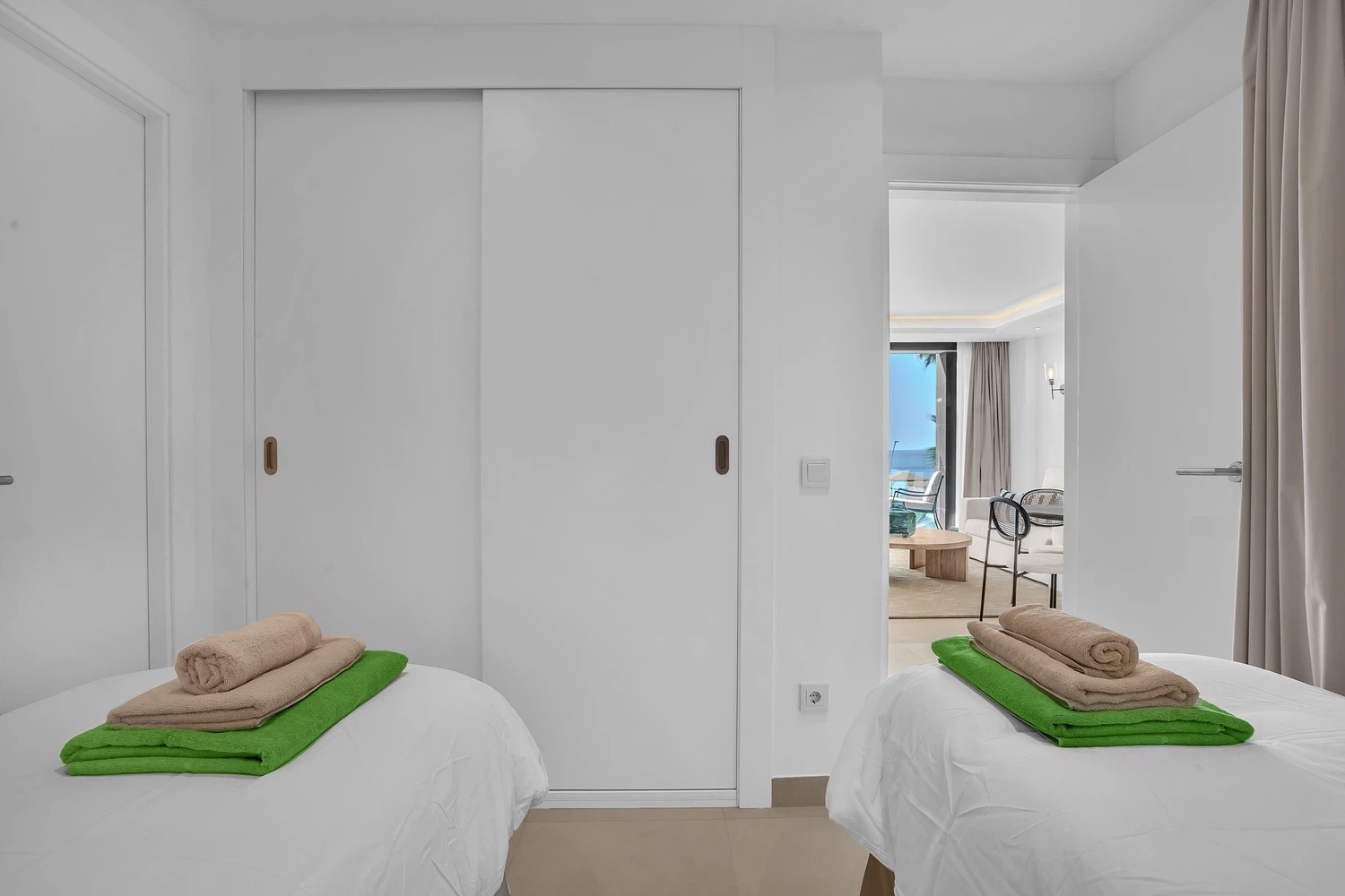 El apartamento cuenta con un diseño contemporáneo de planta abierta que combina perfectamente la cocina totalmente equipada con una elegante barra de desayuno, un área de comedor con estilo y una amplia sala de estar. Ambos dormitorios incluyen baños en suite, garantizando comodidad y privacidad. El dormitorio principal y la sala de estar dan a una terraza privada, donde las vistas abiertas al mar crean el telón de fondo perfecto para relajarse o entretener.