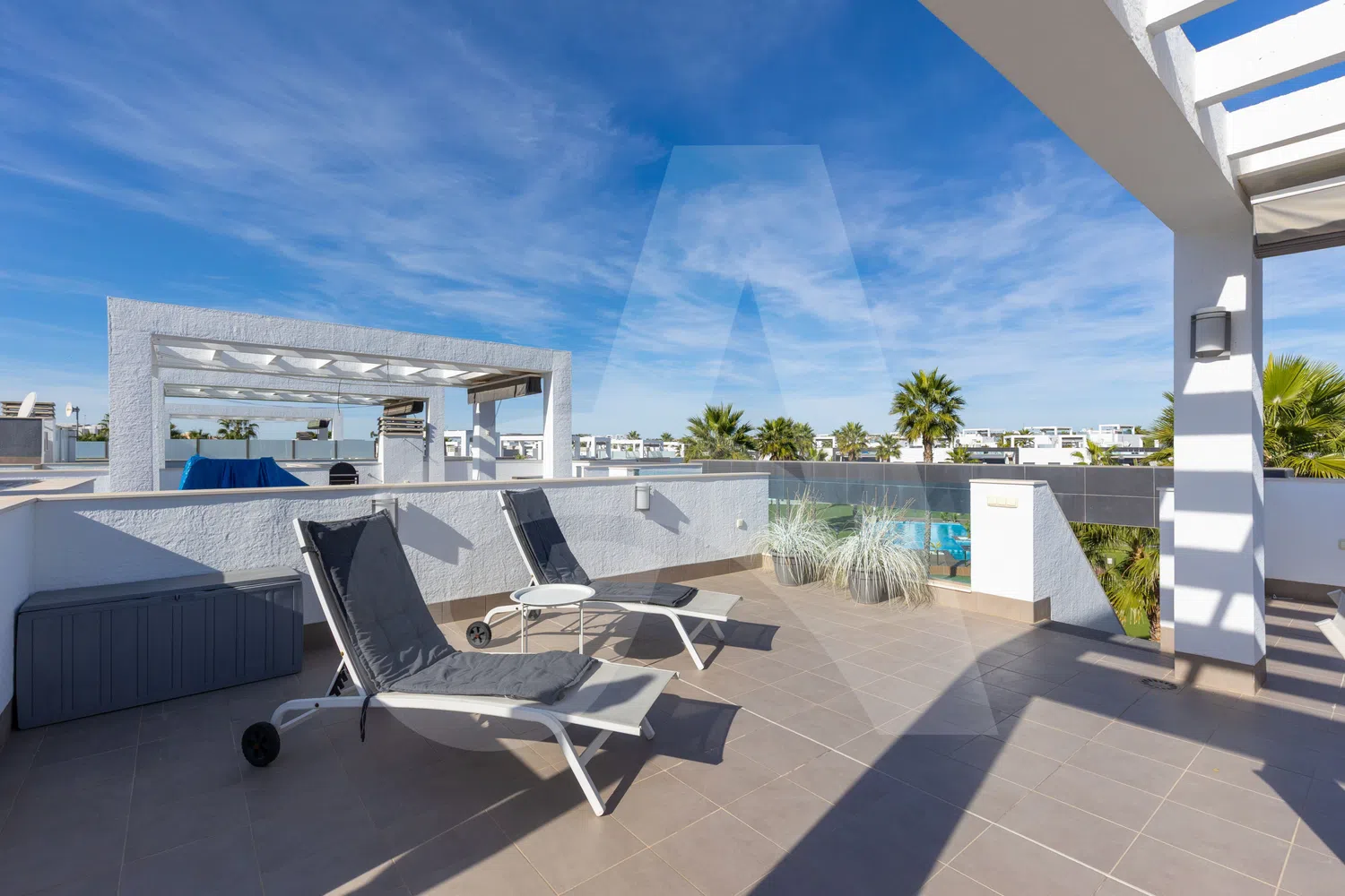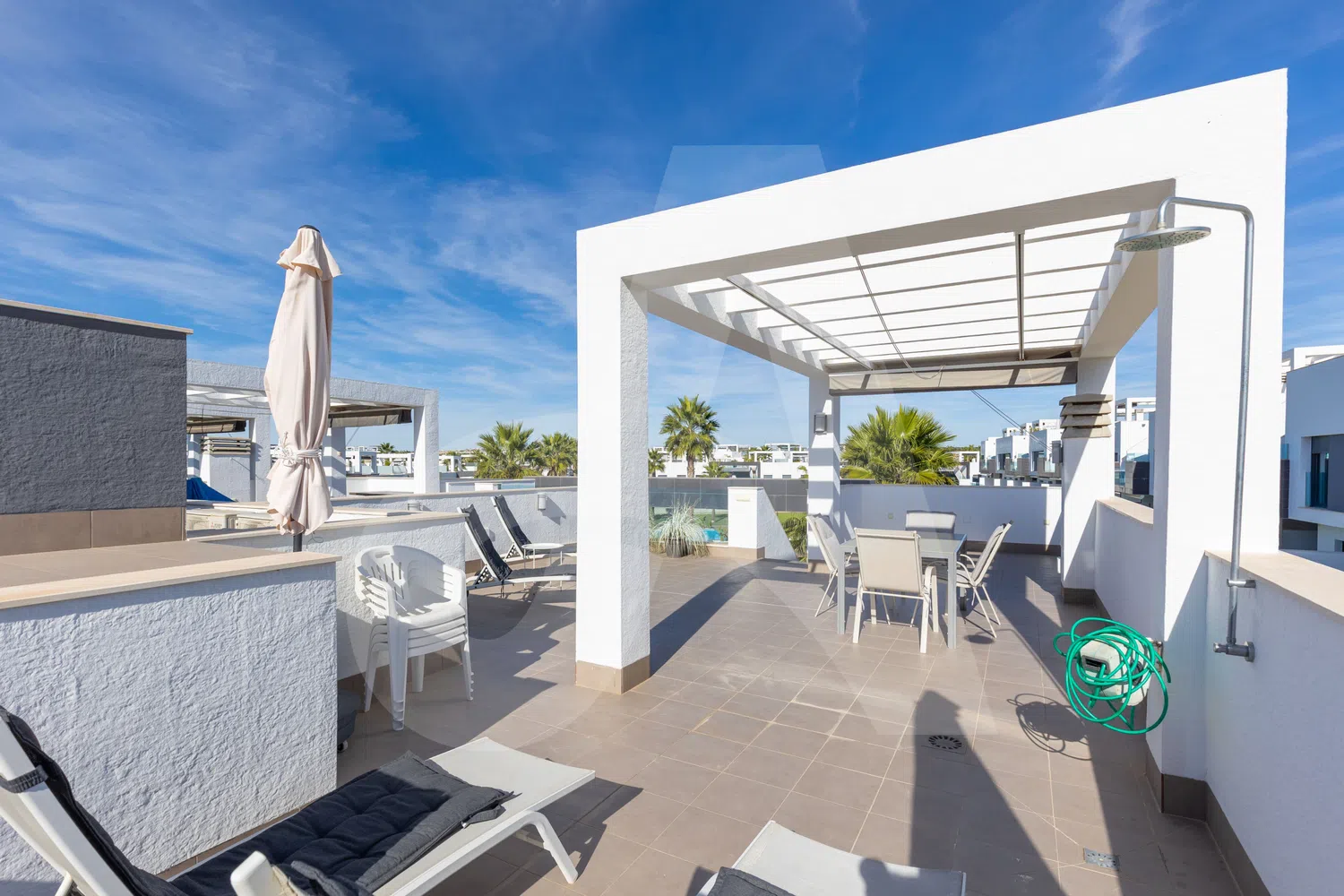 🏖 Terraza privada XXL en la azotea con zona de descanso, tumbonas, sombrillas y comedor al aire libre