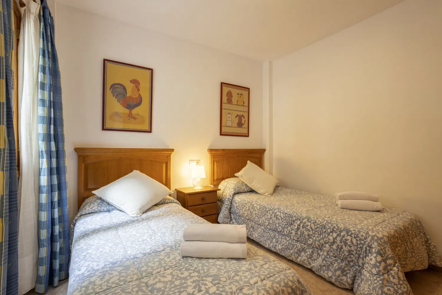El apartamento cuenta con 3 habitaciones dobles,una con cama de matrimonio, otra con 2 camas individuales y otra con litera, 2 baños con bañera, ofreciendo espacio y comodidad para hasta 6 personas. Podrás disfrutar de una cómoda estancia gracias a las instalaciones, que incluyen aire acondicionado, WiFi, TV por satélite y una completa cocina americana equipada con todos los electrodomésticos necesarios.