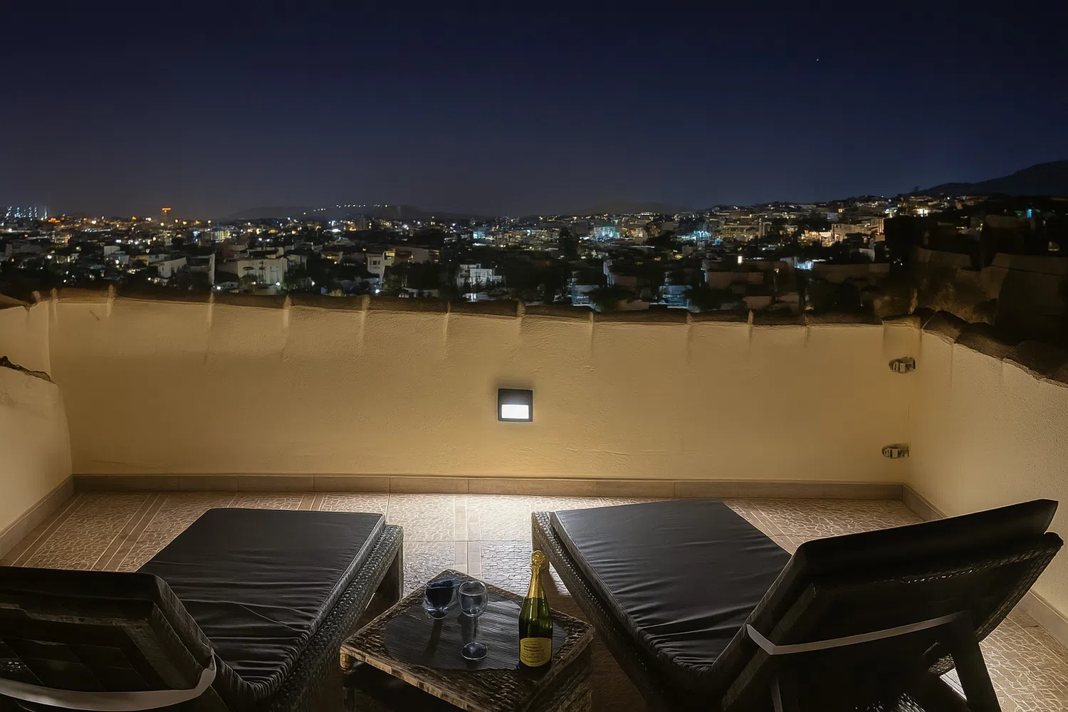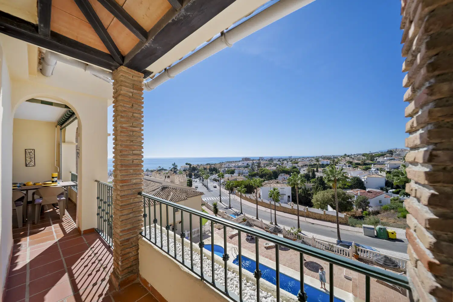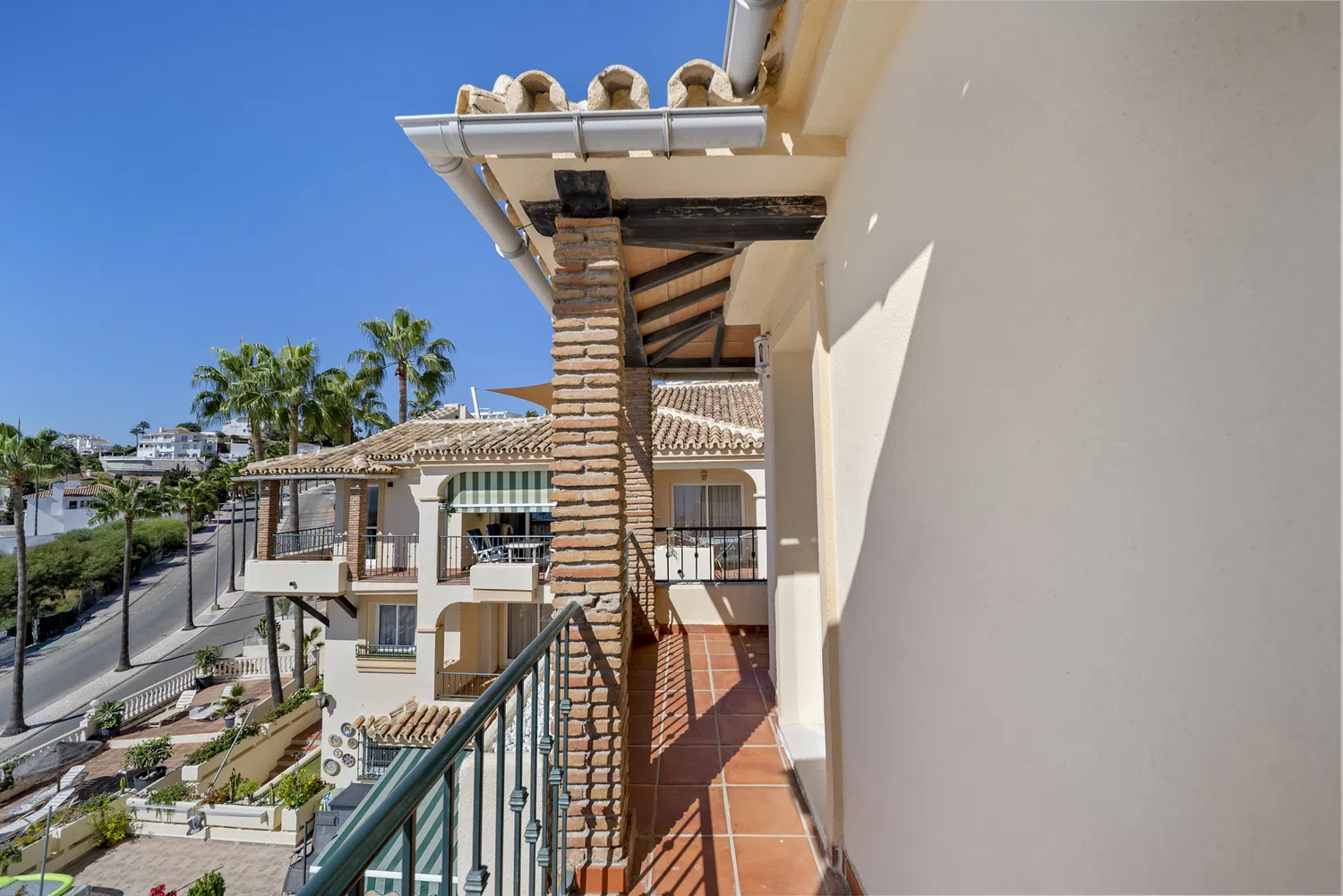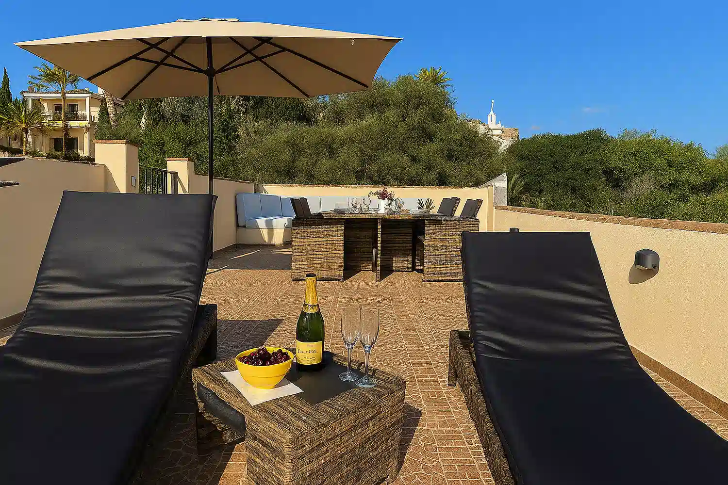 Una escalera desde el balcón conduce a una terraza privada en la azotea con cómodos muebles de jardín, ideal para cenar o tomar el sol. Incluso hay instalada una ducha exterior.