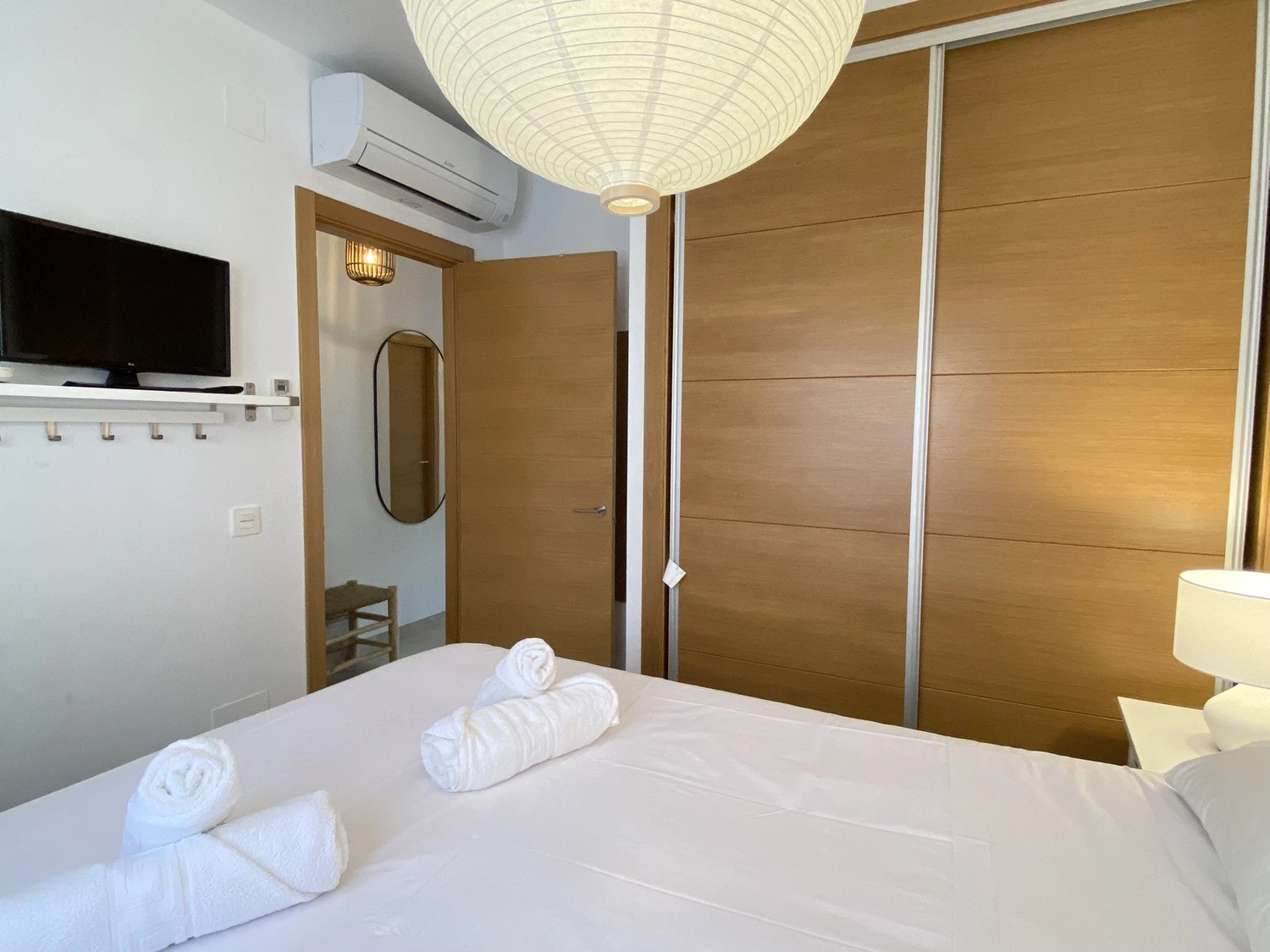 La primera planta consta de un dormitorio con camas literas, un baño con ducha y un dormitorio con cama de matrimonio. Acceso a la segunda terraza con una hamaca para tu descanso y una zona con mesa y sillas para disfrutar de las noches mediterráneas.