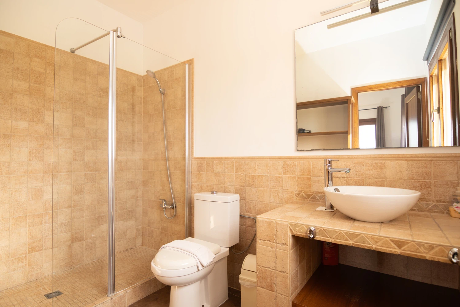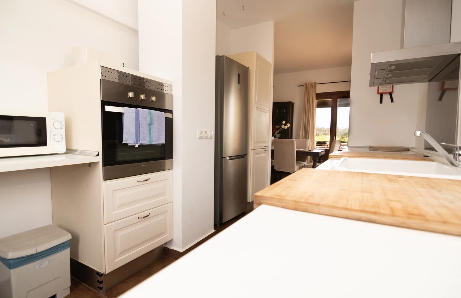 El interior de la villa está completamente equipado con aire acondicionado y bomba de calor para garantizar el confort en cualquier época del año. Dispone de tres dormitorios con capacidad para 6 personas, todos con baño en suite: dos dormitorios se encuentran en la planta baja y el tercer dormitorio en la primera planta. La distribución de camas incluye una cama doble y cuatro camas individuales, ofreciendo comodidad y privacidad para todos los huéspedes..