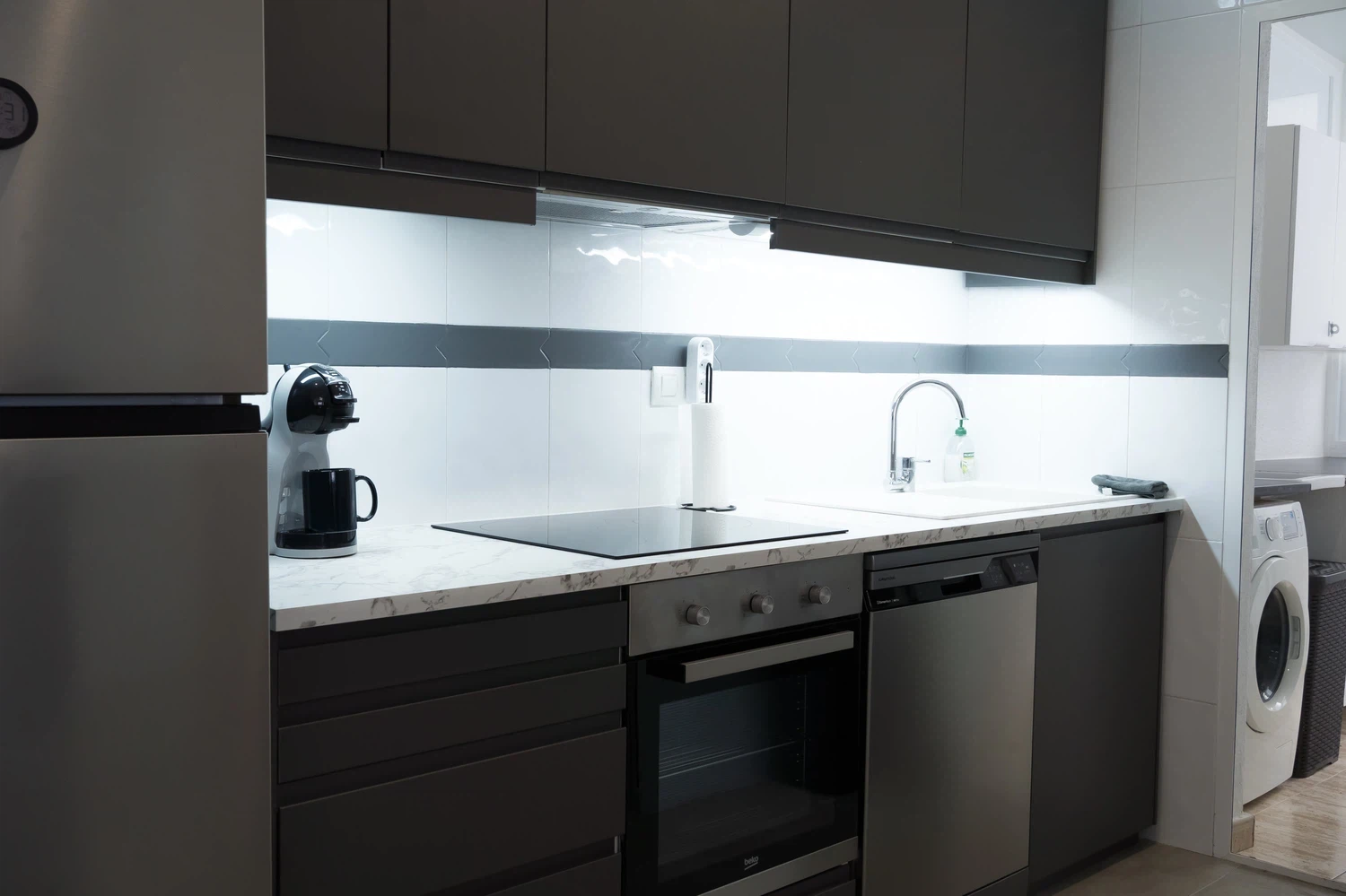 - cocina americana con cocina eléctrica, horno eléctrico, microondas, lavavajillas, refrigerador-congelador, cafetera, calentador de agua, batidor, tostador y exprimidor