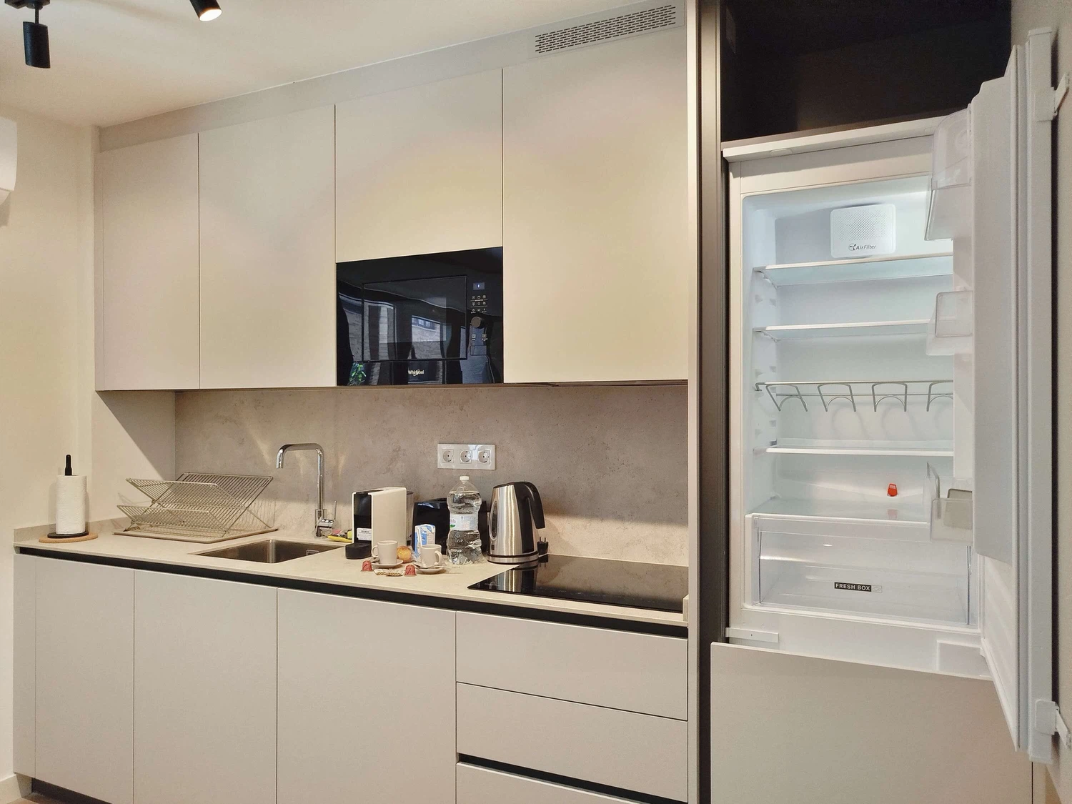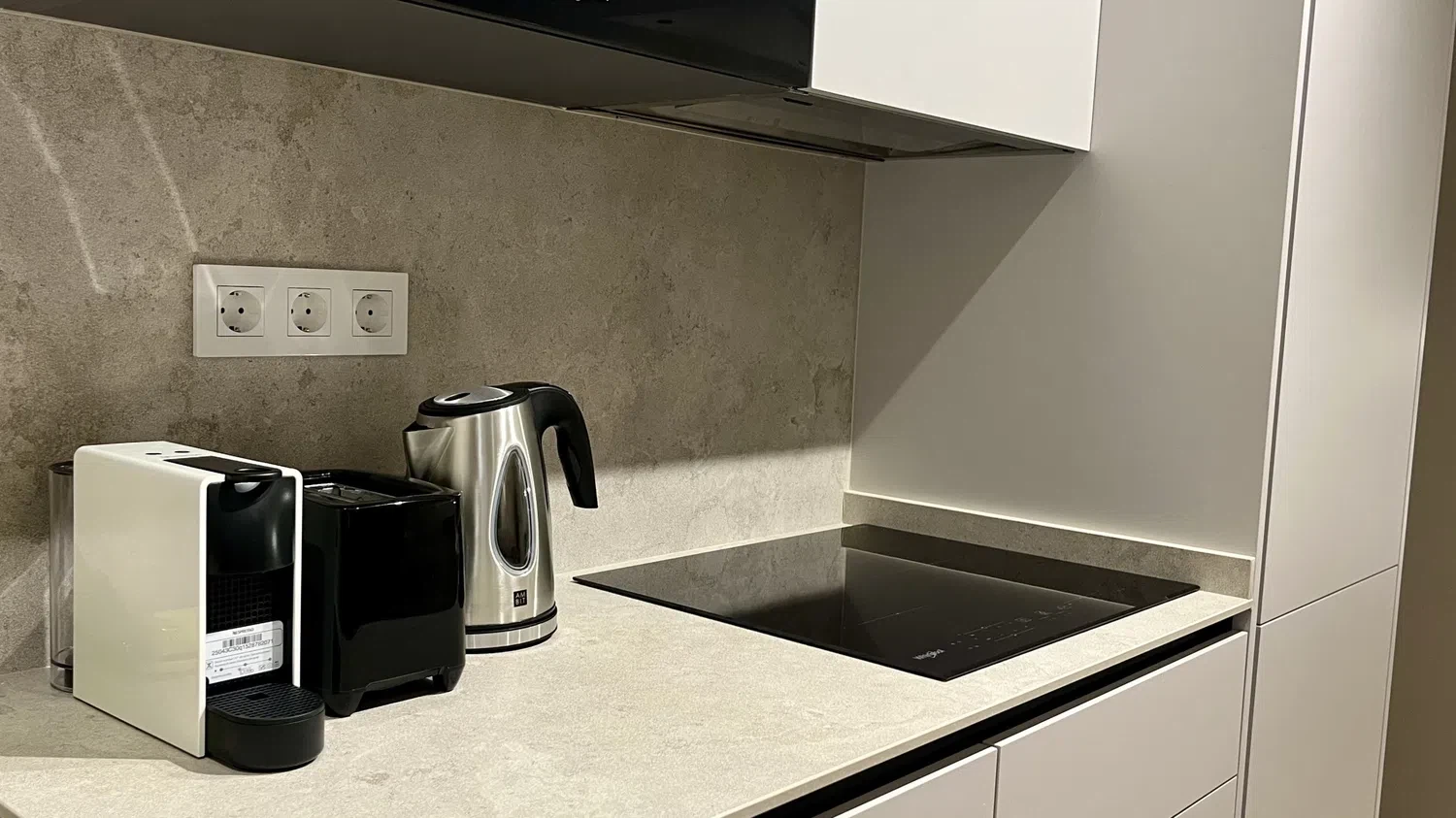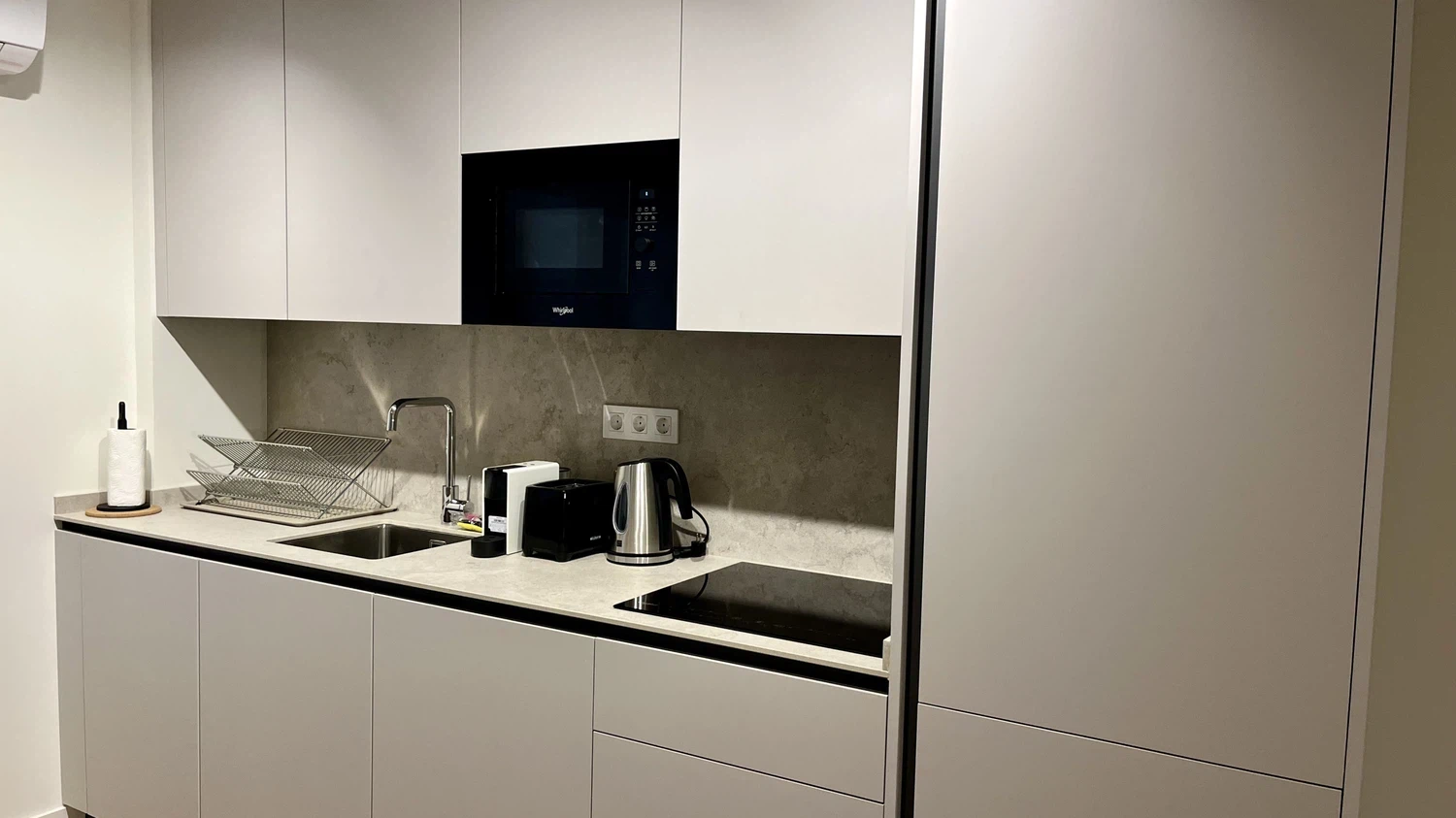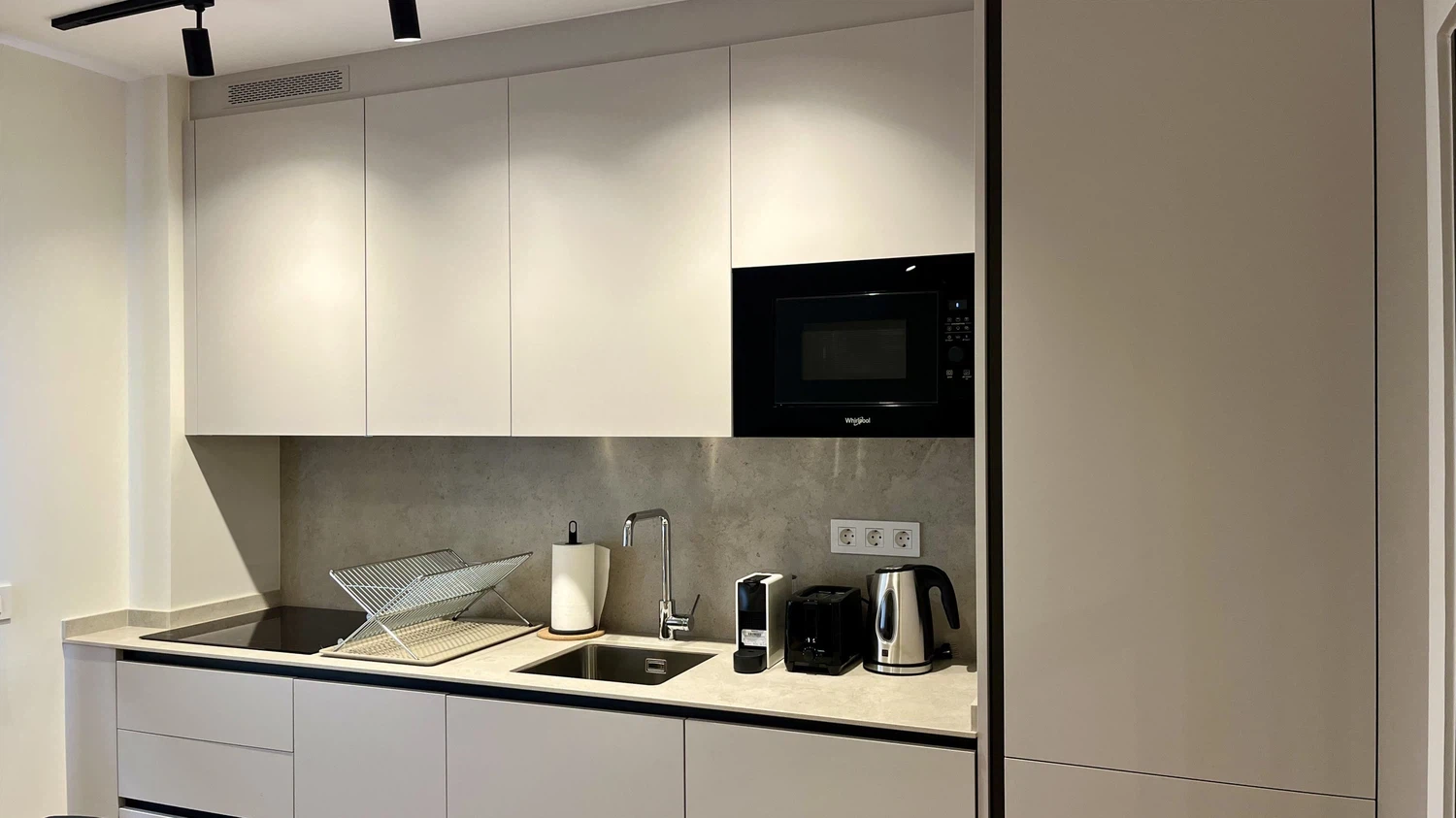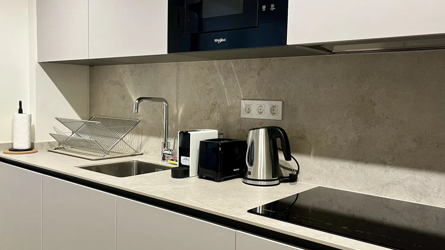 Cocina de Diseño: Esta moderna cocina está totalmente equipada con vitrocerámica, horno-microondas, frigorífico y todo el menaje necesario.