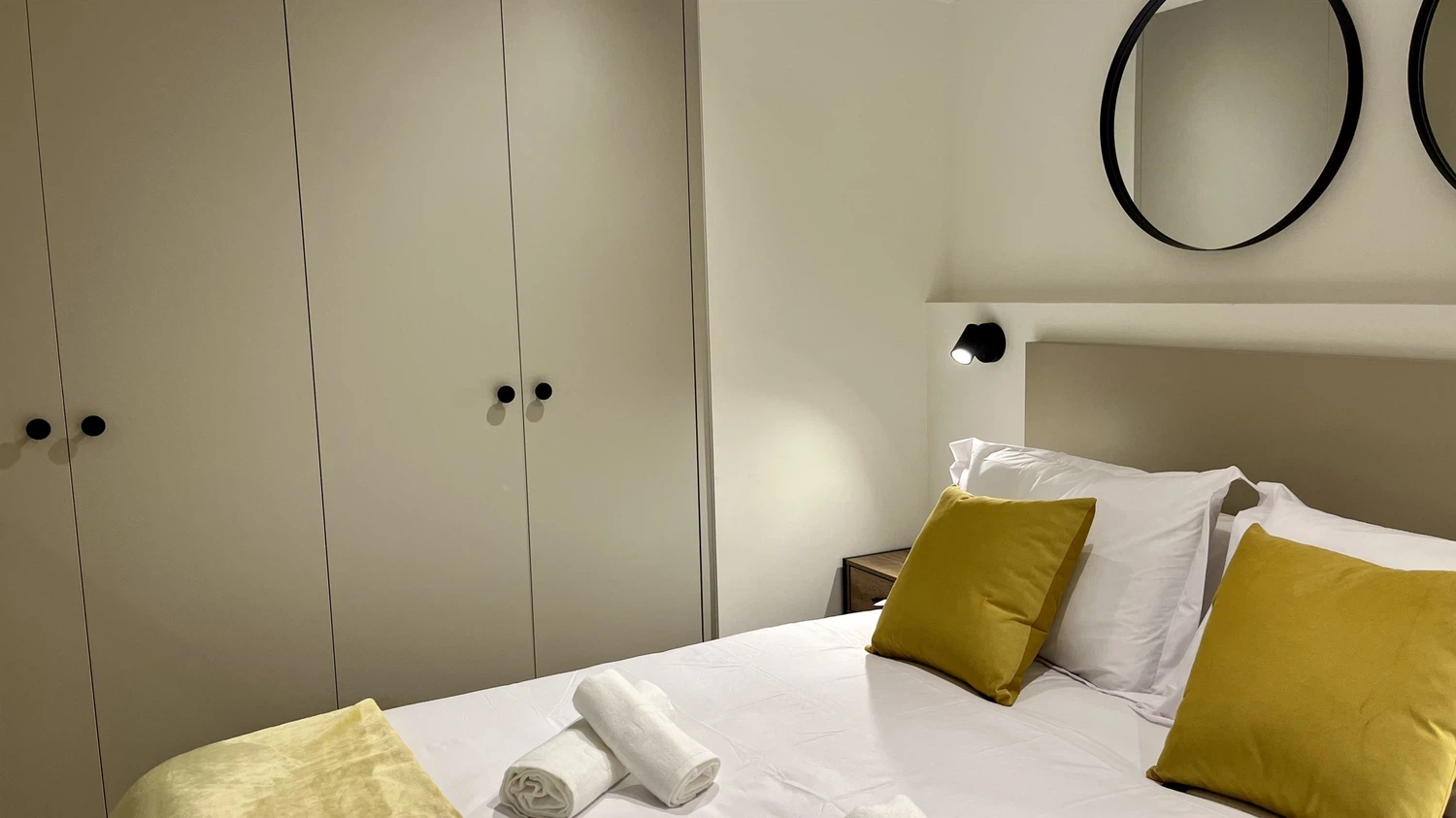 Zona de Descanso: Un espacio luminoso con una cómoda cama de matrimonio (150cm) y armarios.