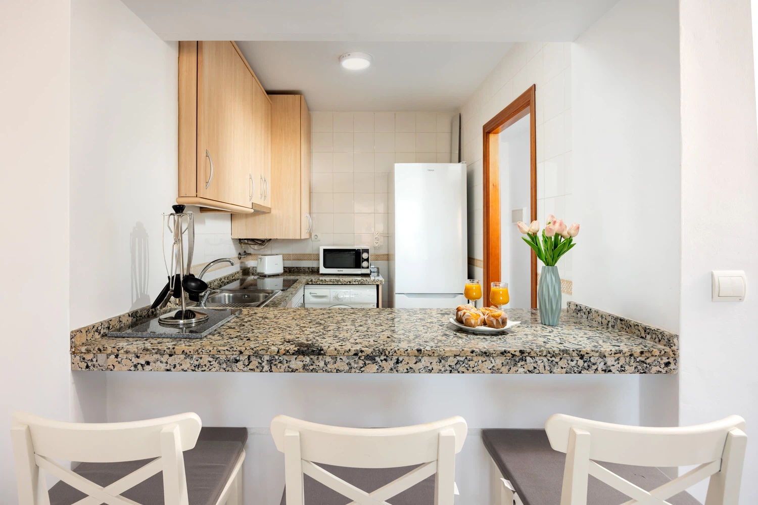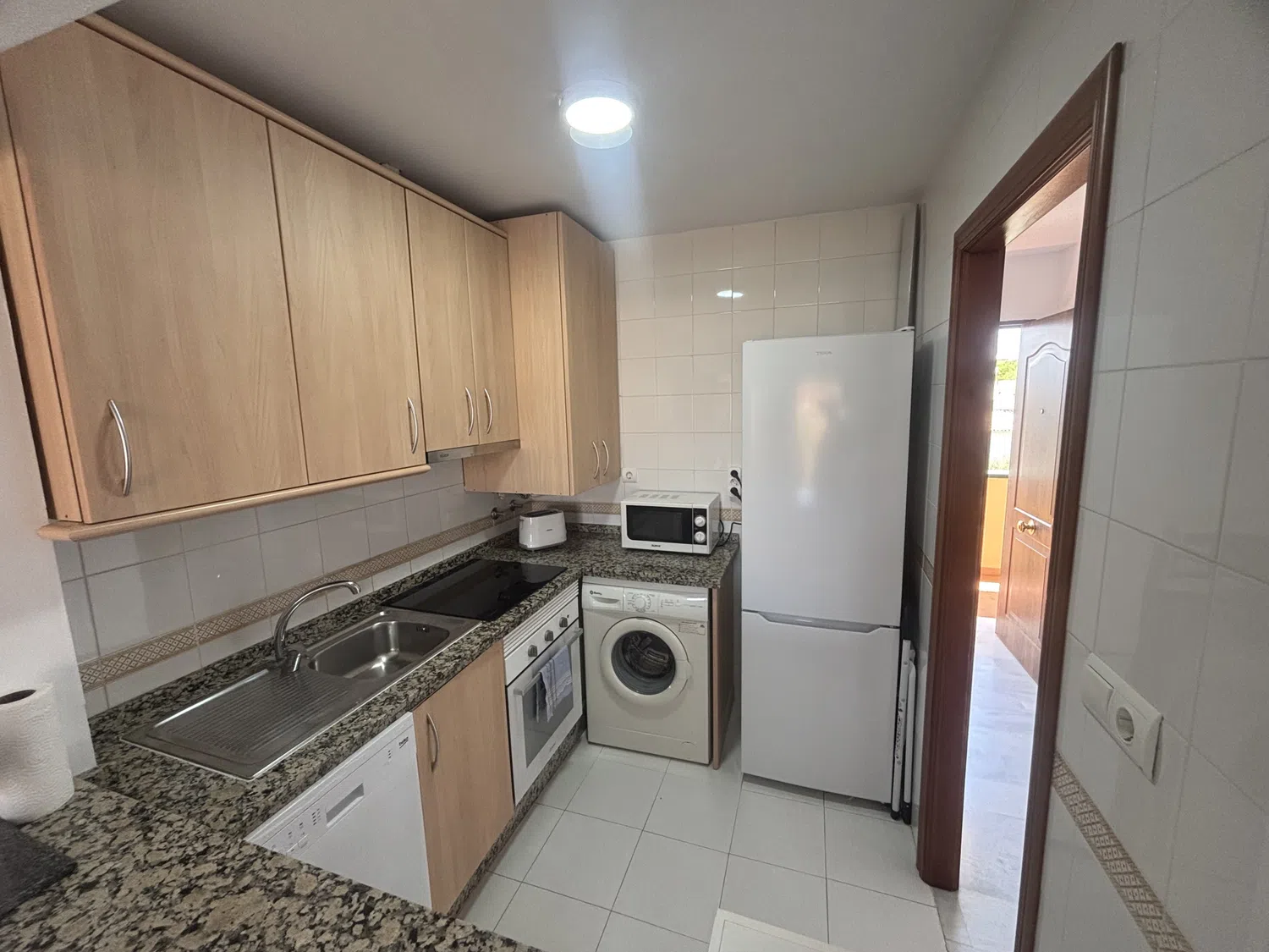 El apartamento dispone de una luminosa terraza de 11 metros cuadrados con mobiliario de jardín, perfecta para disfrutar de las vistas al mar y la piscina. La urbanización cuenta con piscina compartida y zona infantil, ideal para que los niños jueguen y los adultos se relajen.