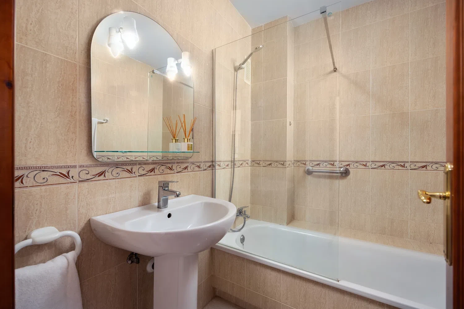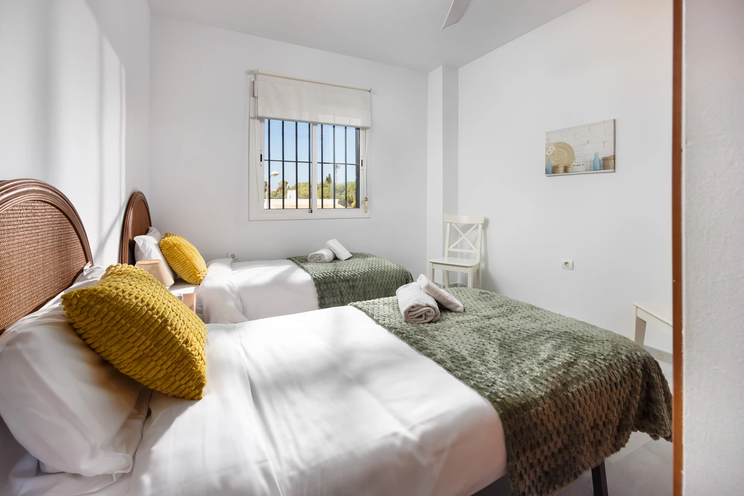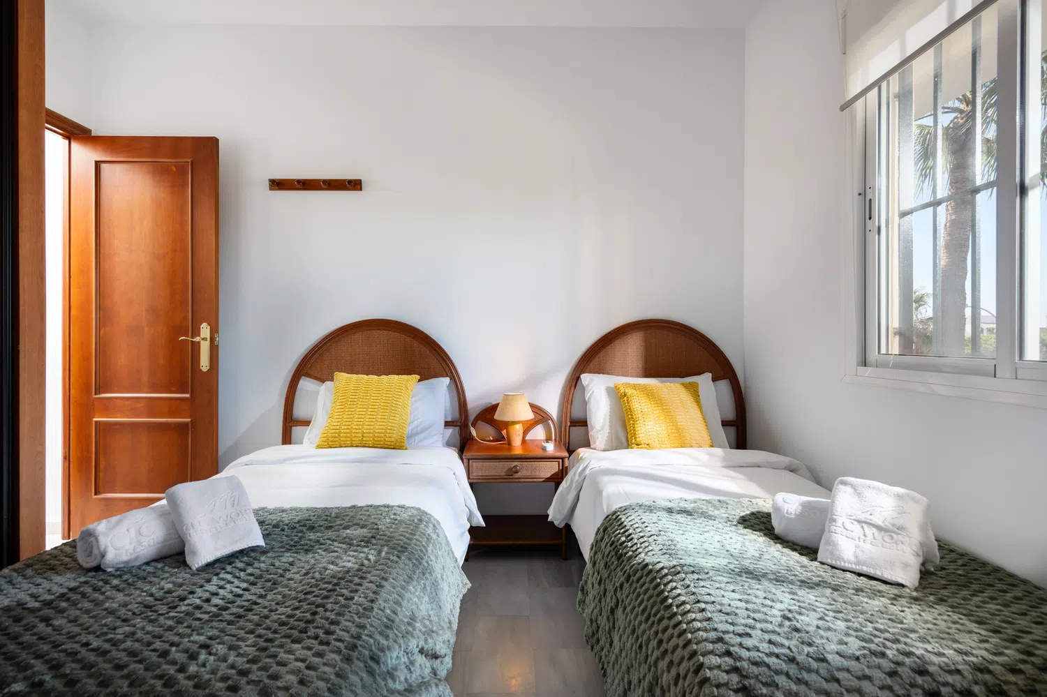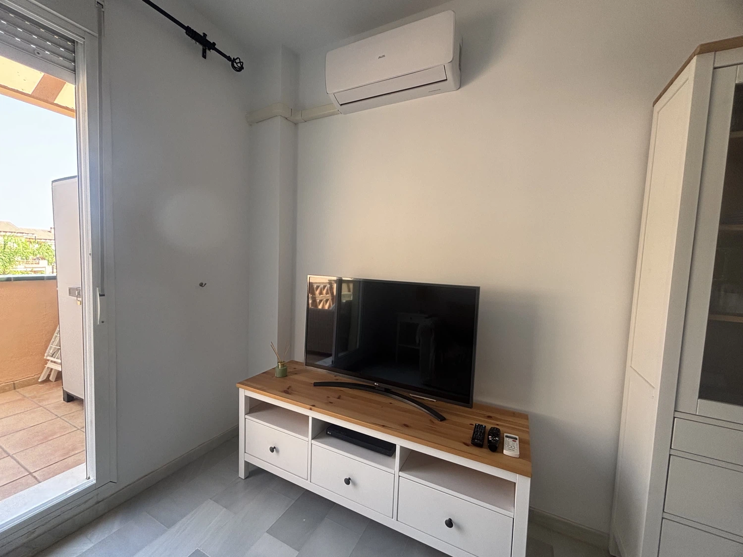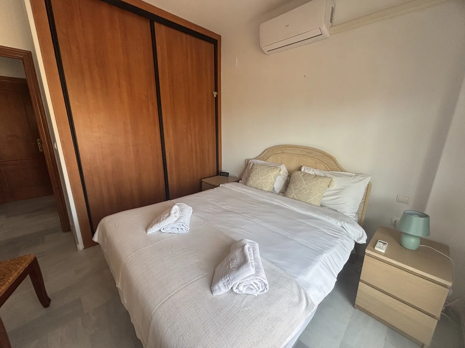 El apartamento cuenta con una distribución luminosa y funcional que incluye dos dormitorios: uno principal con cama doble y otro con dos camas individuales, además de un sofá cama doble que permite alojar cómodamente hasta 5 personas. La zona de descanso está equipada con aire acondicionado y calefacción por bomba de calor para garantizar tu confort en cualquier época del año.
