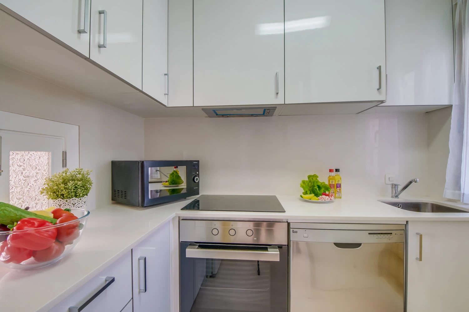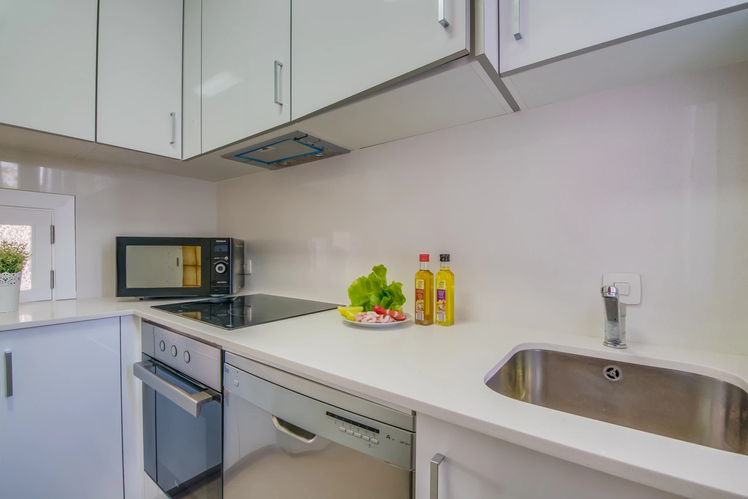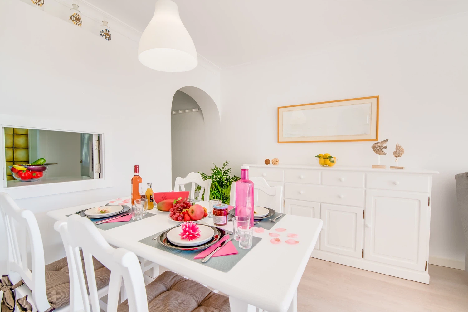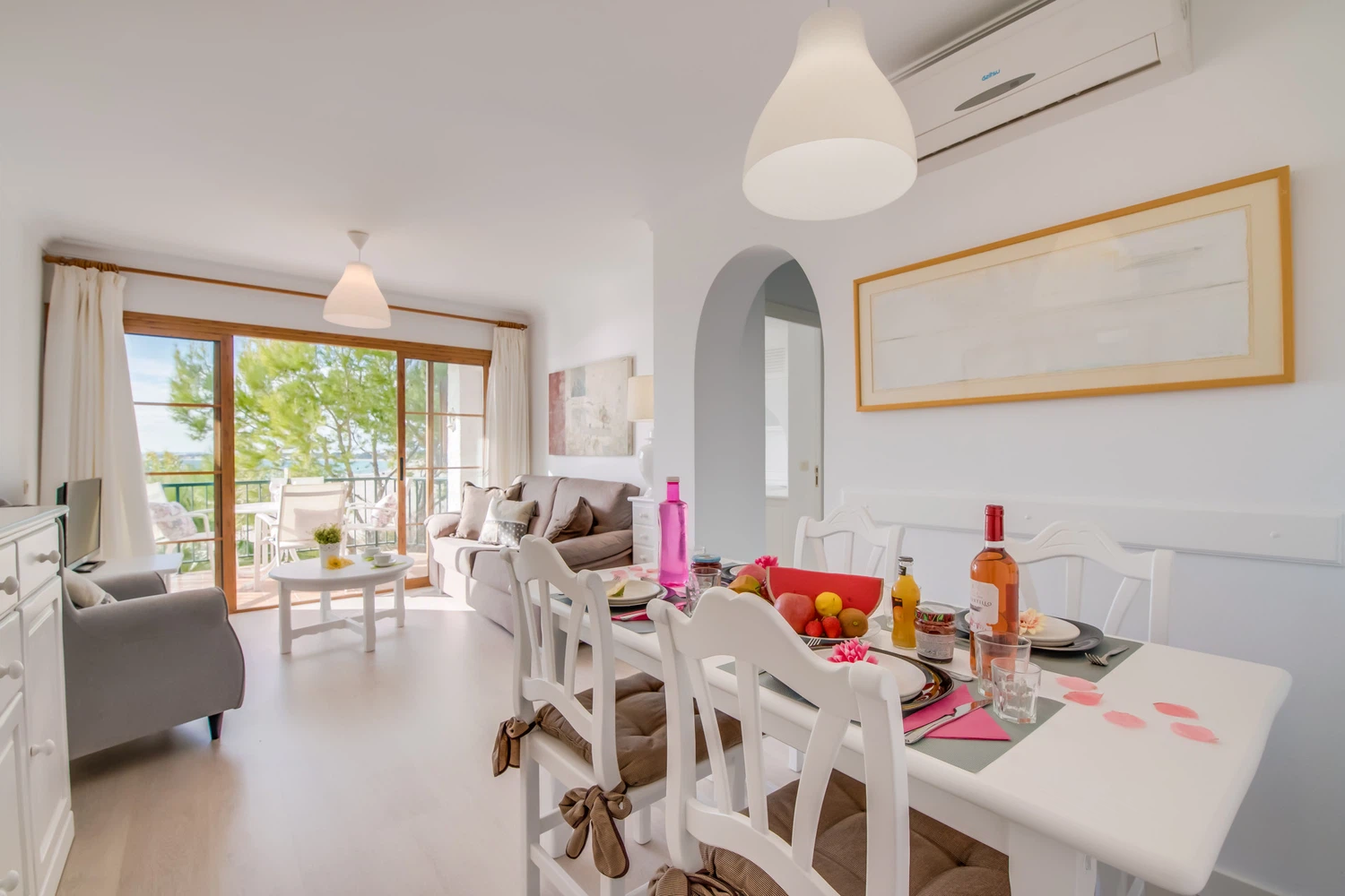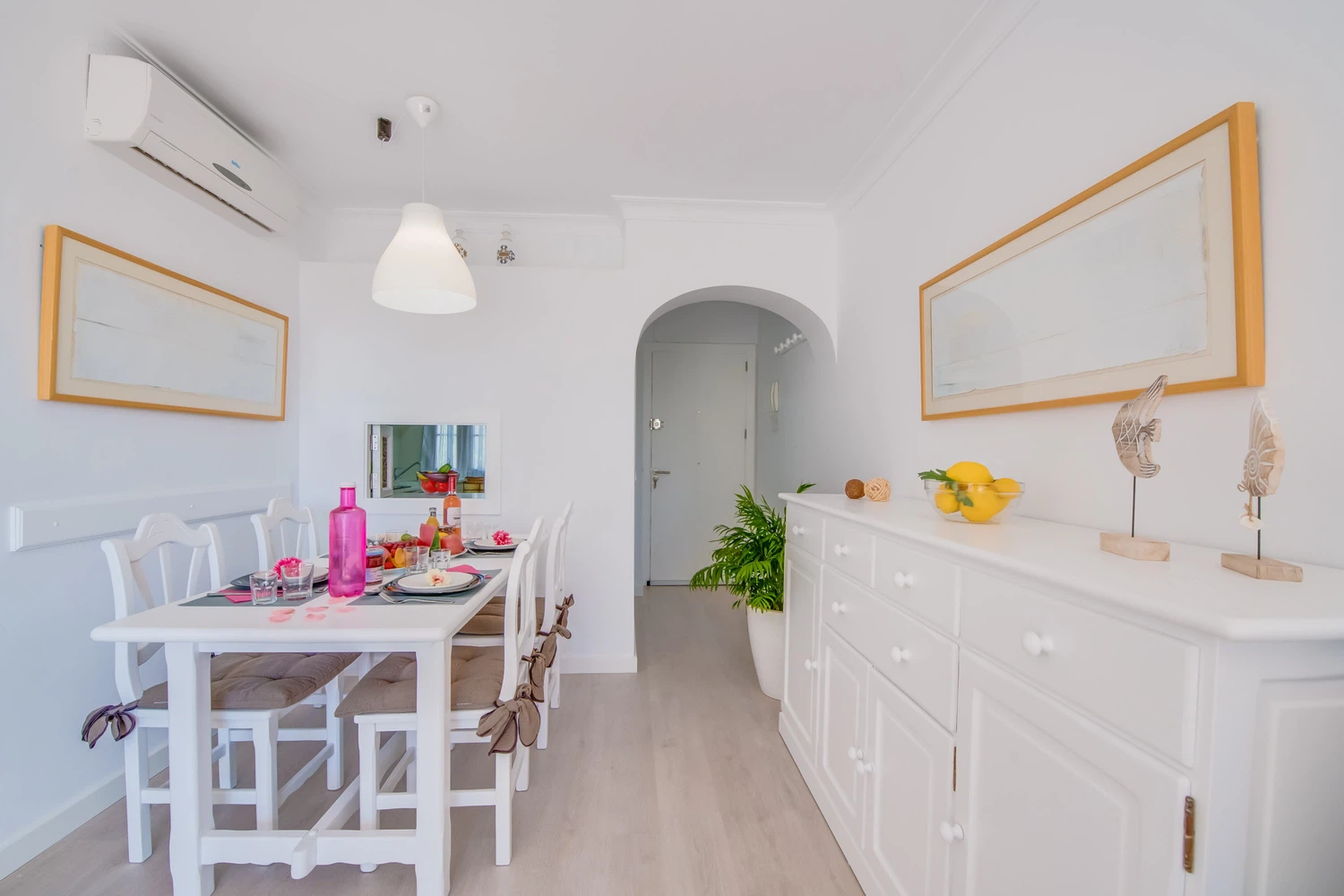 El apartamento está reformado y decorado con buen gusto en color blanco. Cuenta con una amplia terraza con una mesa con sillas para 4 personas en la que podrán pasar la mayoría del tiempo y disfrutar de las fabulosas vistas al mar. La terraza se encuentra comunicada con el salón comedor a través de un ventanal con un sofá para ver la televisión, otra mesa de comedor para 4 personas en el interior y aire acondicionado. La cocina está reformada y cuenta con todas las comodidades.
