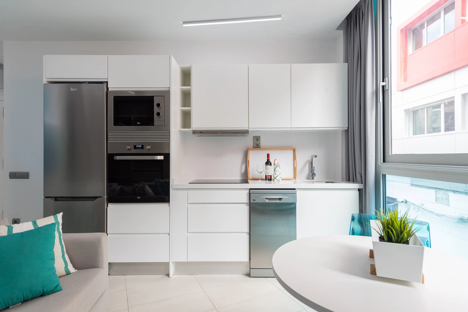 Cocina americana con vitrocerámica de 3 fuegos, nevera, microondas, horno, congelador, lavavajillas, lavadora, secadora, vajilla, cubertería, utensilios de cocina, cafetera, tostadora, hervidor de agua y exprimidor. También dispone de conexión wifi ilimitada.