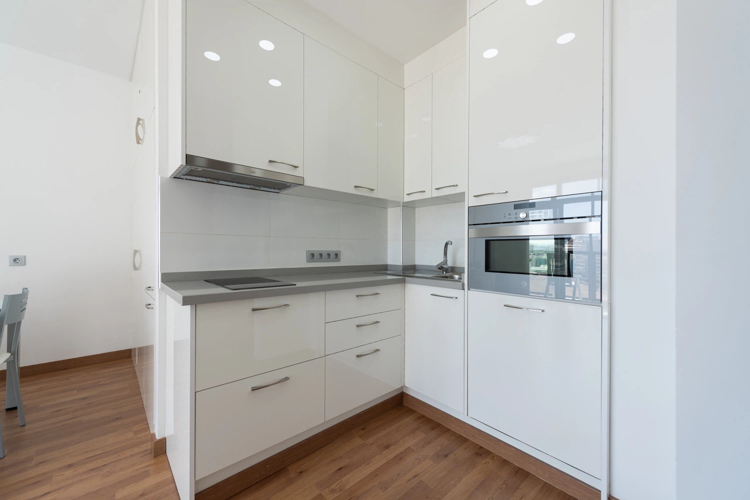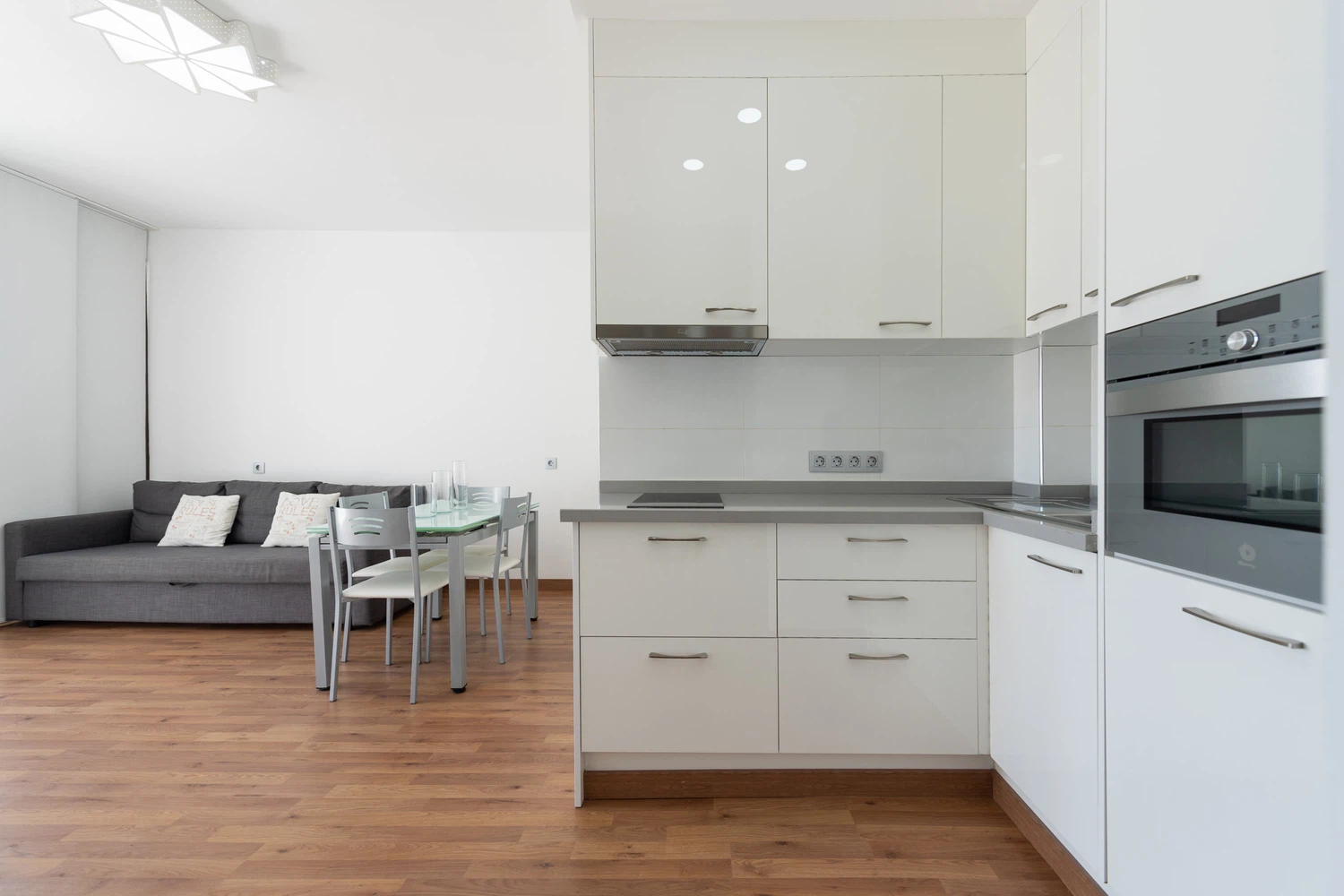 Cocina americana completa, totalmente equipada, con vitrocerámica, nevera, microondas, horno, congelador, lavadora, lavavajillas, vajilla, cuberteria, utensilios de cocina, cafetera, tostadora, hervidor de agua, exprimidor, etc.
