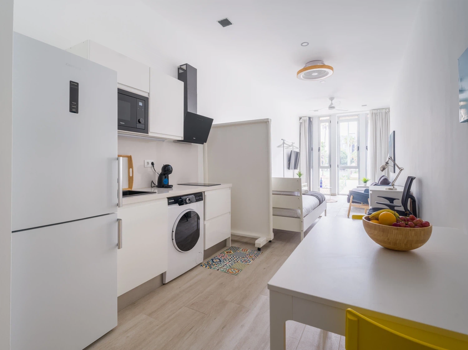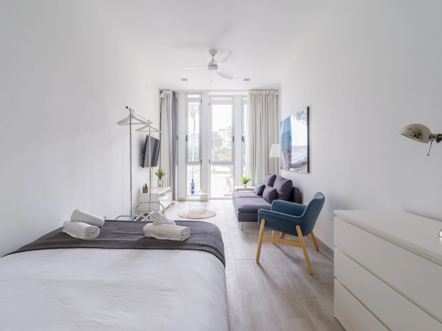 El alojamiento situado en el parque de Santa Catalina y a tan solo 500 metros de la Playa de Las Canteras posee 35 metros cuadrados y dispone de lavadora, plancha, microondas, vajilla y cubertería completa además de una smart tv y wifi.