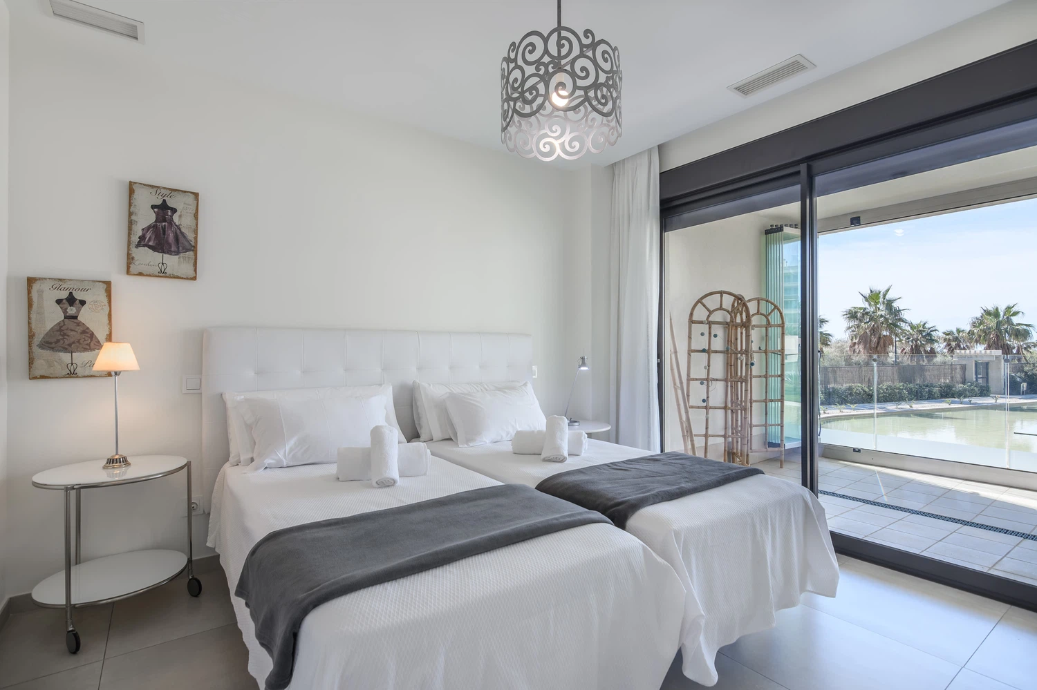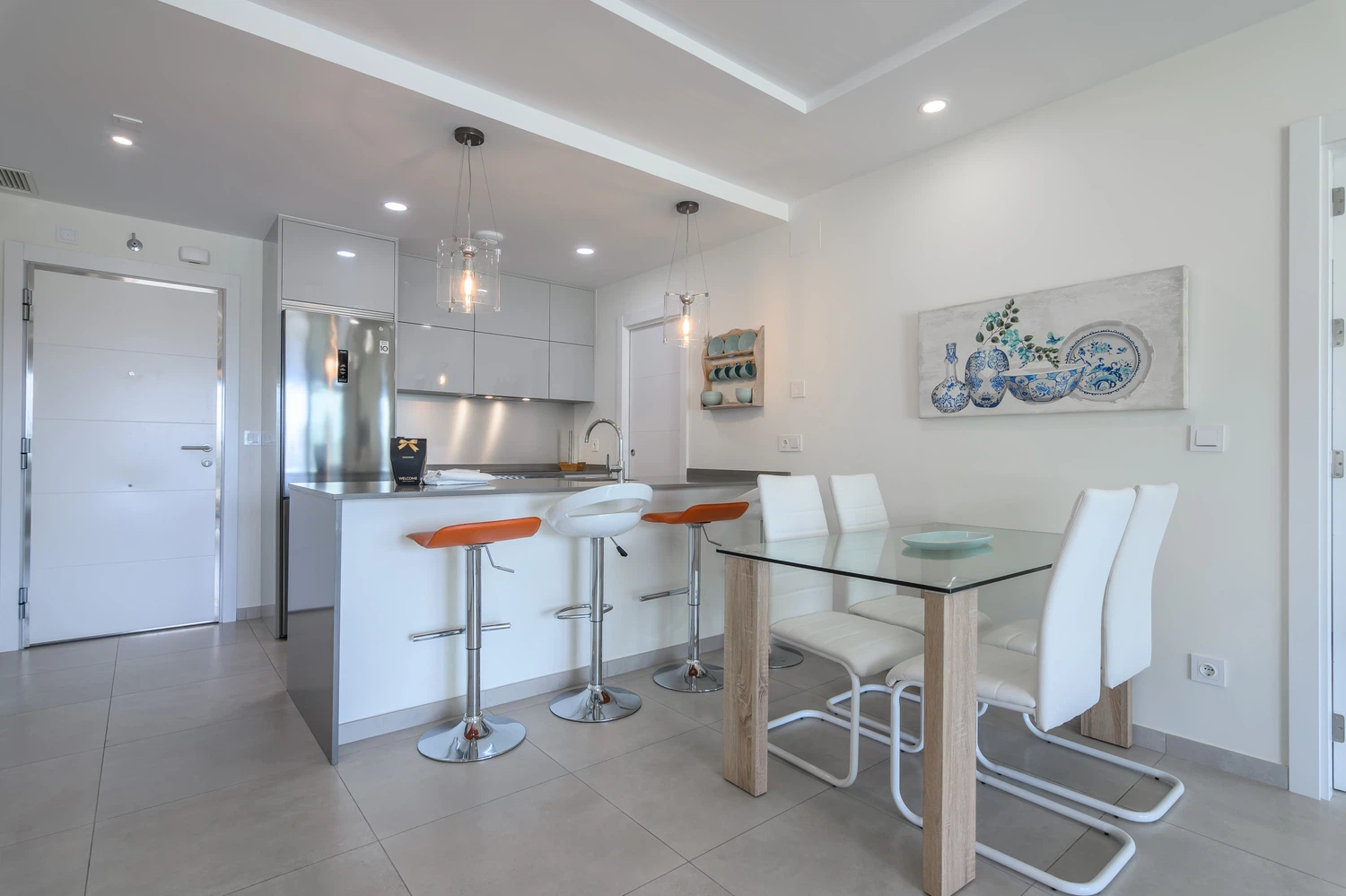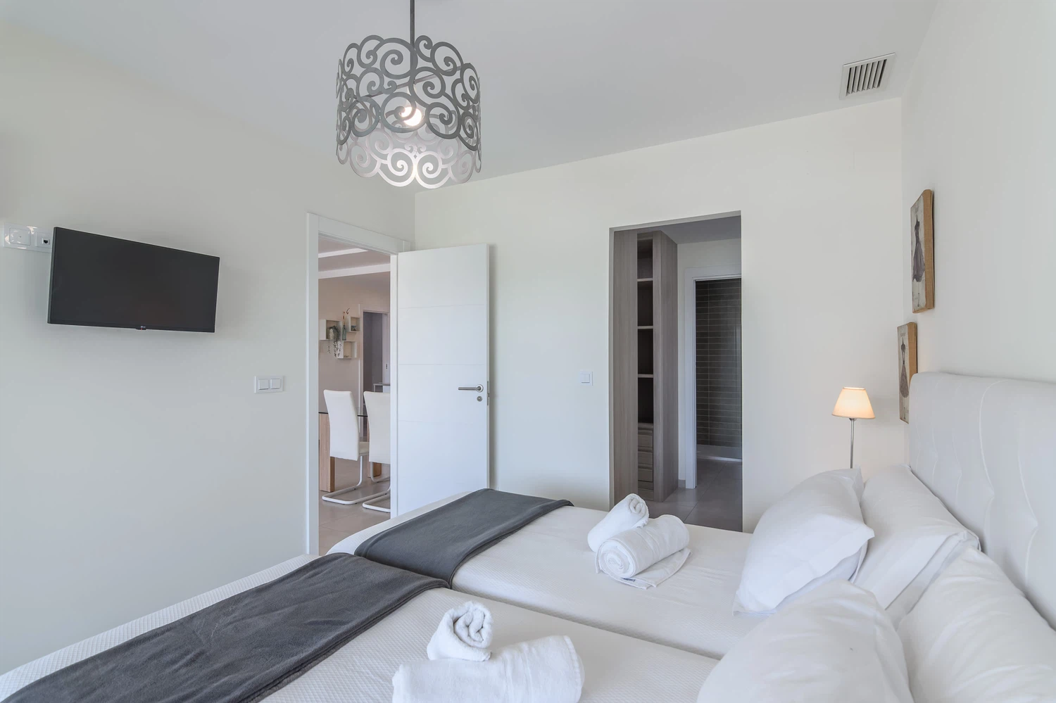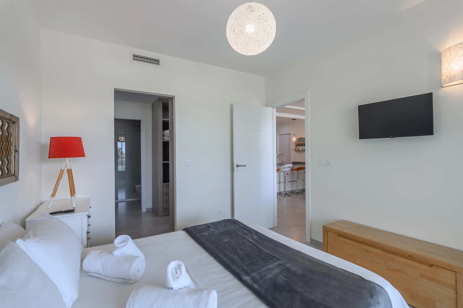 La cocina americana está totalmente equipada con electrodomésticos de última generación, incluyendo lavadora, secadora, lavavajillas, horno, microondas, cafetera, tostadora, y una amplia variedad de menaje. Aire acondicionado y bomba de calor aseguran una temperatura perfecta durante todo el año, mientras que la conexión WiFi y tres televisores mantendrán a todos entretenidos.