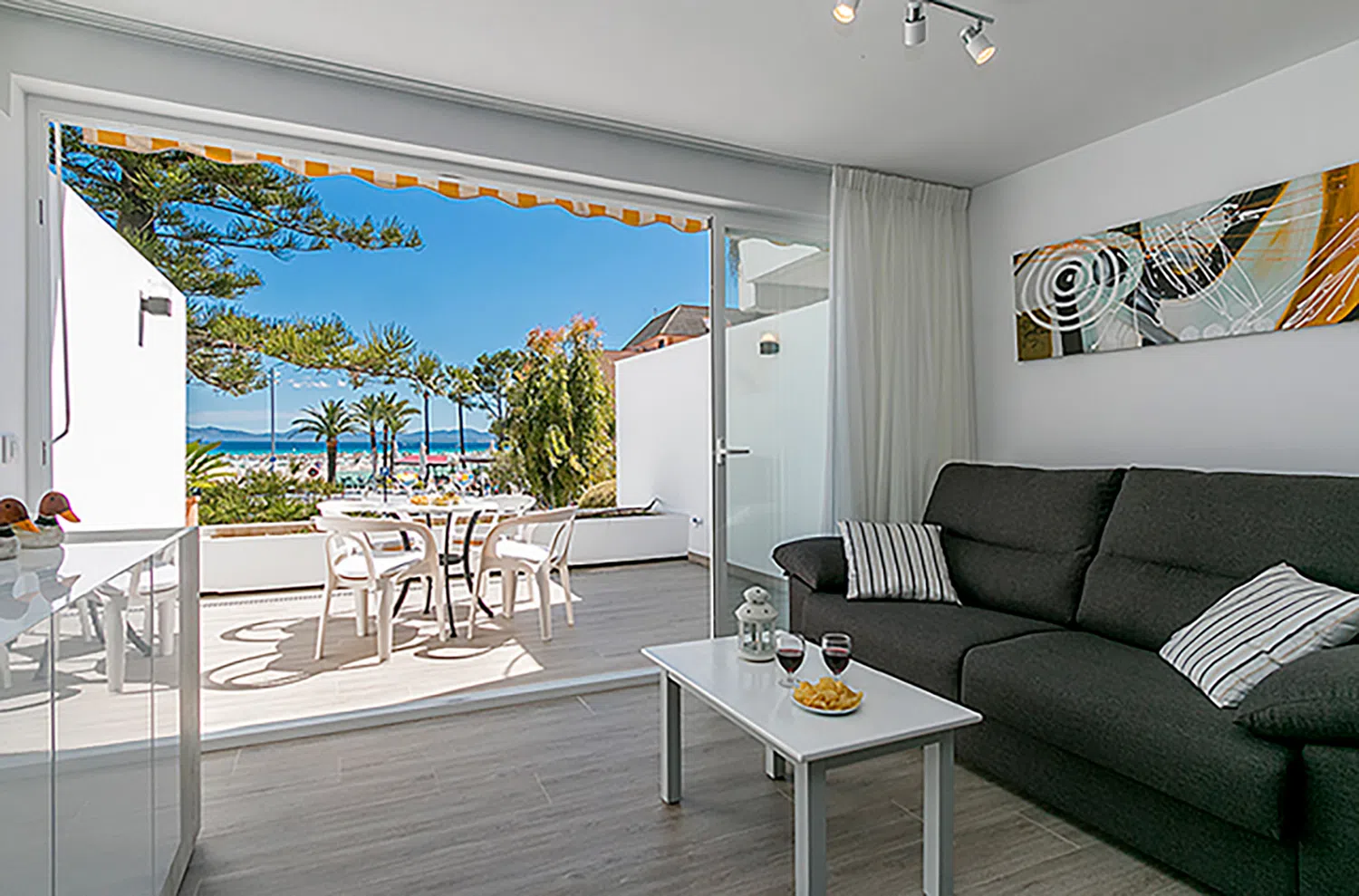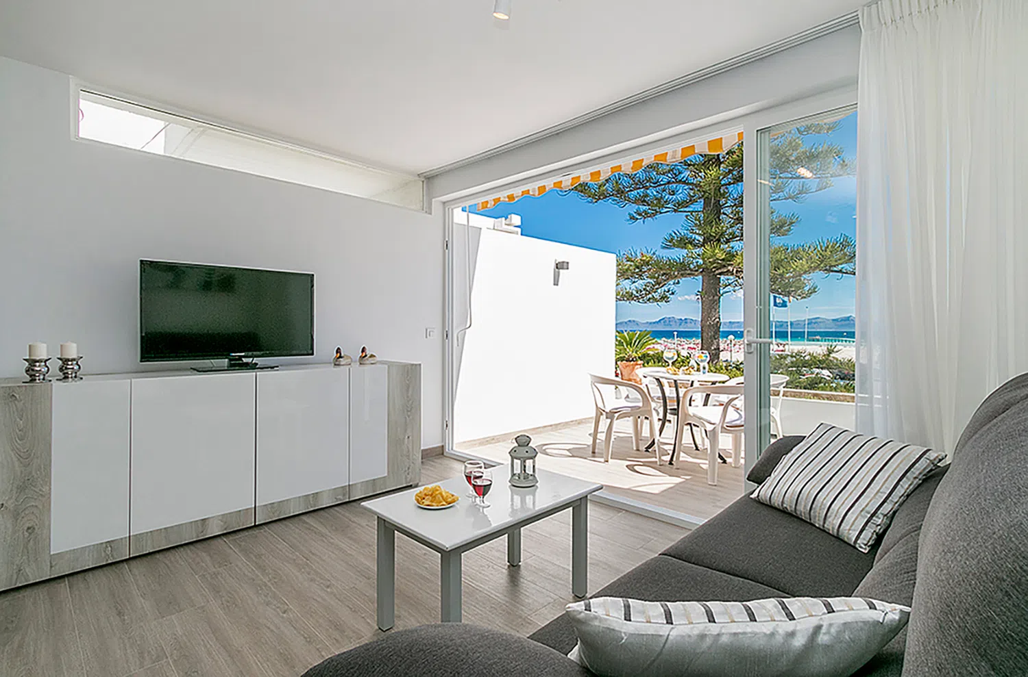 Un paraíso junto al mar. Este apartamento se encuentra en un enclave privilegiado, a solo unos pasos de las cristalinas aguas de la playa de Alcudia con más de 7 kilómetros de extensión. Una playa de fina arena blanca y aguas cálidas y tranquilas con zonas verdes de pino mediterráneo, dotada con todos los servicios: hamacas, sombrillas, baños y duchas públicas, actividades acuáticas, chiringuitos, bares y restaurantes a pie de playa, además de un paseo que recorre toda la bahía para disfrutar del entorno.