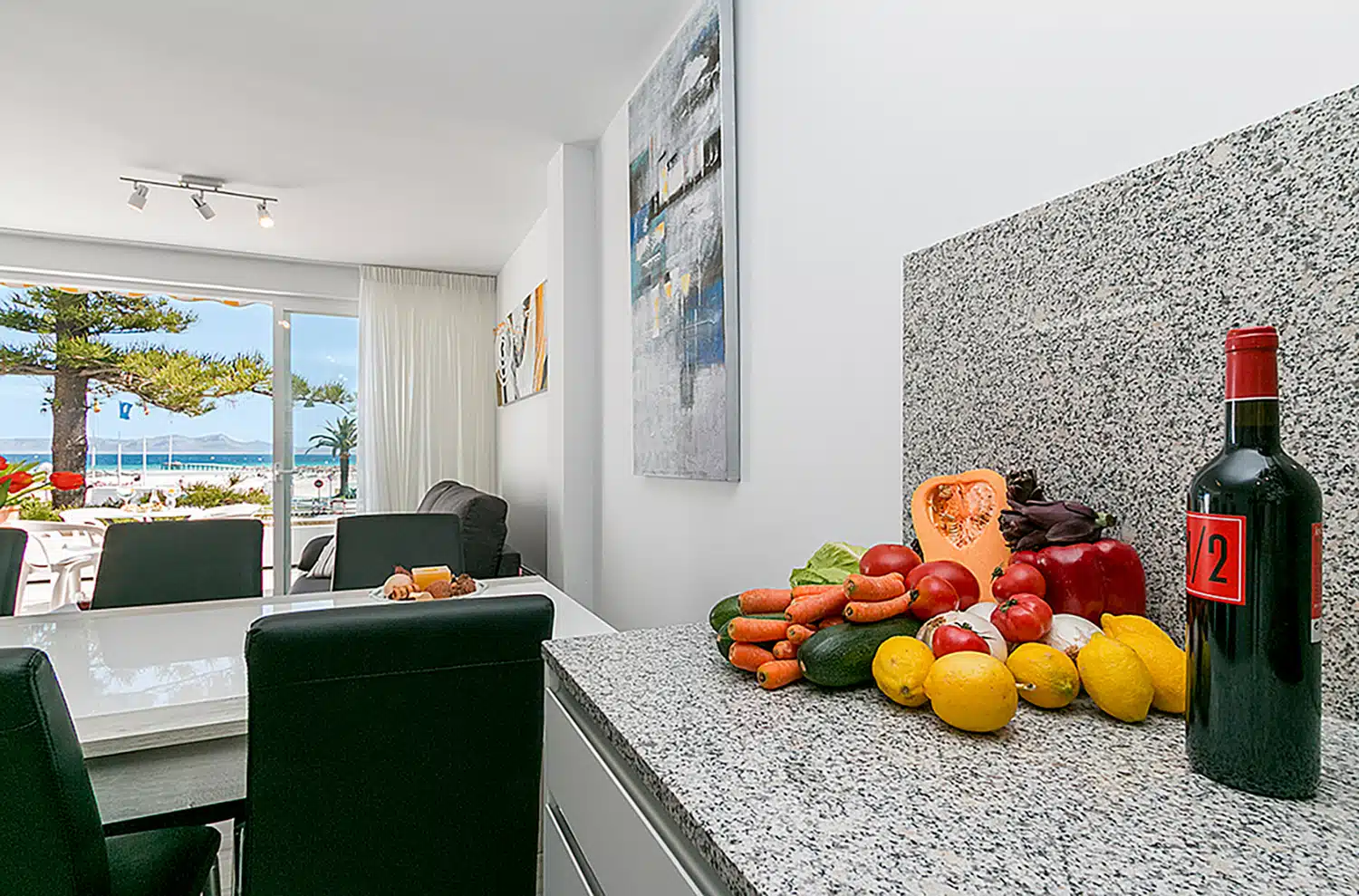 La vivienda está en 1ª planta, tiene una superficie de 98 m² y una capacidad máxima de hasta 6 personas. Es un alojamiento cómodo y acogedor y dispone de todo lo necesario para que disfrute de unas vacaciones excepcionales en Mallorca: cocina totalmente equipada abierta al amplio y luminoso salón comedor con un sofá cama doble y salida a terraza frente al mar, dos dormitorios; uno con una cama doble y el otro con dos camas individuales, baño completo con gran ducha, aire acondicionado frío-calor, TV satélite y conexión a internet Wifi.