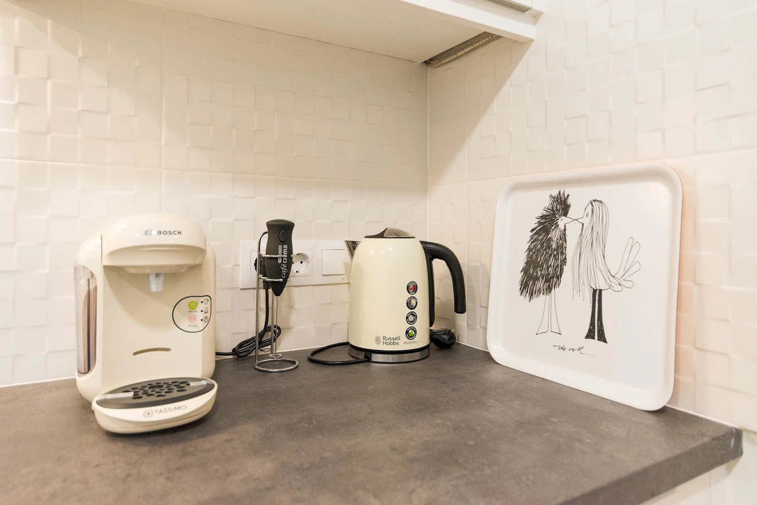 La cocina americana, de vitrocerámica, está equipada con nevera, microondas, horno, congelador, vajilla/cubertería, utensilios/cocina, cafetera y tostadora.