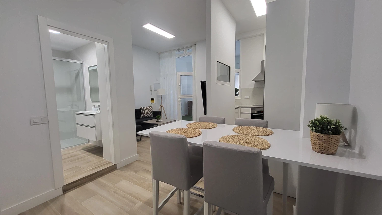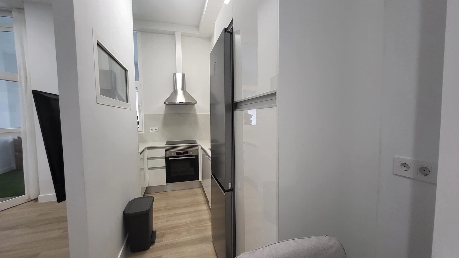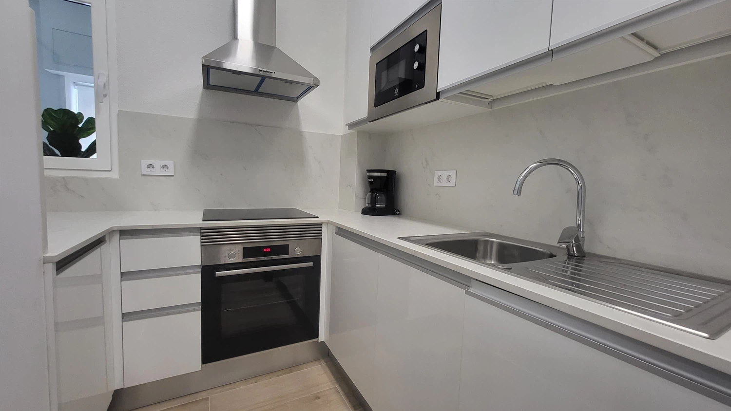 La cocina independiente está totalmente equipada con electrodomésticos de última generación, incluyendo cocina de inducción, nevera, congelador, lavadora, horno, microondas, cafetera, tostadora, hervidor, exprimidor y una completa dotación de menaje y utensilios de cocina. Esto permite a los huéspedes preparar comidas y disfrutar de momentos gastronómicos en el apartamento.