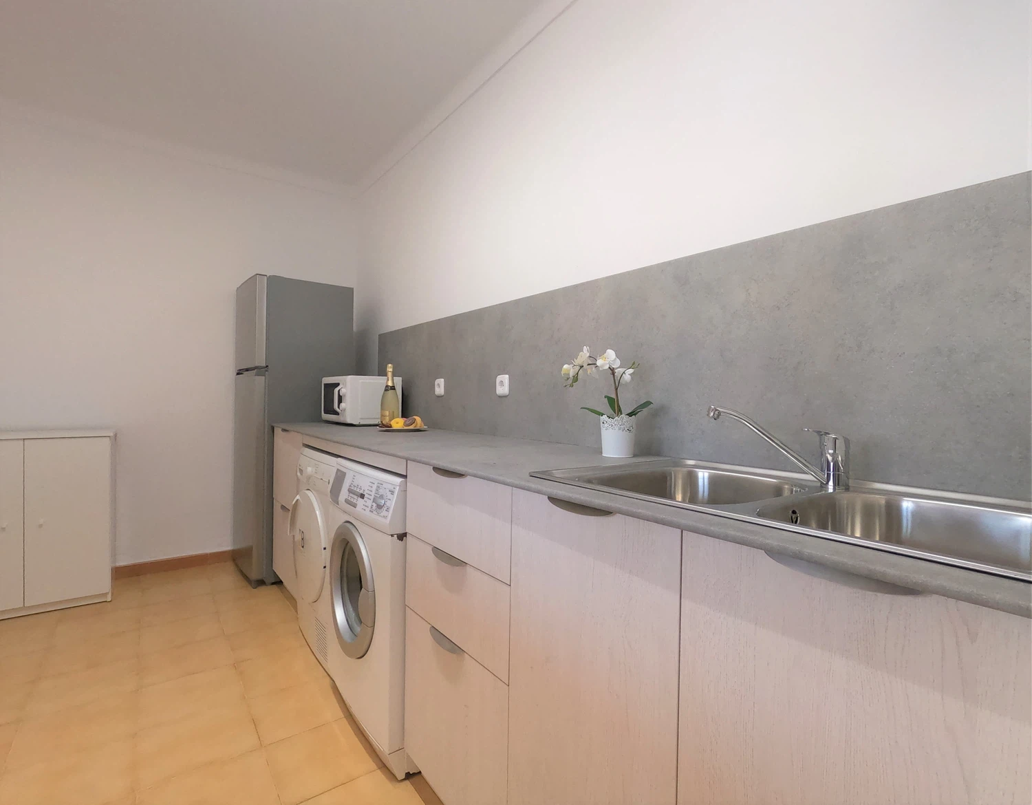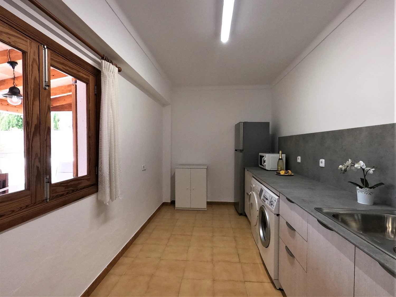 La casa, que cuenta con dos plantas, tiene en la planta baja una pequeña cocina con acceso a la terraza y al área de la piscina, equipada con frigorífico-congelador, fregadero, microondas y encimera para una mayor comodidad.