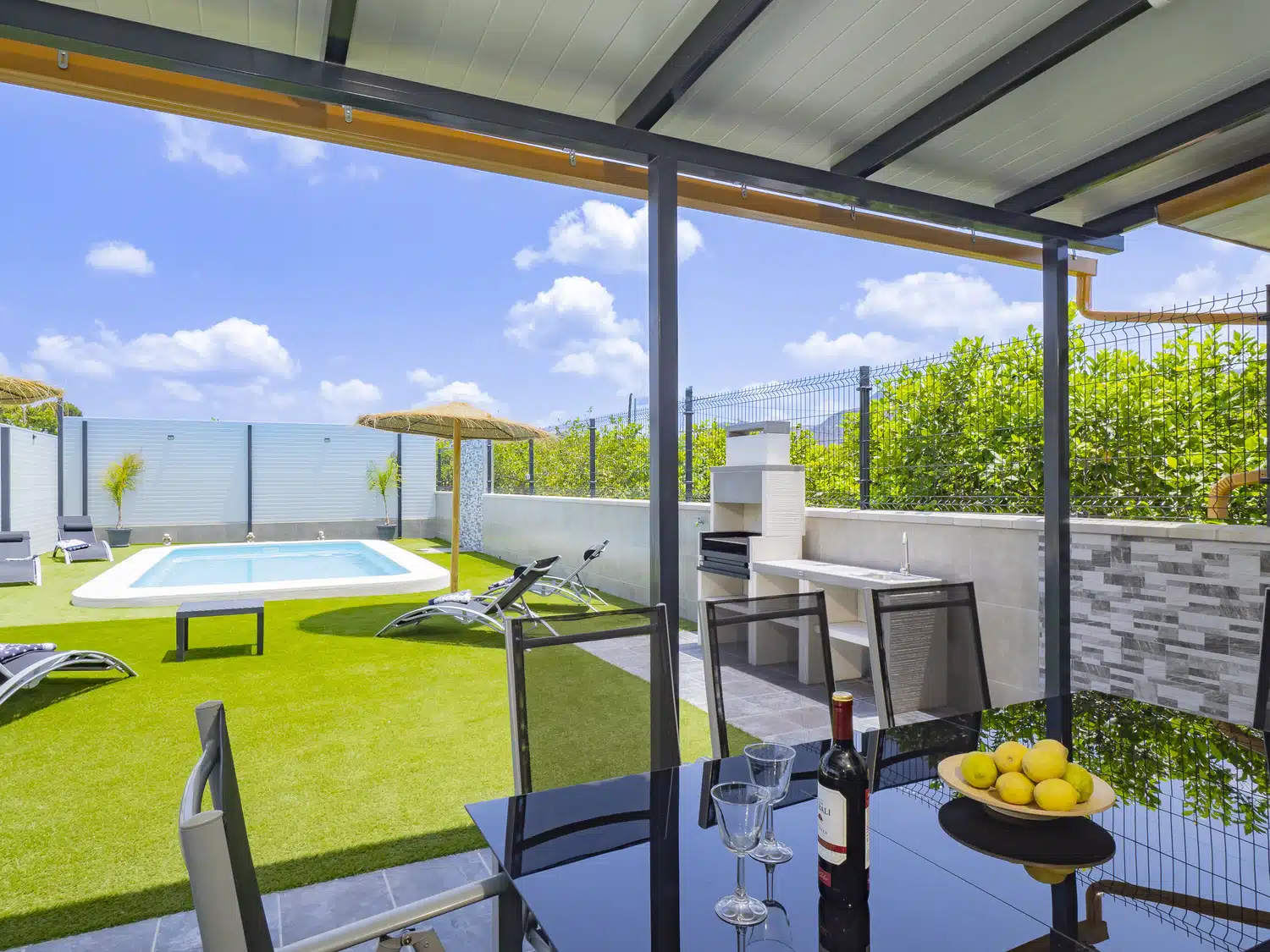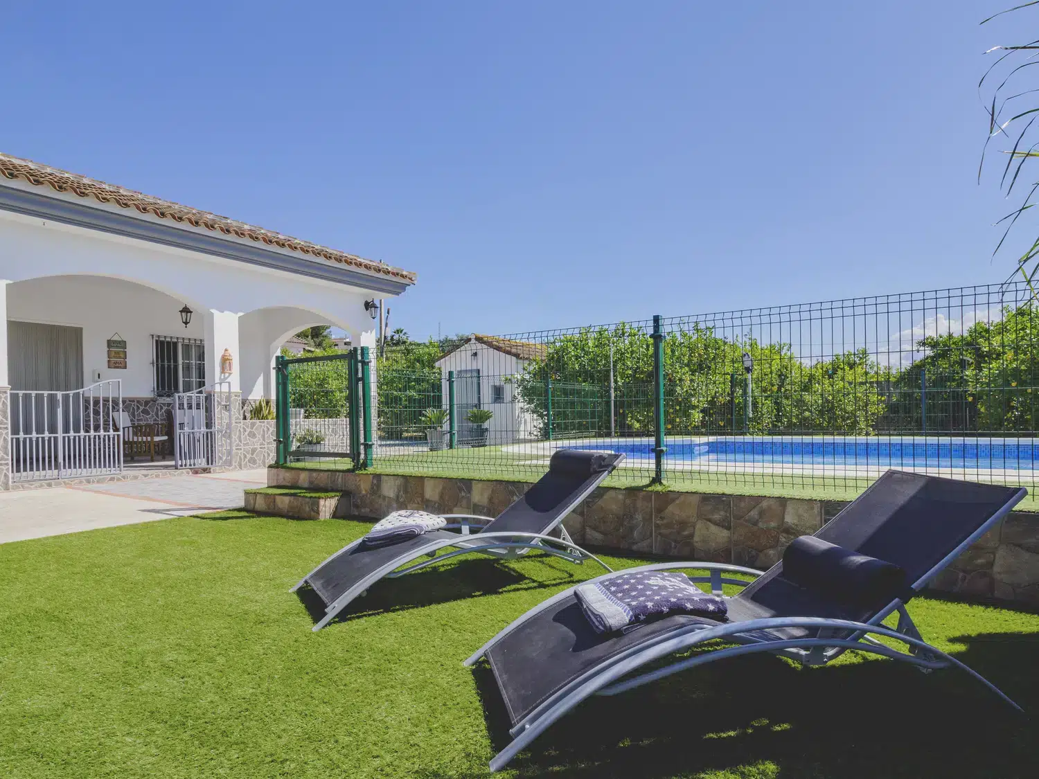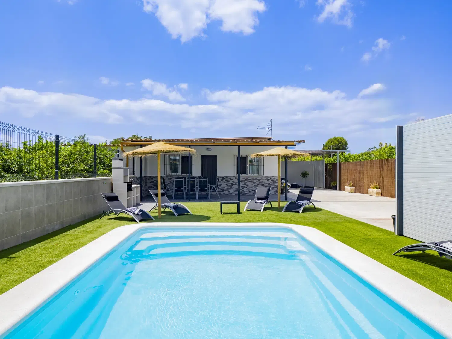 En el exterior, disfrutarás de dos piscinas privadas de agua salada y valladas, zonas ajardinadas con hamacas, amplias terrazas, barbacoa y espacios ideales para comidas al aire libre o relajarte mientras los más pequeños se divierten. Además, hay baños exteriores para mayor comodidad. 🏊♂️🍽️🌞