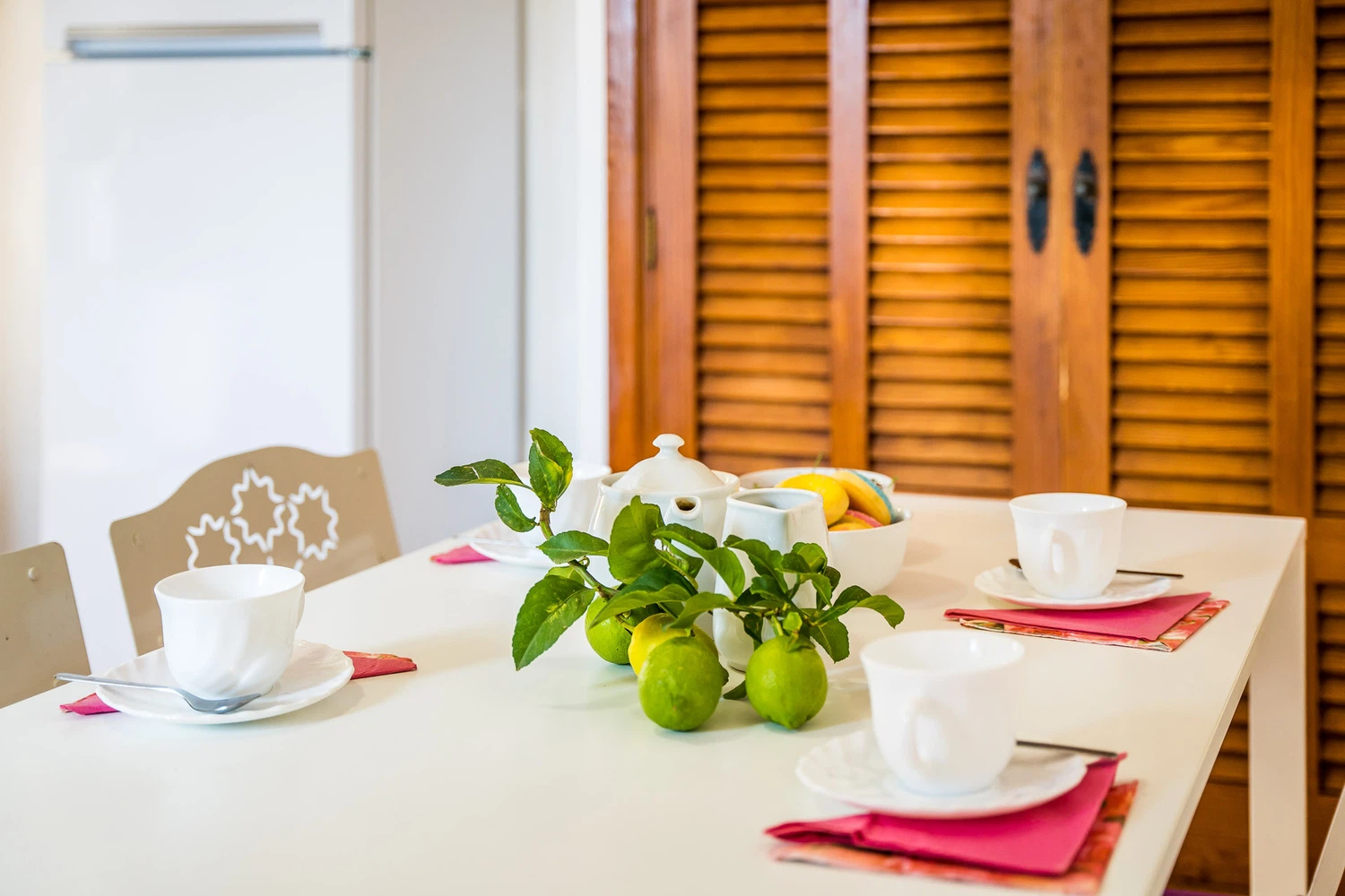 El salón-comedor es amplio y acogedor, equipado con TV vía satélite, WiFi y cómodos sofás, un espacio pensado para relajarse tras un día explorando la isla. La cocina, completamente equipada, incluye lavavajillas, horno, microondas, cafetera y todo lo necesario para cocinar.