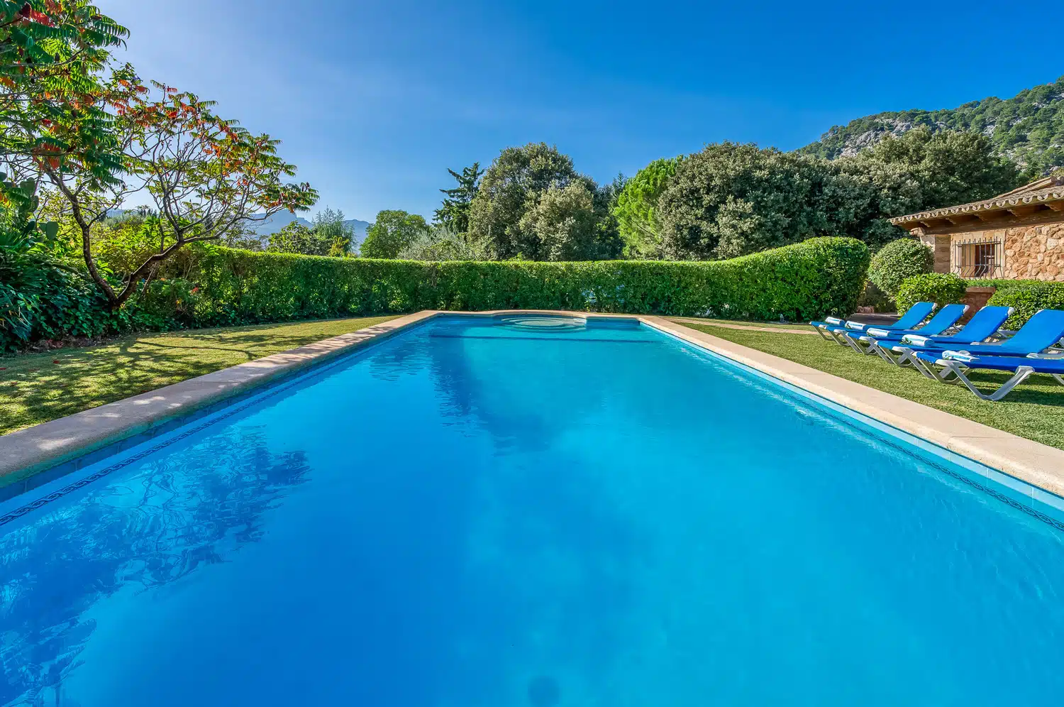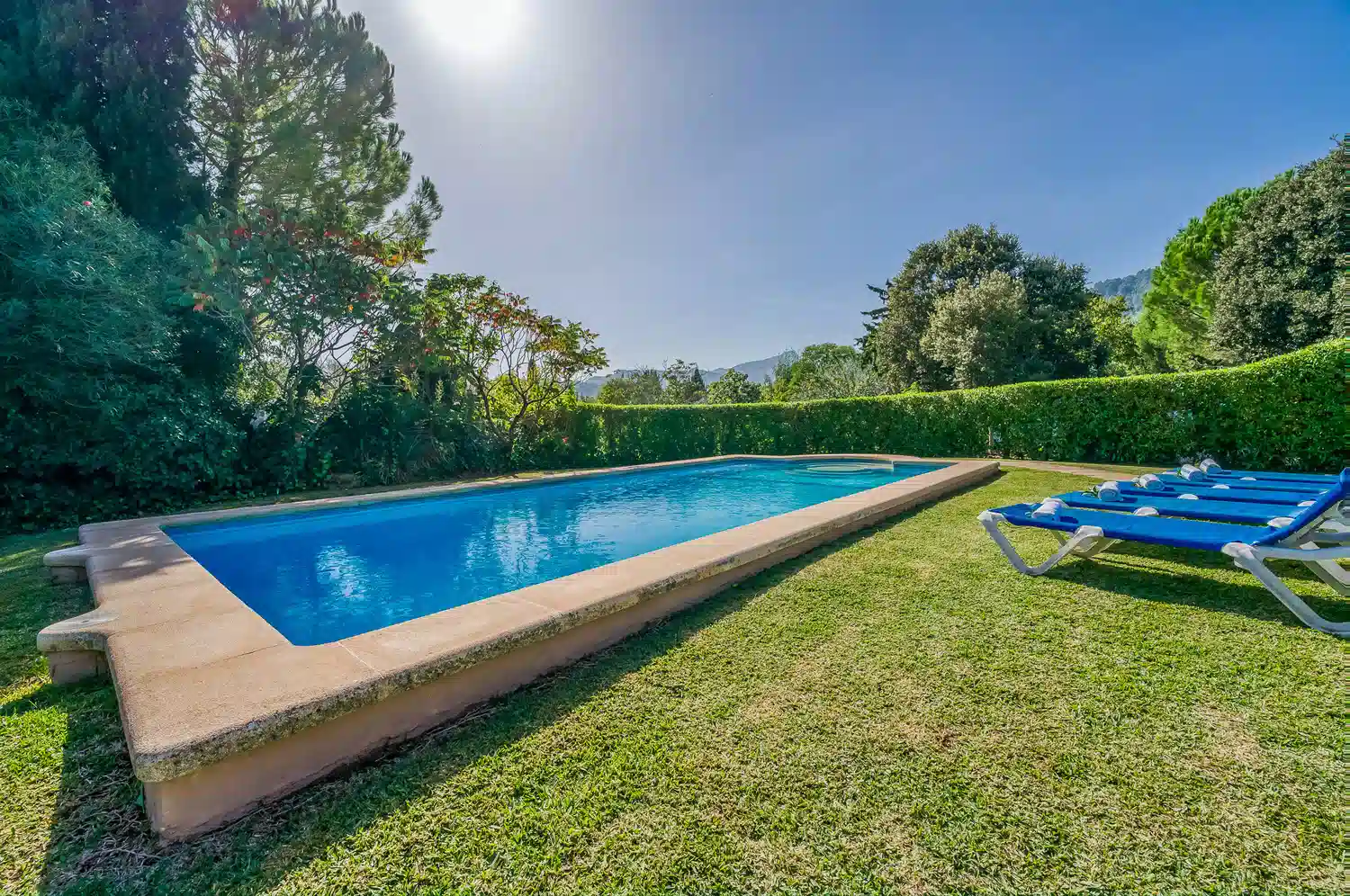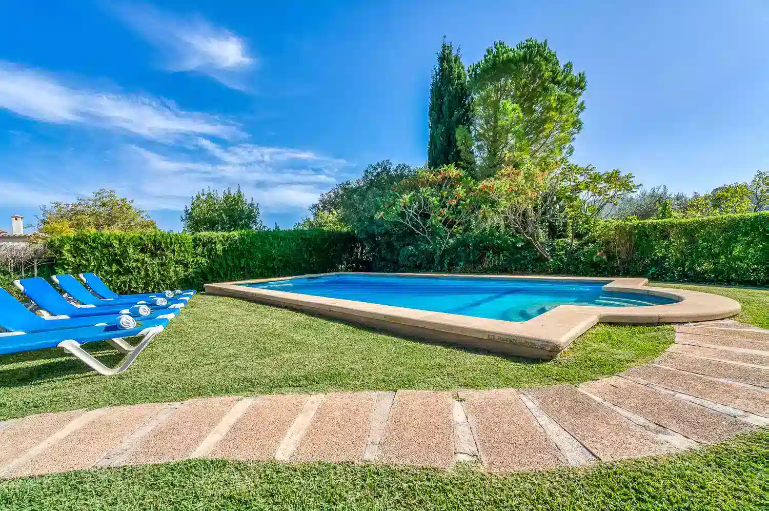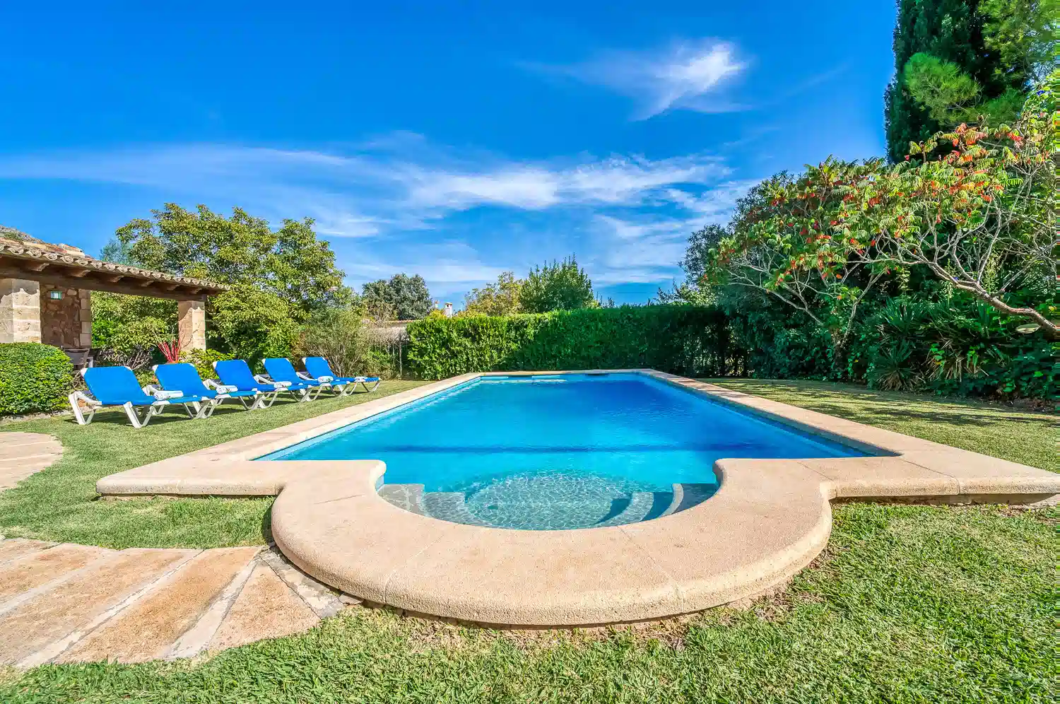 La finca cuenta con una amplia piscina privada de 10 x 5 metros, rodeada por un extenso jardín con seis tumbonas, ideales para relajarse bajo el sol mediterráneo. El lugar perfecto para disfrutar de días interminables al aire libre con familia o amigos.